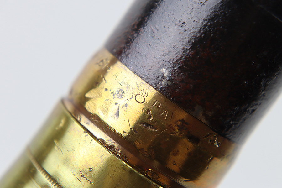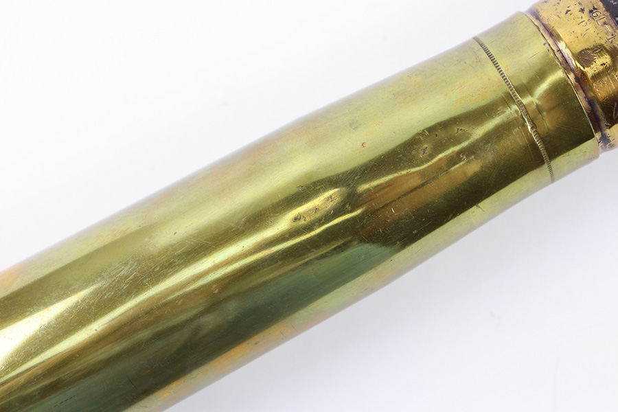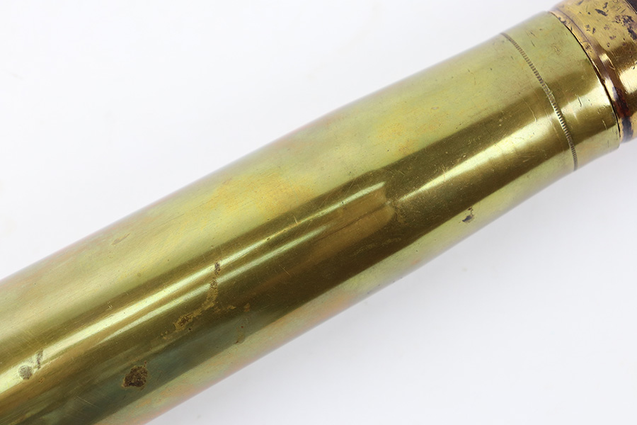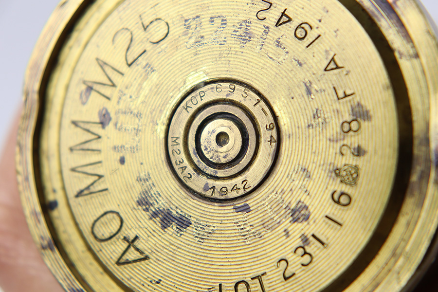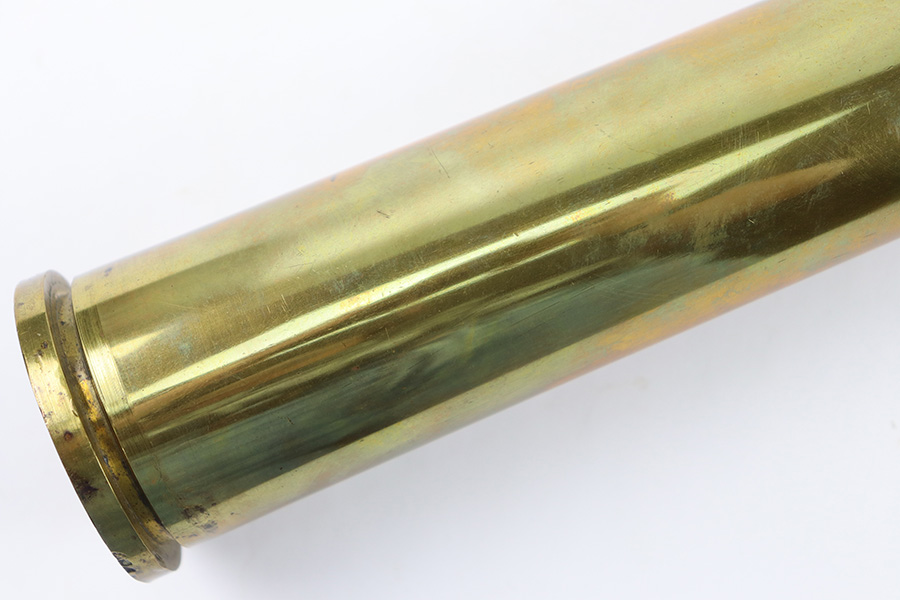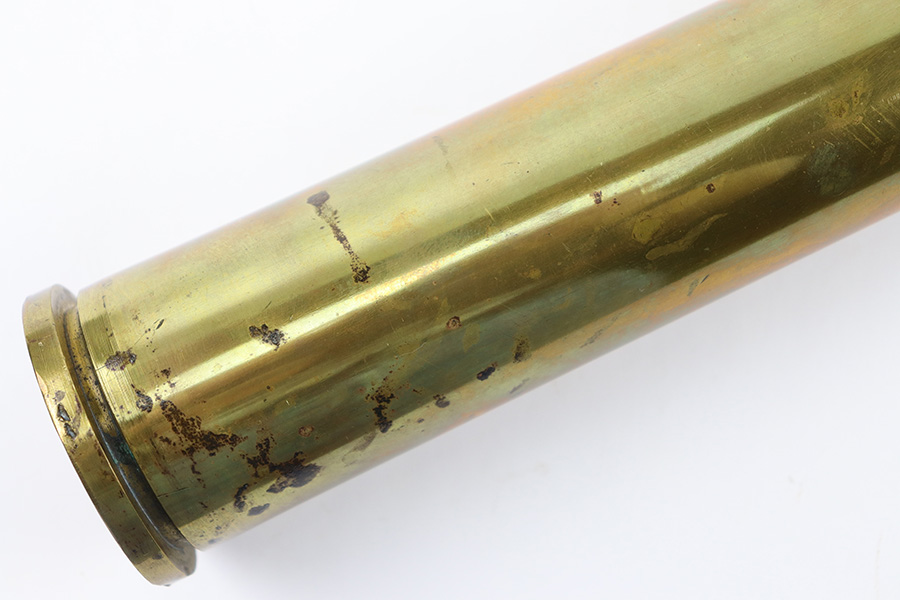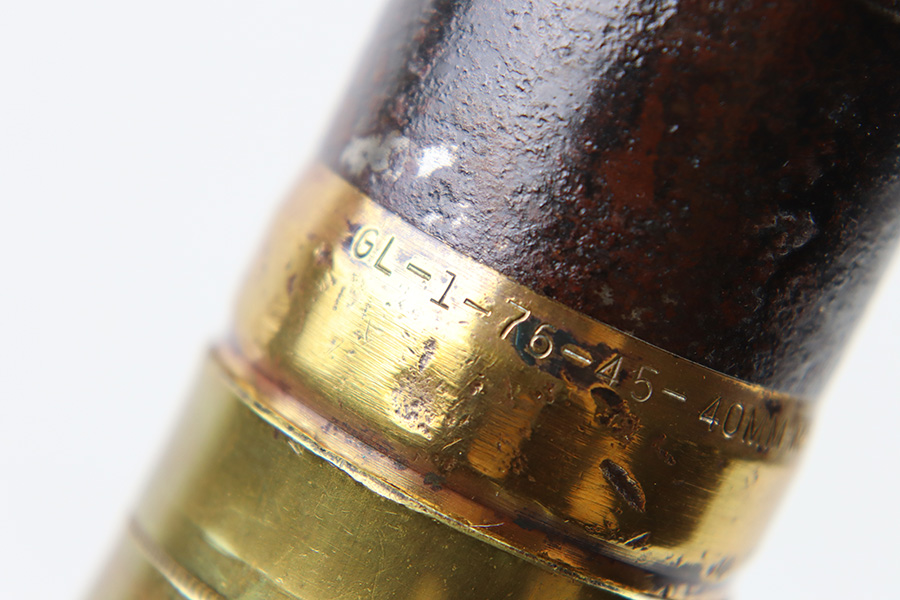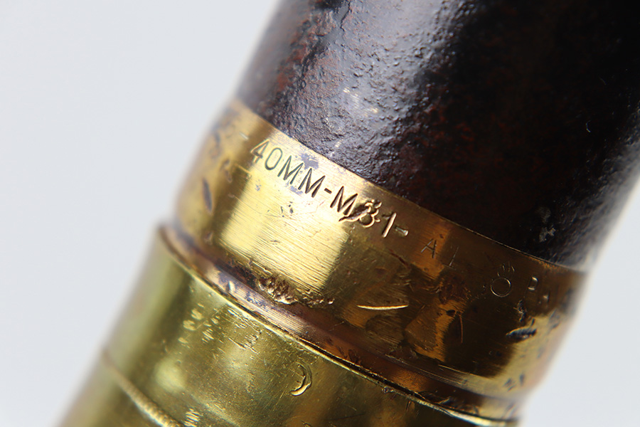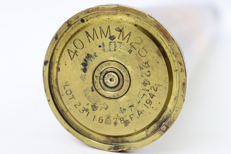 10/27/23 – This is an original 1942 dated M25 40mm Anti-Aircraft round by Frankford Arsenal. The round casing is in great overall condition with some small spots of discoloration. Head-stamped with a military cartouche, maker code, date, and “40MM M25” designation. Total length is 17.5 inches.