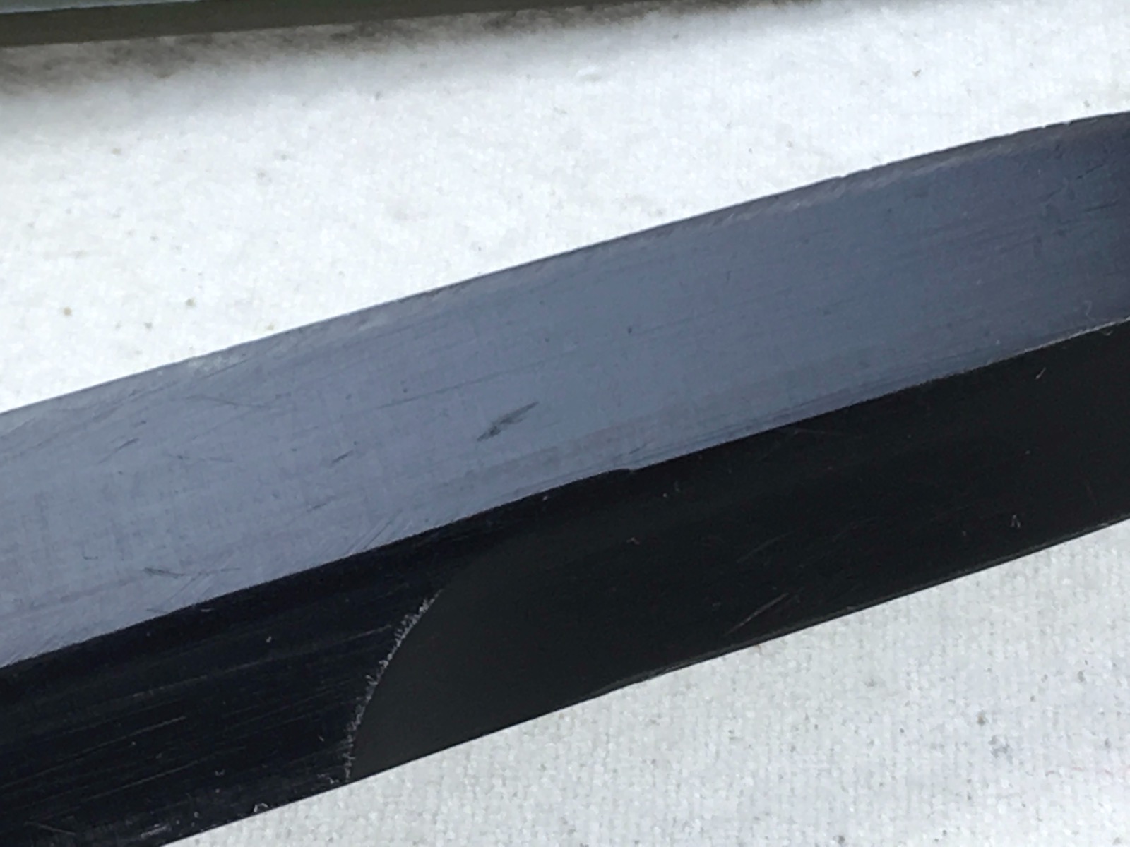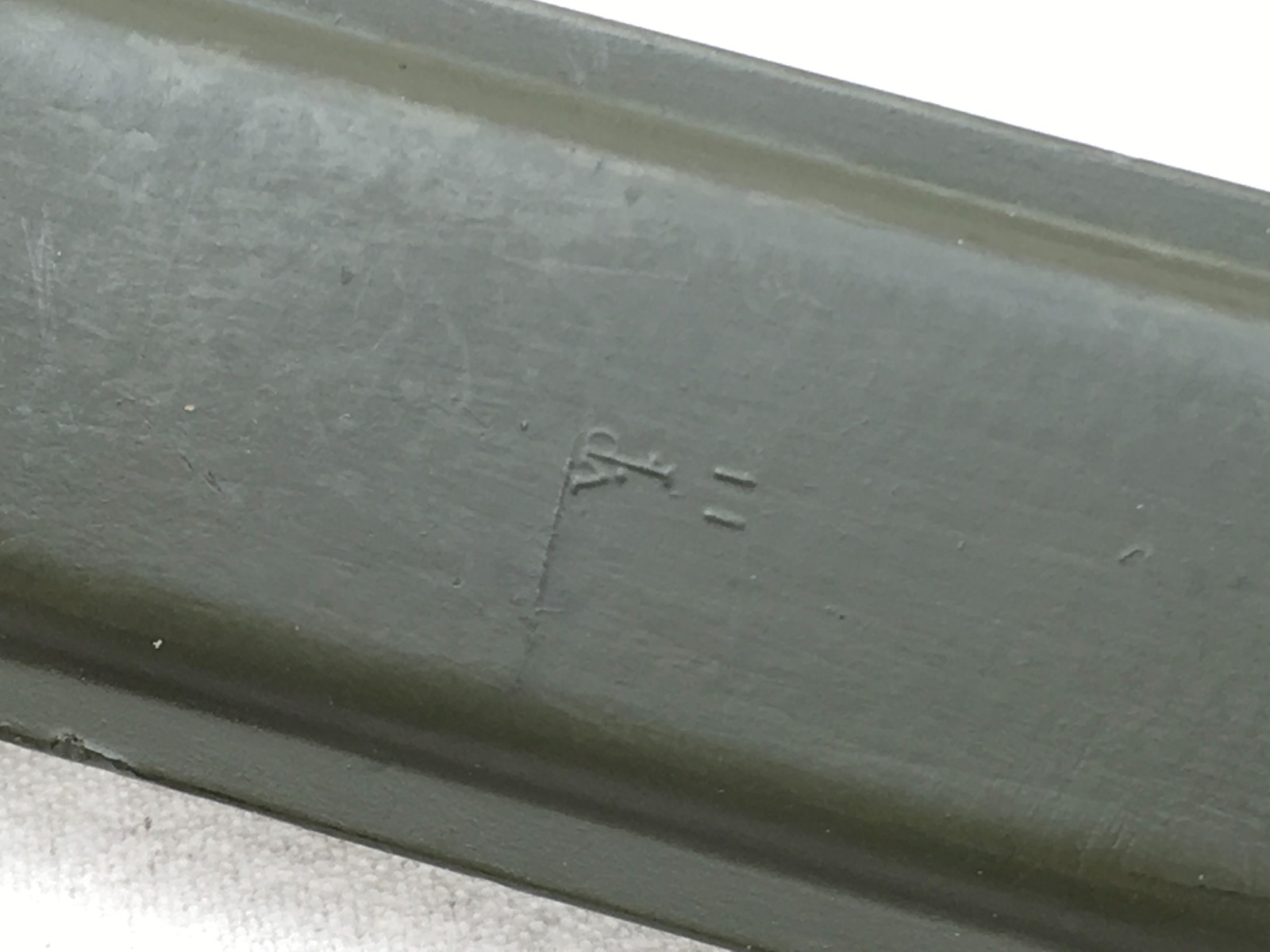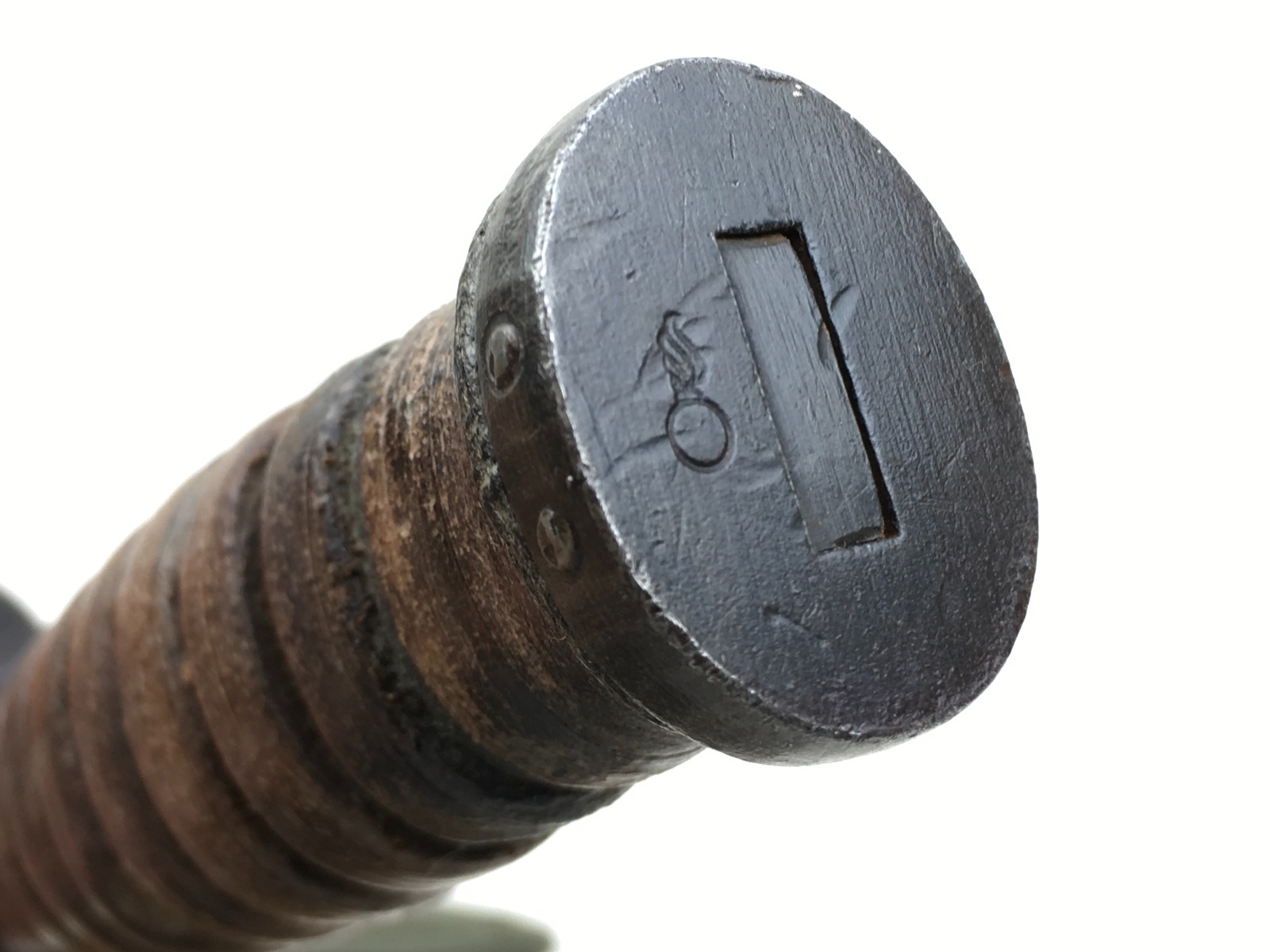 2/26/19 – This is an original USM3 Camillus Fighting Knife from WW2. The blade is maker stamped “CAMILLUS” and US M3. The bluing on the blade is about 95% and there’s no signs of sharpening. The handle is in good condition with minor wear and a tiny piece missing from the leather. A distinct flaming bomb ordnance stamp is on the pommel. The cross guard wiggles slightly, however, it is secure. The M8 scabbard is the 1st variation with a short frog and no belt hooks.