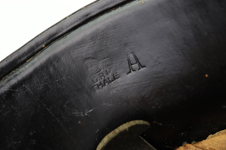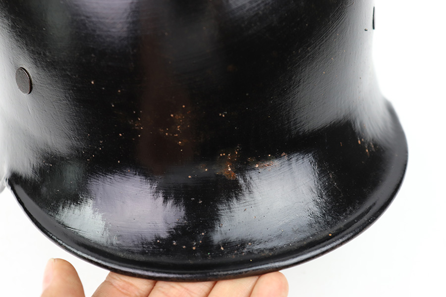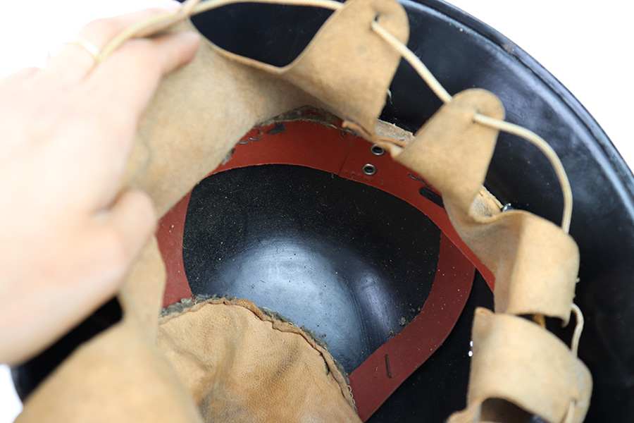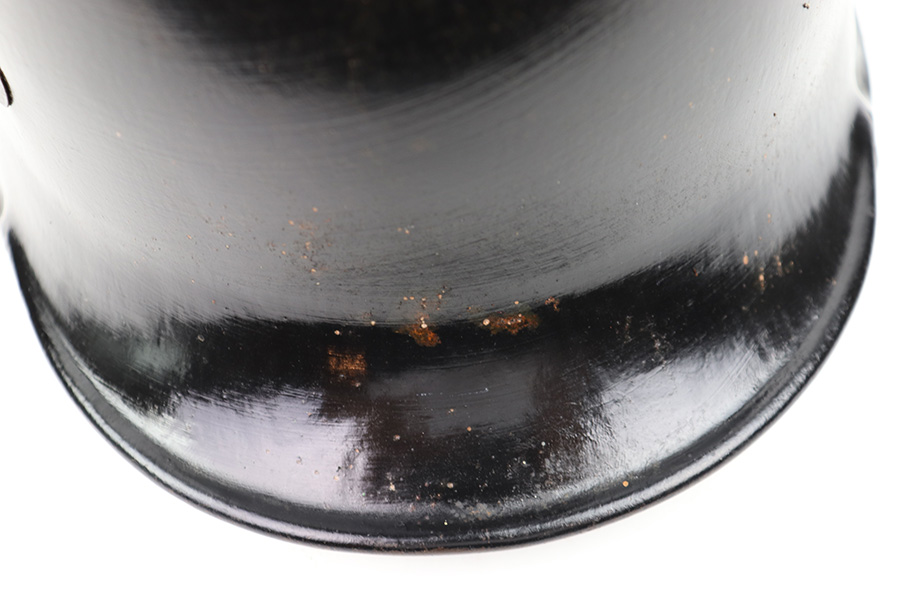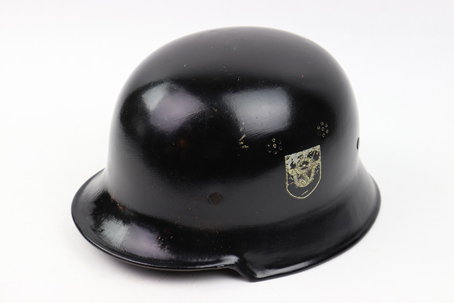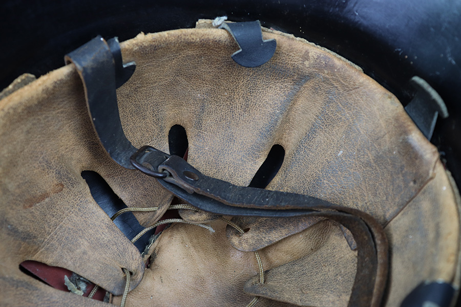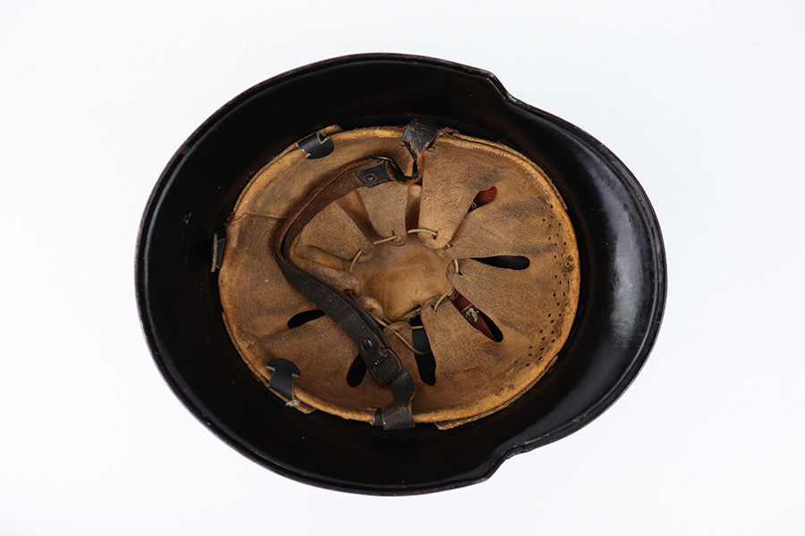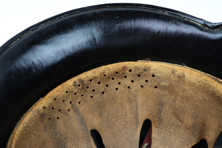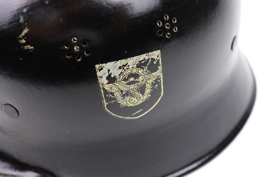 7/27/22 – This is an original double decal Civil Police M34 helmet from WW2. The exterior shell has very nice black paint throughout and no dents or major issues. The police logo is in about 70% condition with some discoloration and surface scuffs, while the nazi shield logo is about 80-85% with some mild paint loss. The interior leather liner is excellent with the original leather chin strap still intact as well. The interior shell is maker stamped as shown. A very nice overall example.