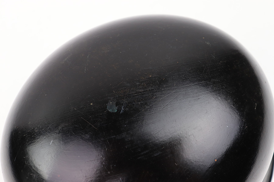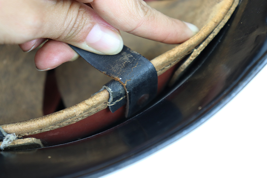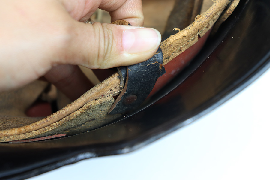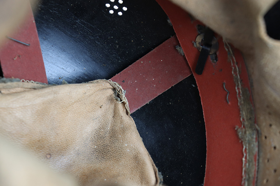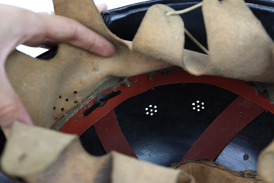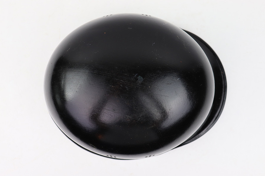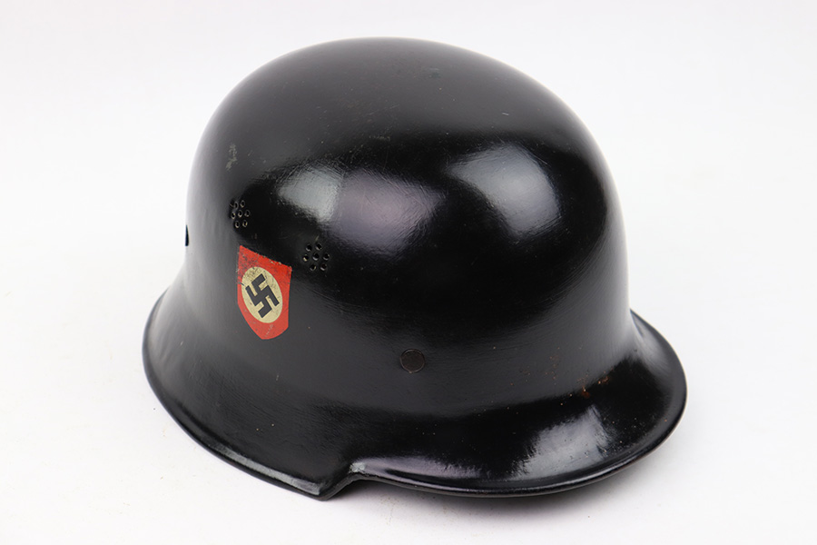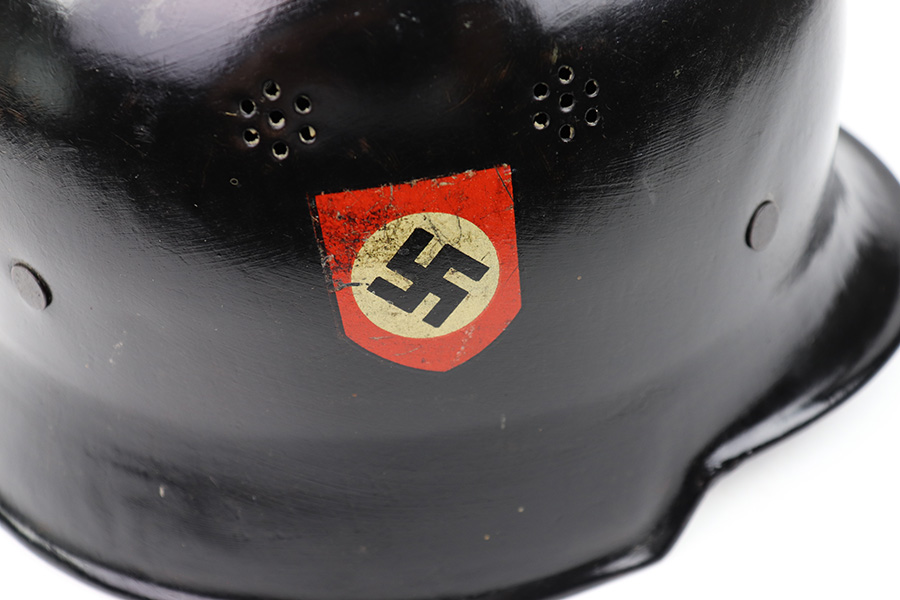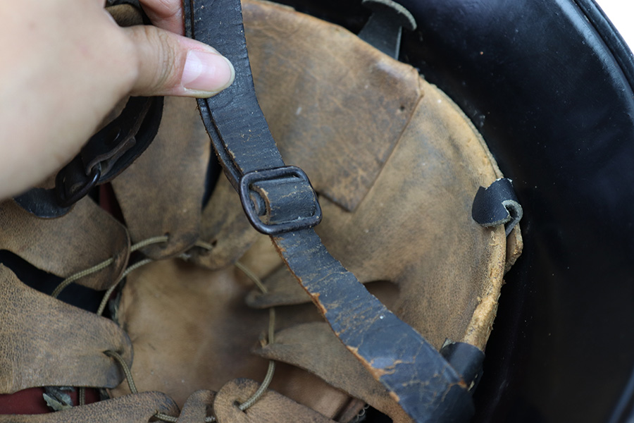 7/27/22 – This is an original double decal Civil Police M34 helmet from WW2. The exterior shell has very nice black paint throughout and no dents or major issues. The police logo is in about 70% condition with some discoloration and surface scuffs, while the nazi shield logo is about 80-85% with some mild paint loss. The interior leather liner is excellent with the original leather chin strap still intact as well. The interior shell is maker stamped as shown. A very nice overall example.