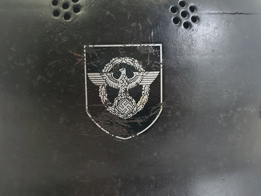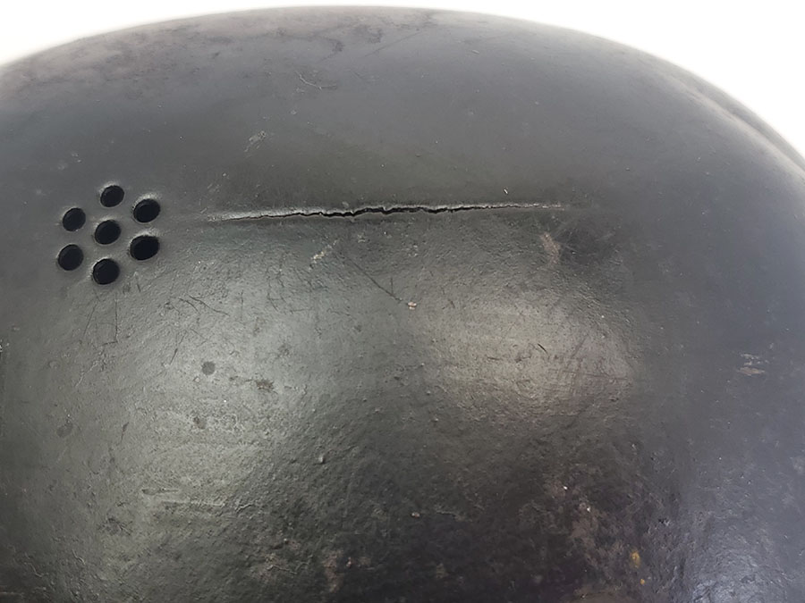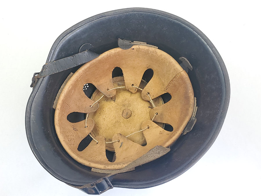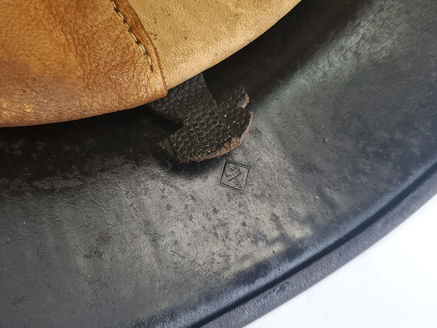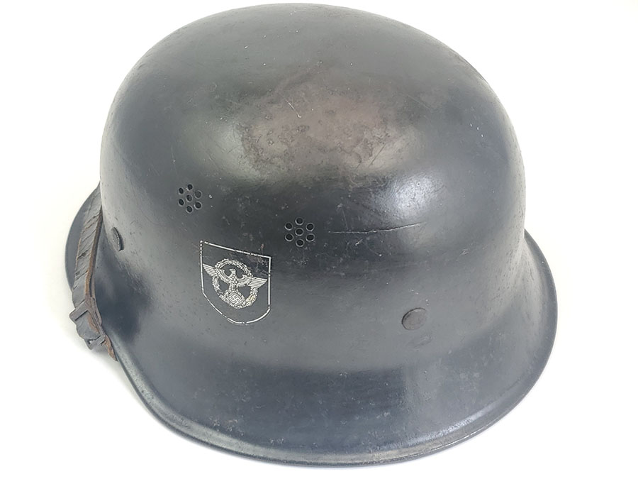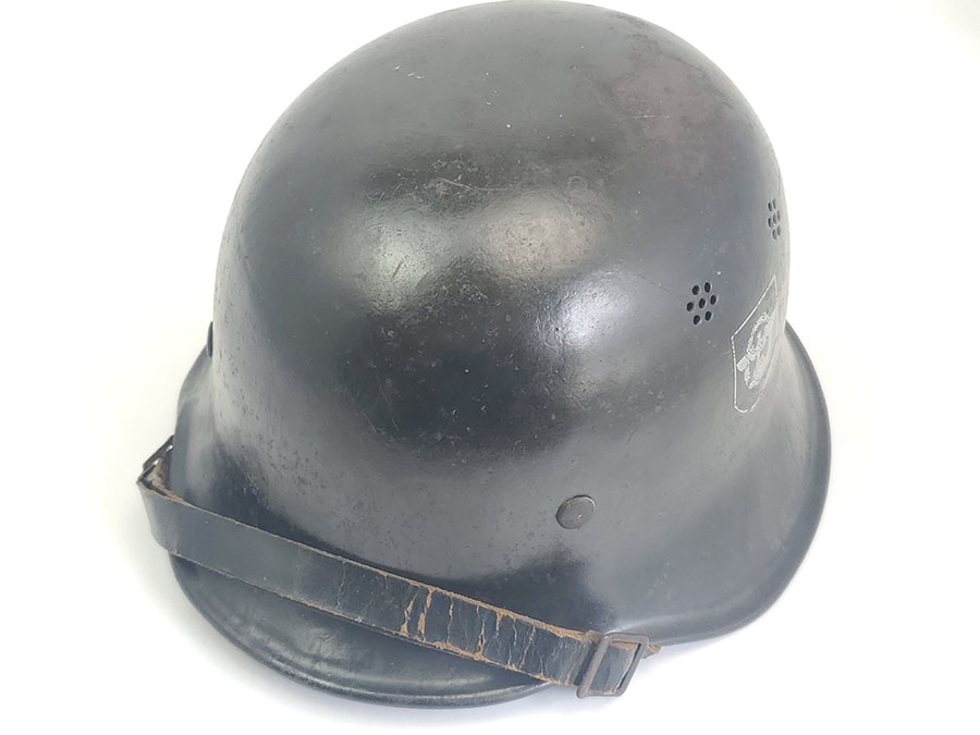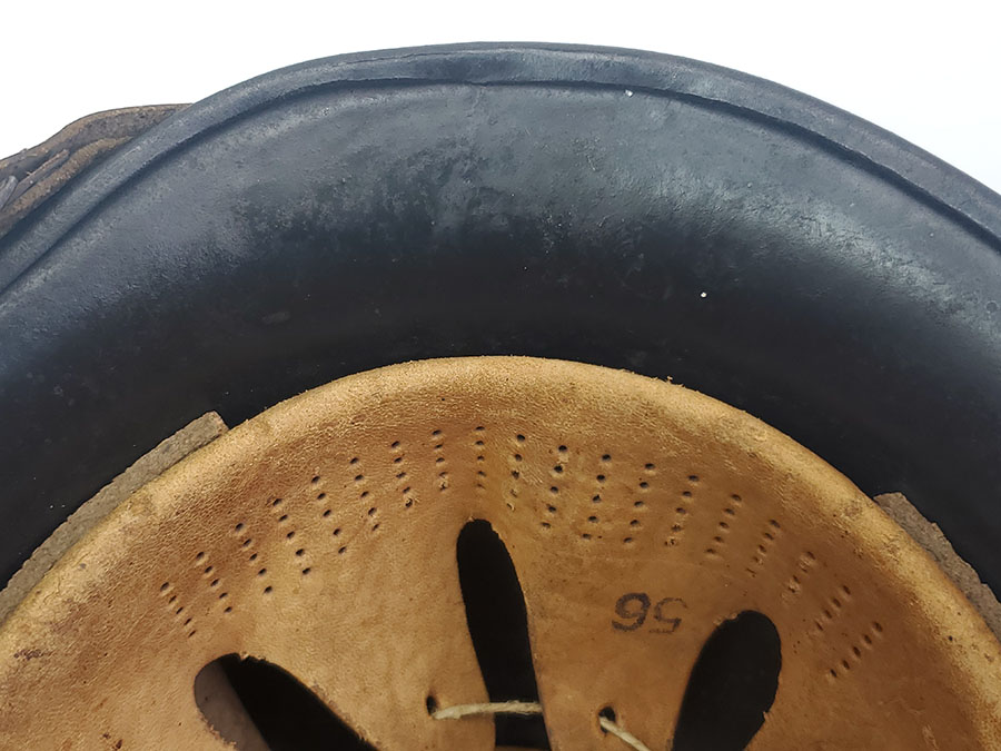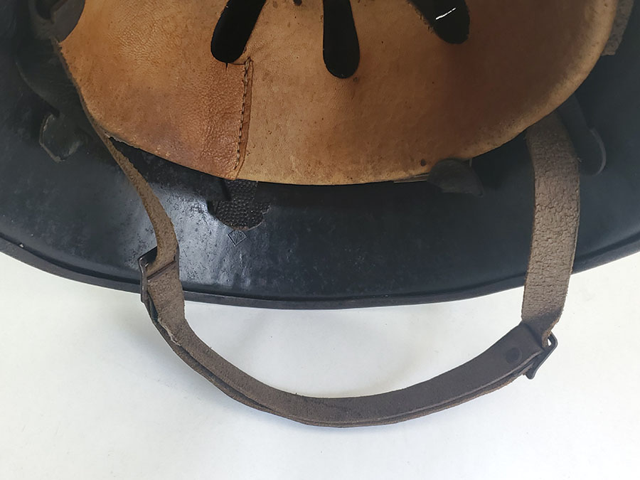 7/15/20 – This is an original M34 police helmet from WW2. The helmet is in great condition with two decals on either side of the exterior. Both decals have about 85-90% of the paint in tact. The helmet has some patina throughout the shell, and there is a crack along one side of the shell, as shown in photos. The interior is very clean, and excellent overall with minor wear and aging. The interior of the shell only has one small stamp as shown. The original leather chin strap has some surface cracking but is completely in tact.