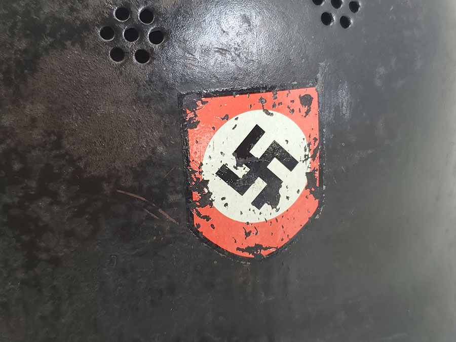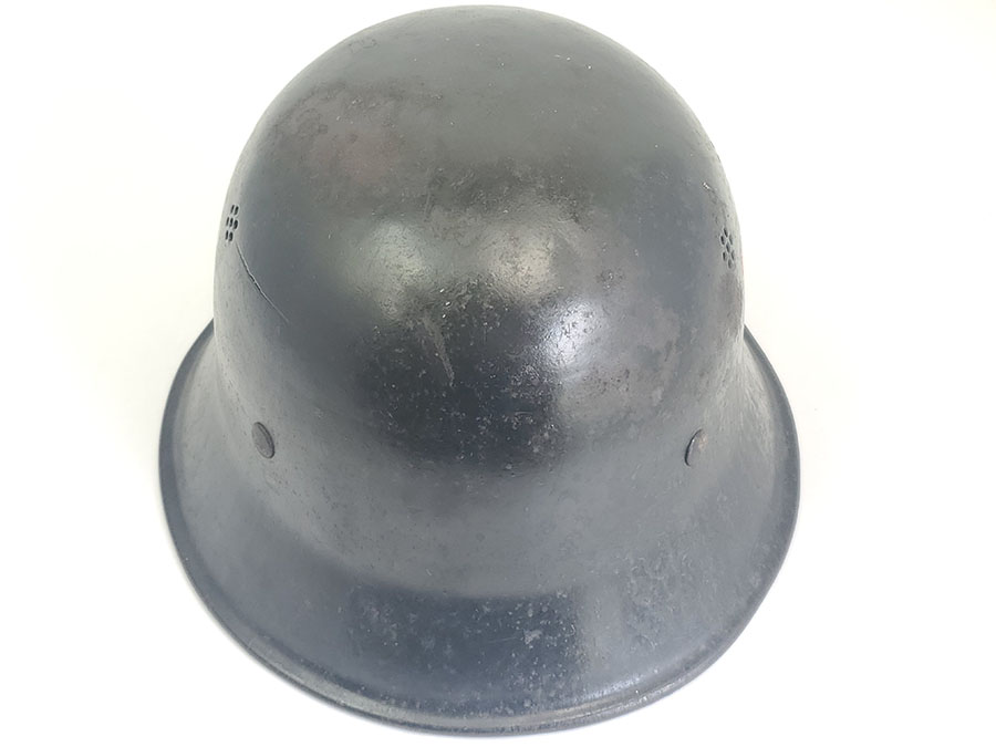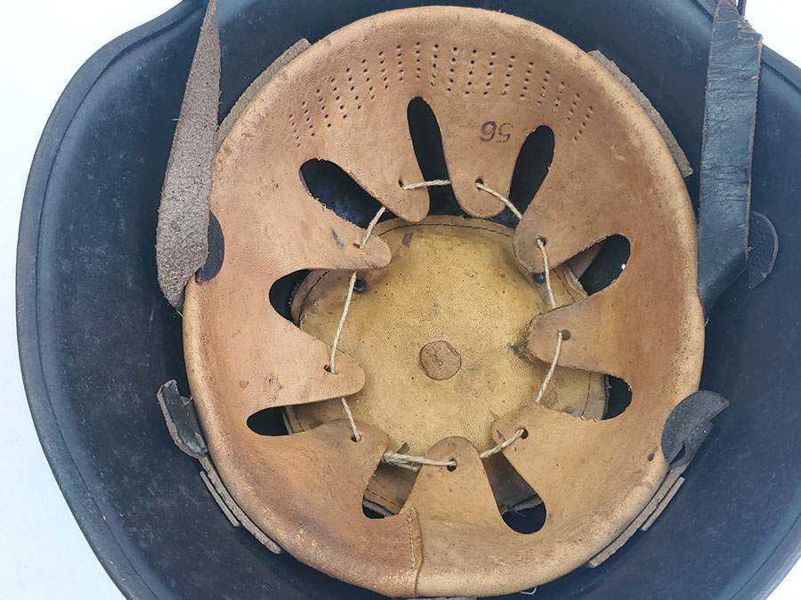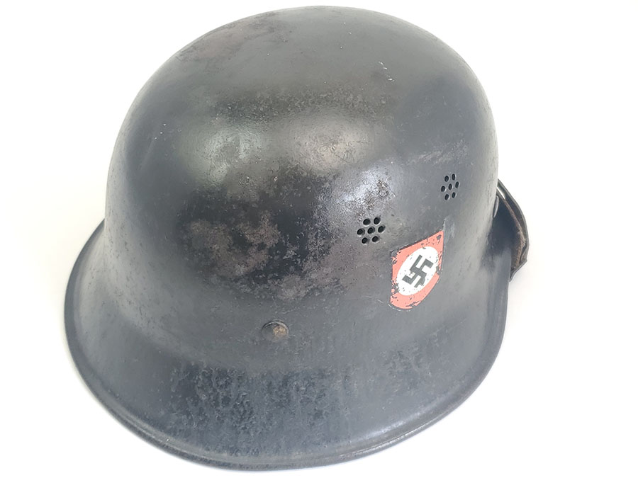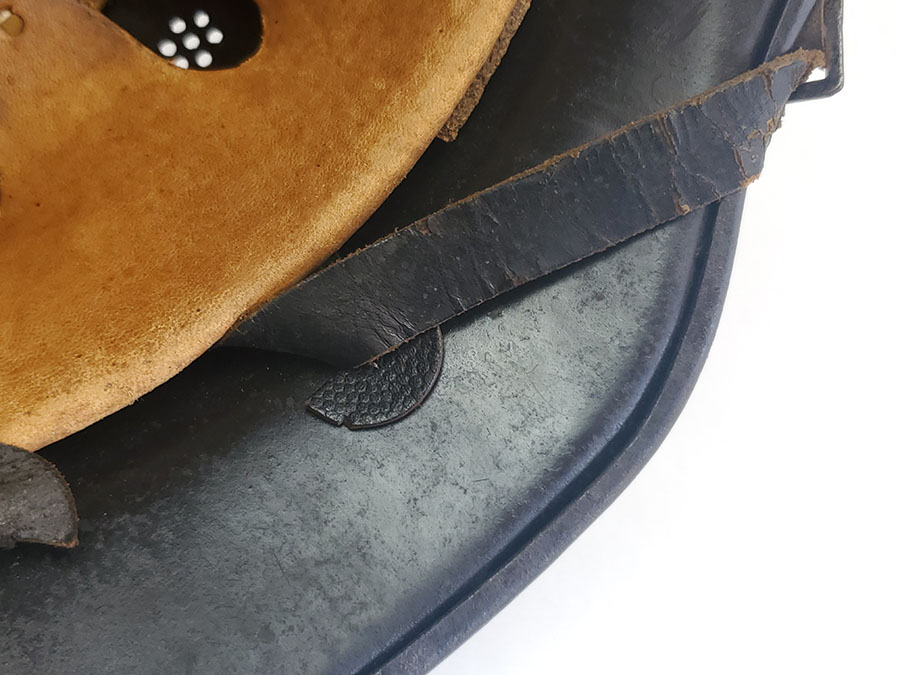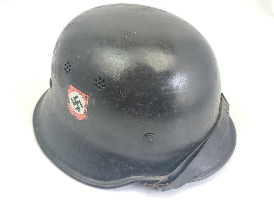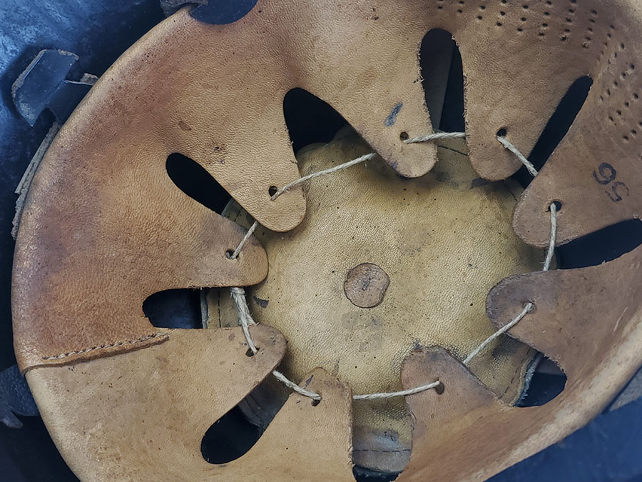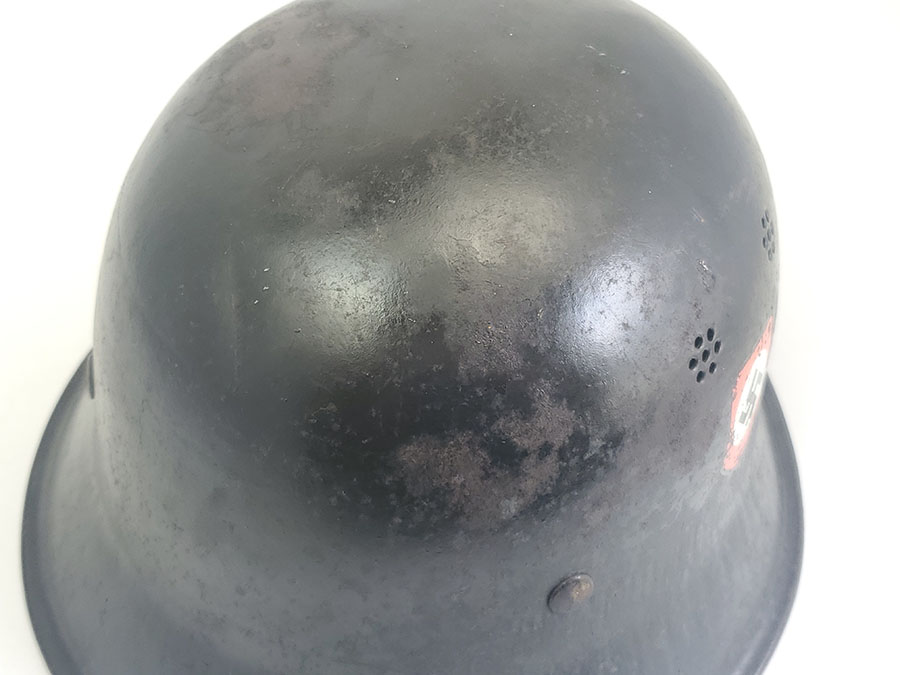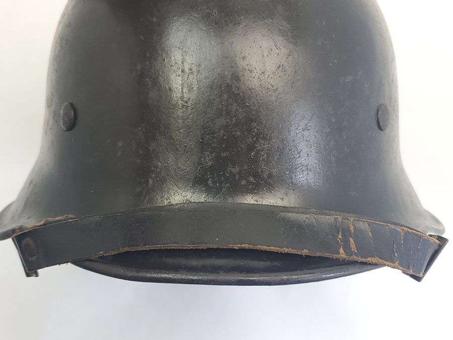 7/15/20 – This is an original M34 police helmet from WW2. The helmet is in great condition with two decals on either side of the exterior. Both decals have about 85-90% of the paint in tact. The helmet has some patina throughout the shell, and there is a crack along one side of the shell, as shown in photos. The interior is very clean, and excellent overall with minor wear and aging. The interior of the shell only has one small stamp as shown. The original leather chin strap has some surface cracking but is completely in tact.