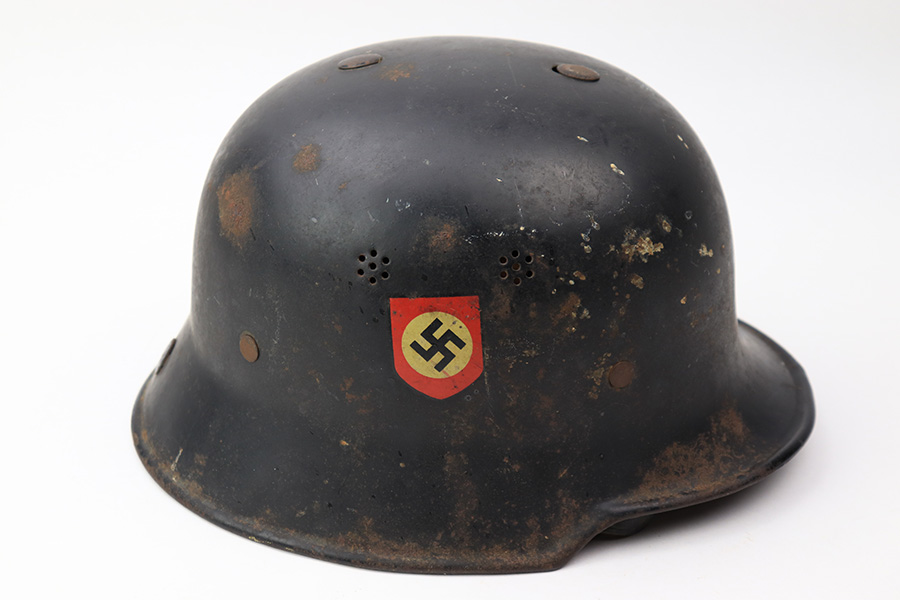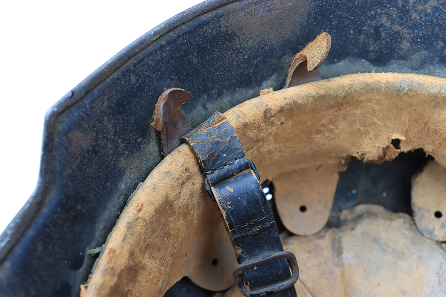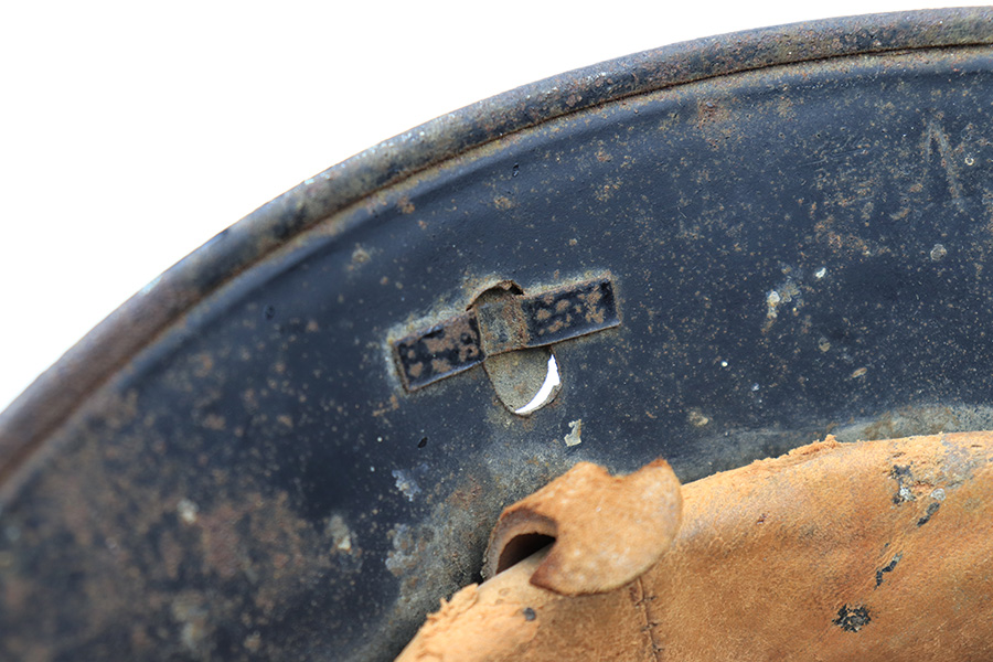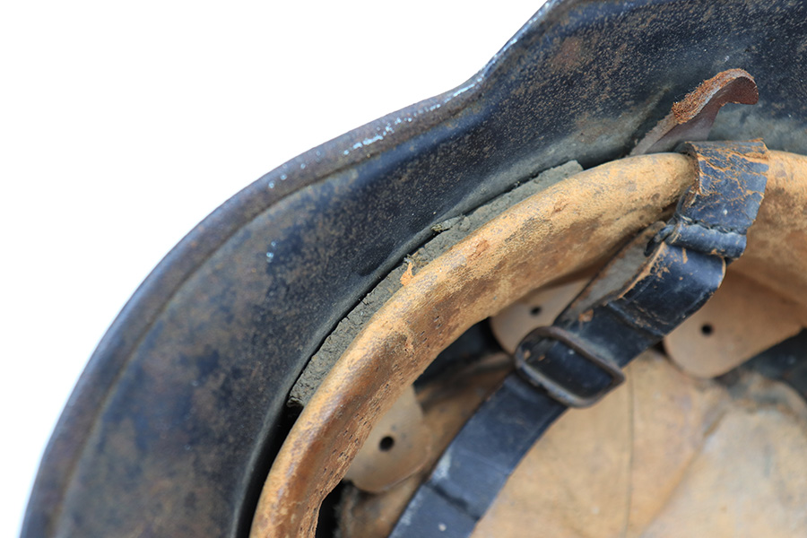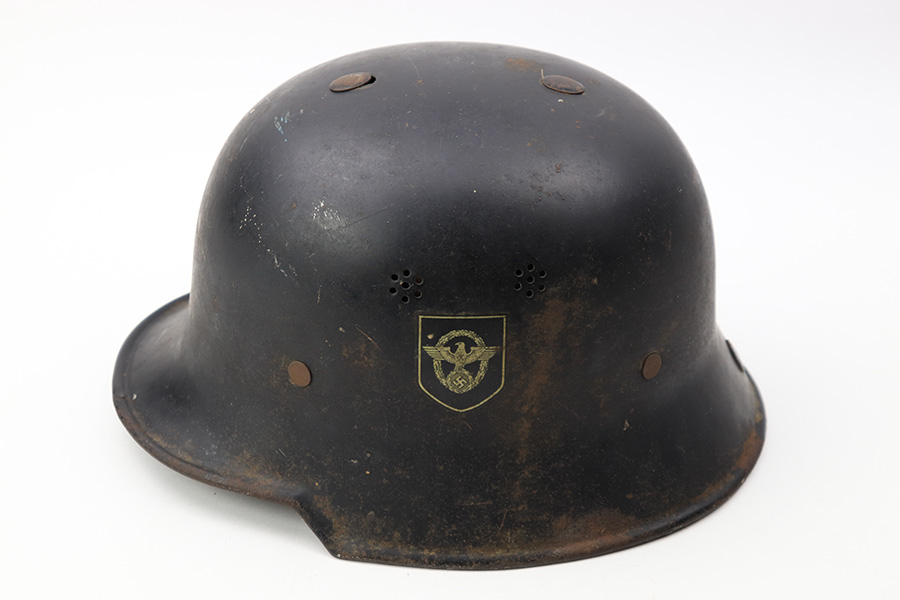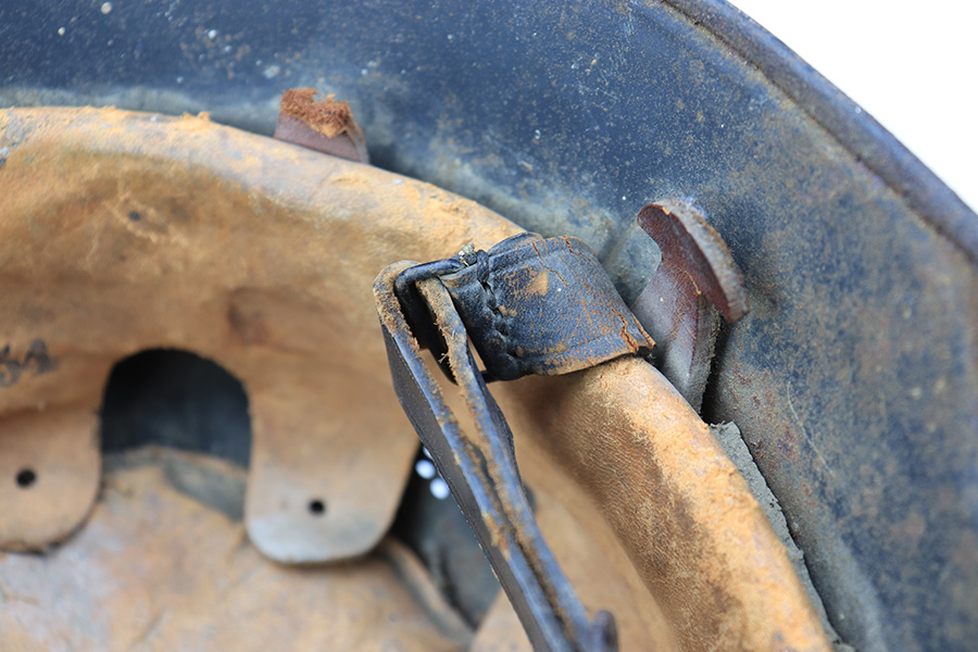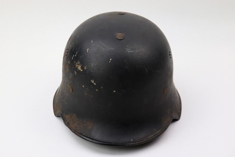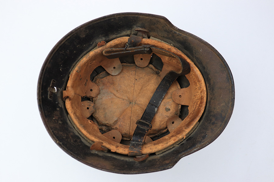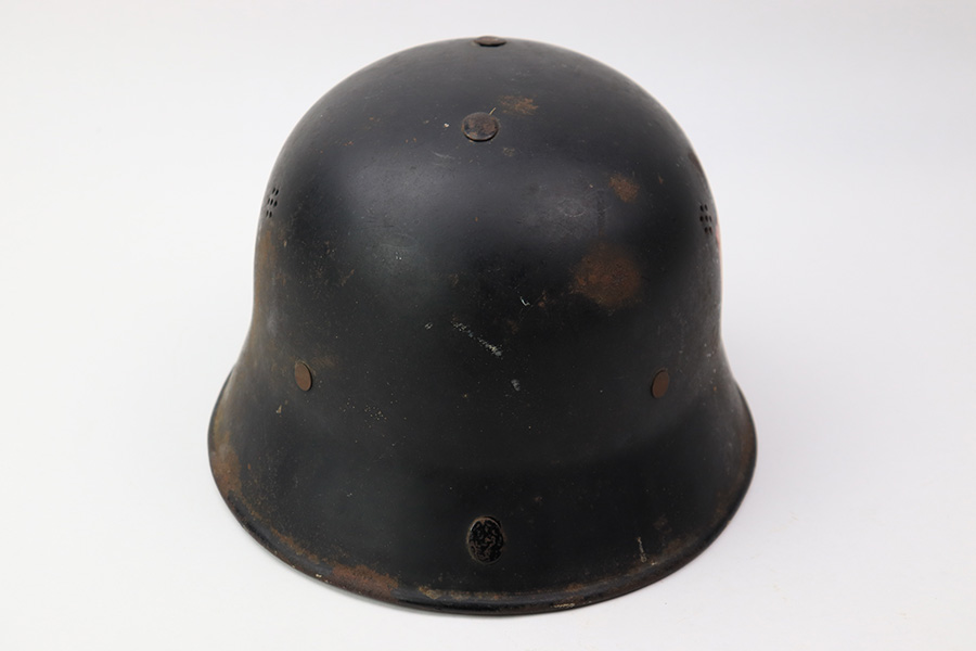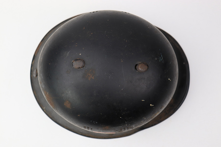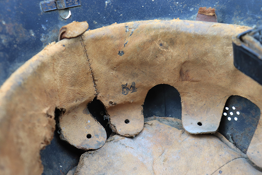 7/6/22 – This is an original WW2 M34 German helmet. The helmet was originally issued to the Fire Department, but was later converted for police use. The old “comb” on the top of the helmet shell has thus been removed, and three “plugs” cover the holes from the comb attachment. The helmet shell ahs some patina and spotty discoloration; typical signs of aging wear. The two external decals are in excellent condition and very crisp. There is some mild surface rust and patina throughout the interior shell as well. The interior leather liner is worn but still completely in tact with a “54” size ink stamp. The leather chin strap is original and attached as well.
