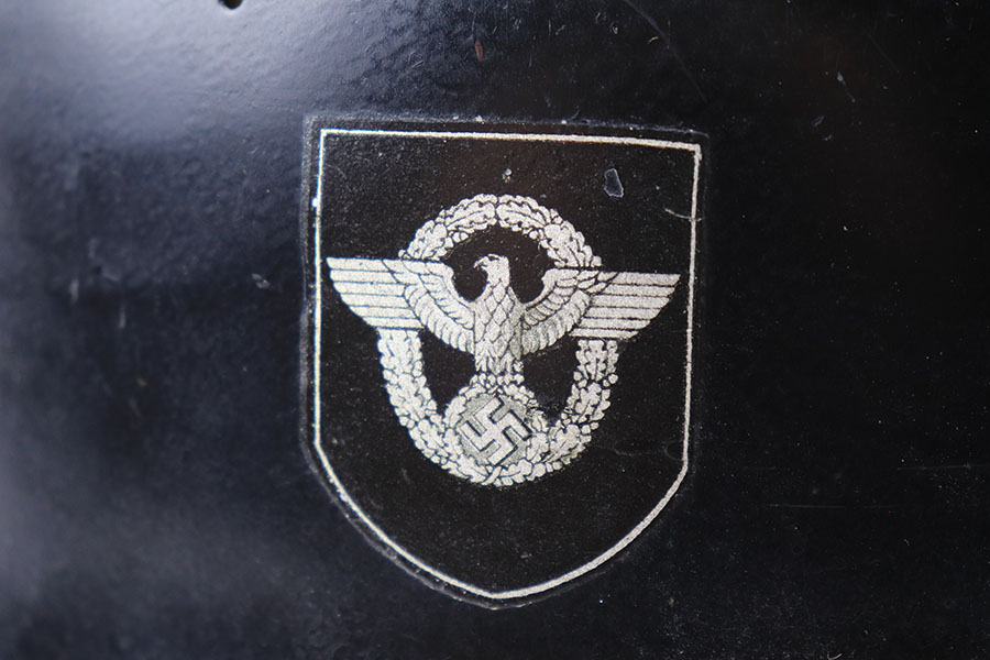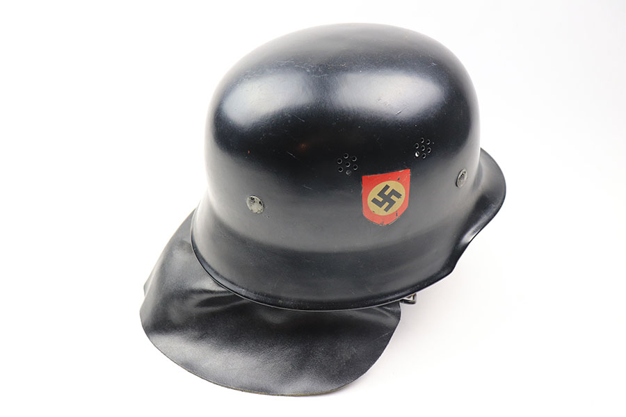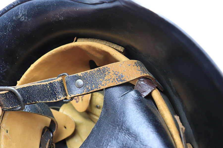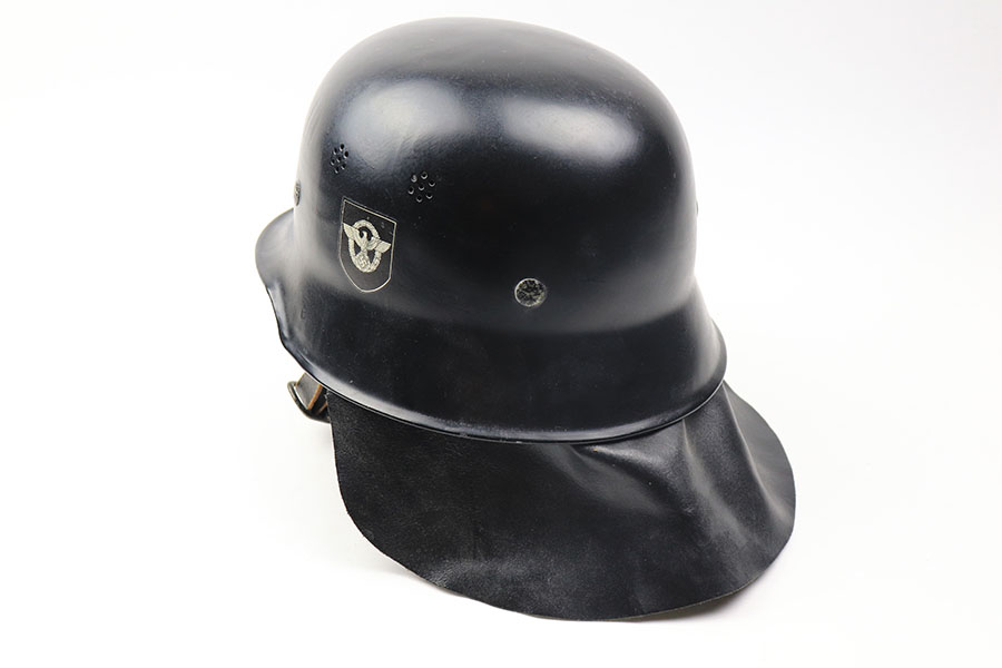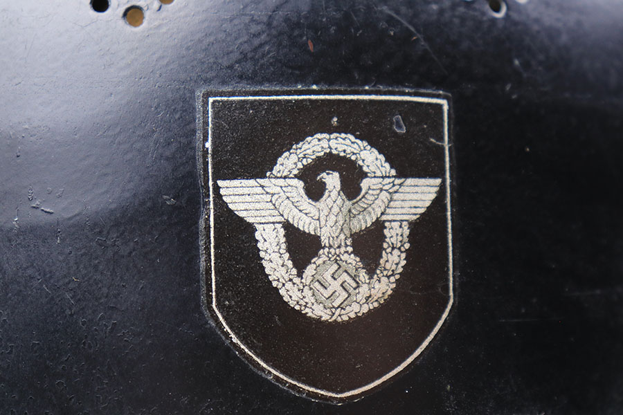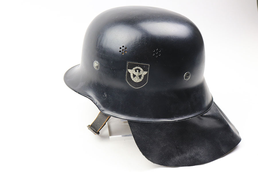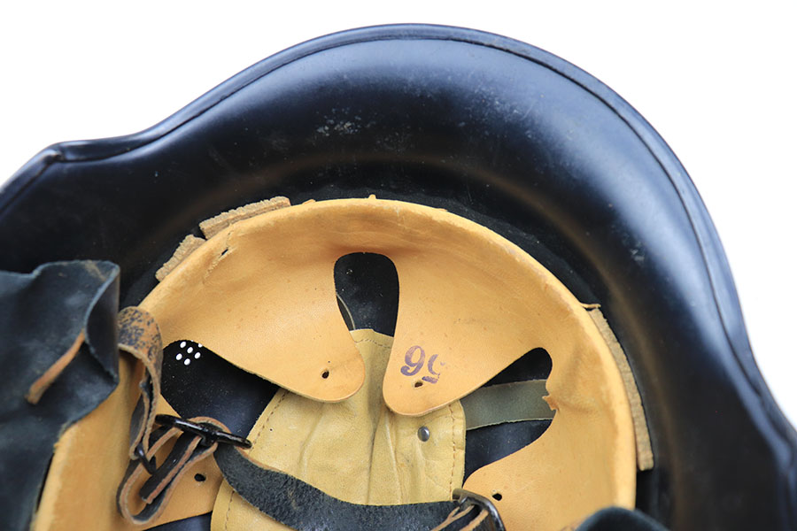 11/29/21 – This is an original m34 German Police Helmet with the original leather neck guard. The helmet has an excellent, clean exterior with two original decals in 95+% condition. Minimal exterior wear. The interior leather liner and chin strap are also excellent and original. Size marked “56”. No other markings.