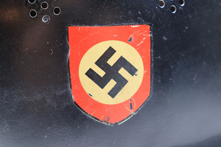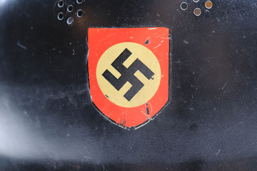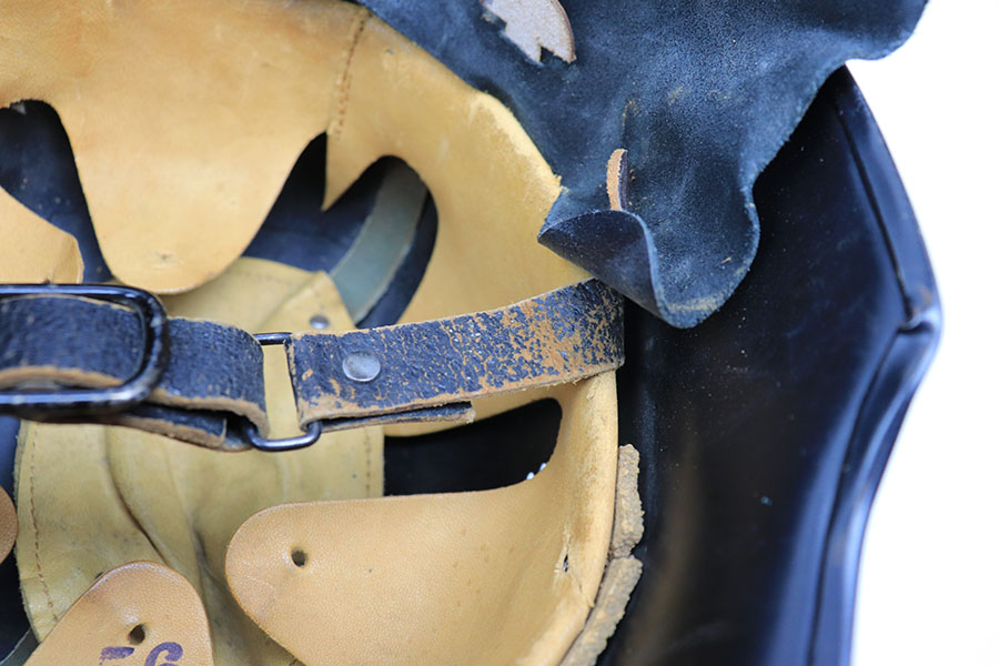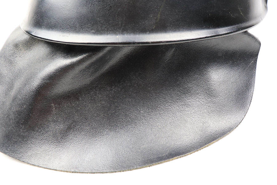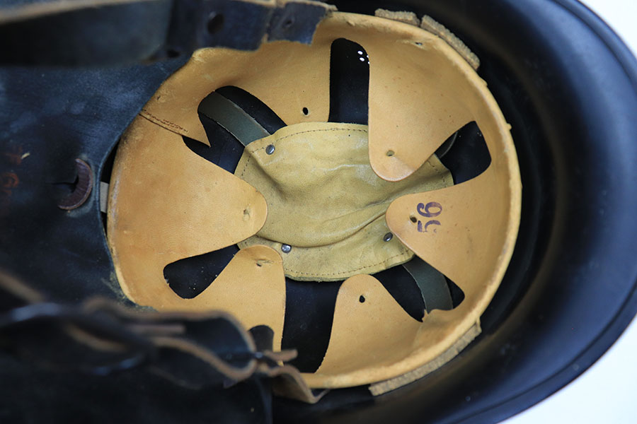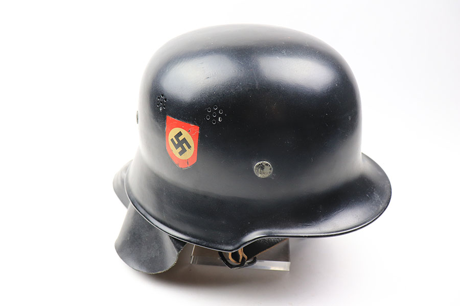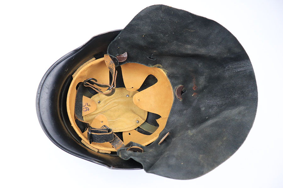 11/29/21 – This is an original m34 German Police Helmet with the original leather neck guard. The helmet has an excellent, clean exterior with two original decals in 95+% condition. Minimal exterior wear. The interior leather liner and chin strap are also excellent and original. Size marked “56”. No other markings.