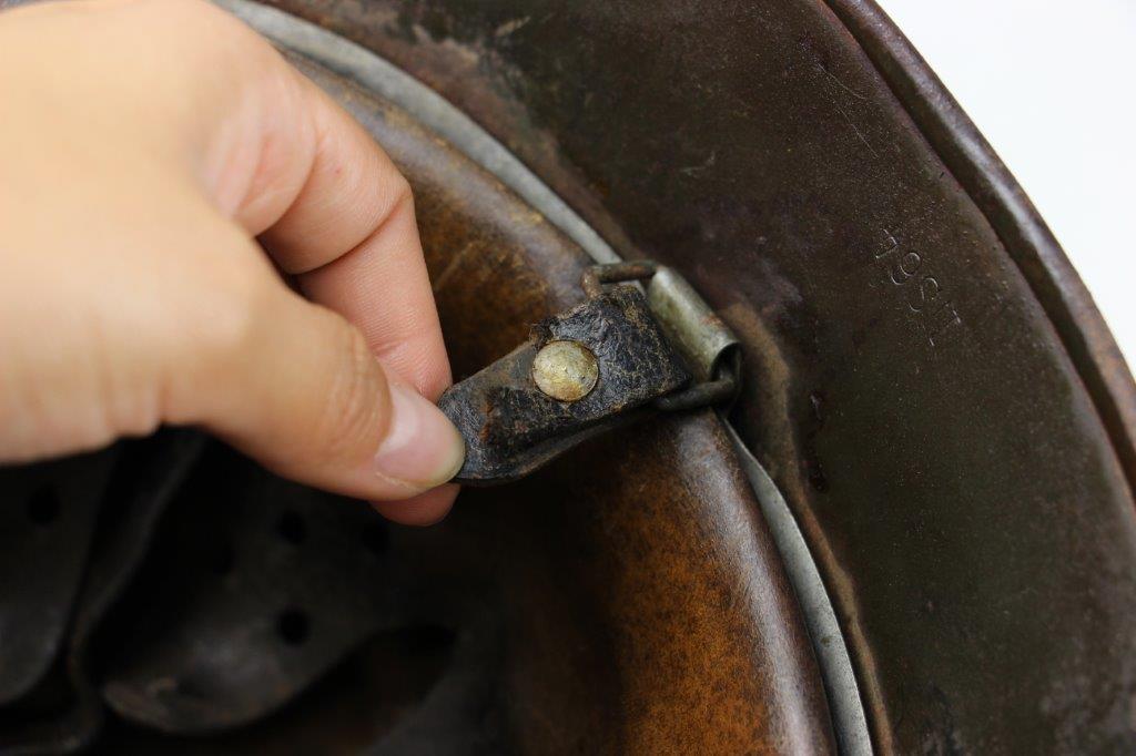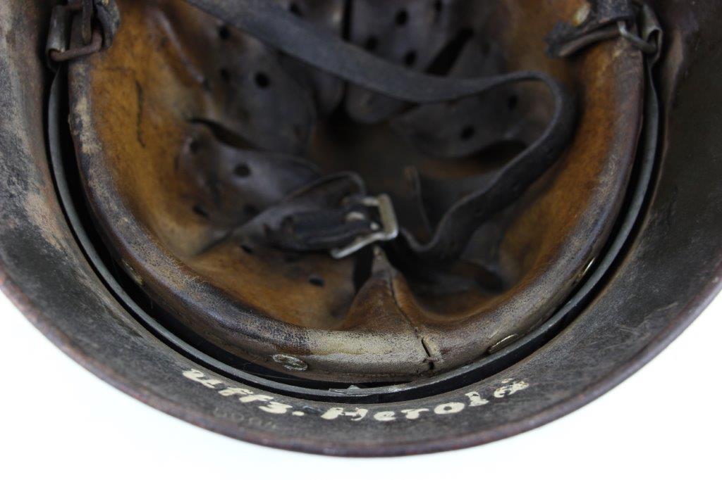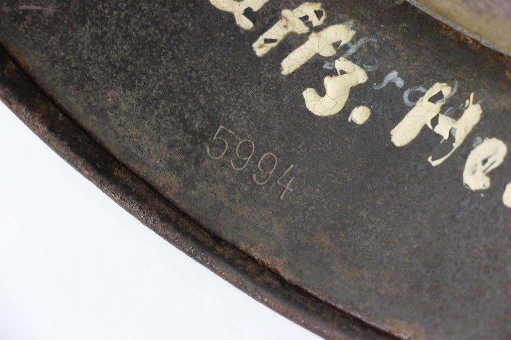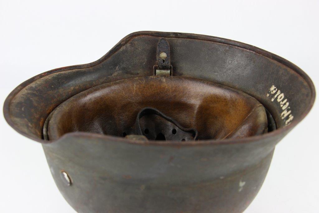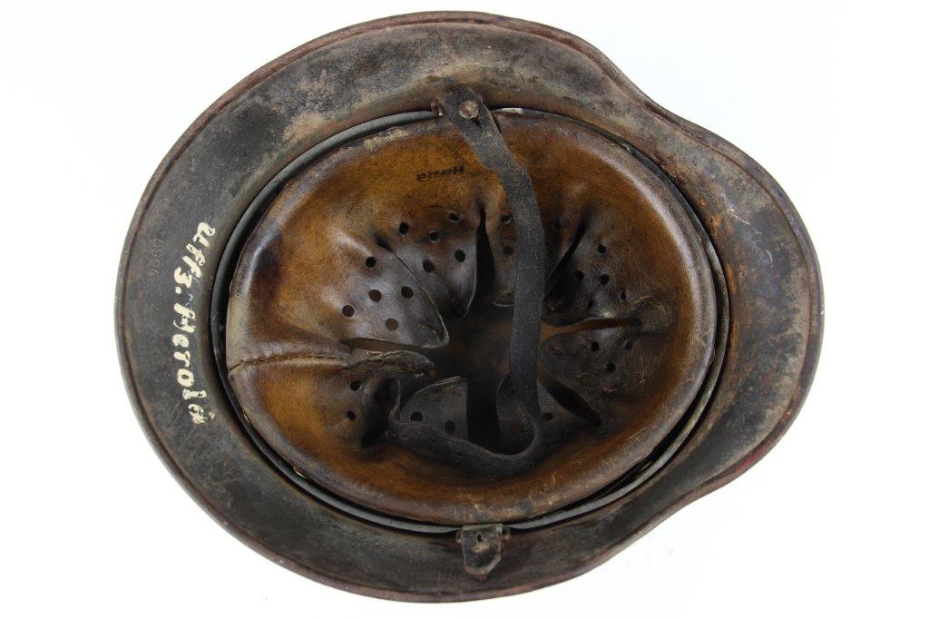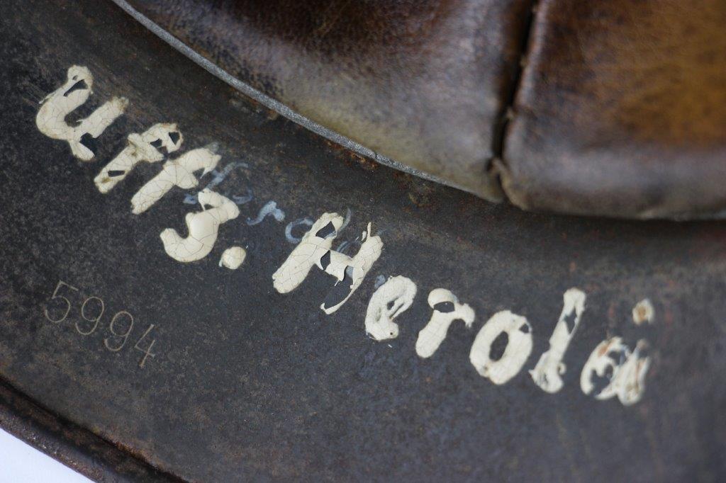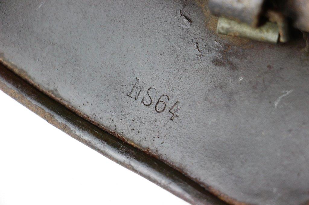 7/23/24 – This is an original WW2 German M35 Heer Army Stahlhelm. The helmet is in very good overall condition with an original leather liner and chinstrap. The helmet shell exterior shows honest patina and light discoloration. The left side of the exterior has a Heer Army decal, which is mostly worn away and only about 10-15% of the decal remains. The interior shell shows similar patina throughout and has a name painted inside, “Uffz Harold”. This matches the name written on the leather liner, which helps authenticate the liner as original to the shell. The left-ear side of the shell is maker and size stamped, “NS64” for Vereinigte Deutsche Nickelwerke. The shell has no dents and retains all of the original rivets and vent holes. The leather liner is in great condition with natural discoloration and strong leather with normal pliability. The chinstrap is broken at the fastening buckle, as shown in photos. The broken-off piece is included however, and the rest of the chinstrap is completely intact. A very good, honest example with aging that’s common for these early M35 helmets that saw heavy use during WW2.