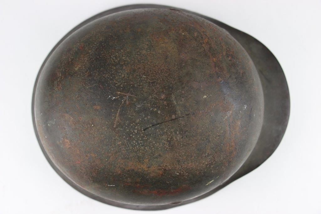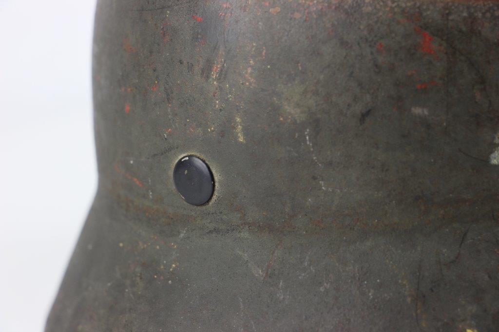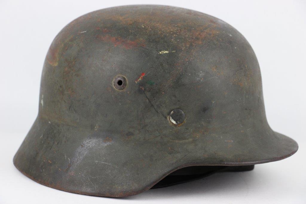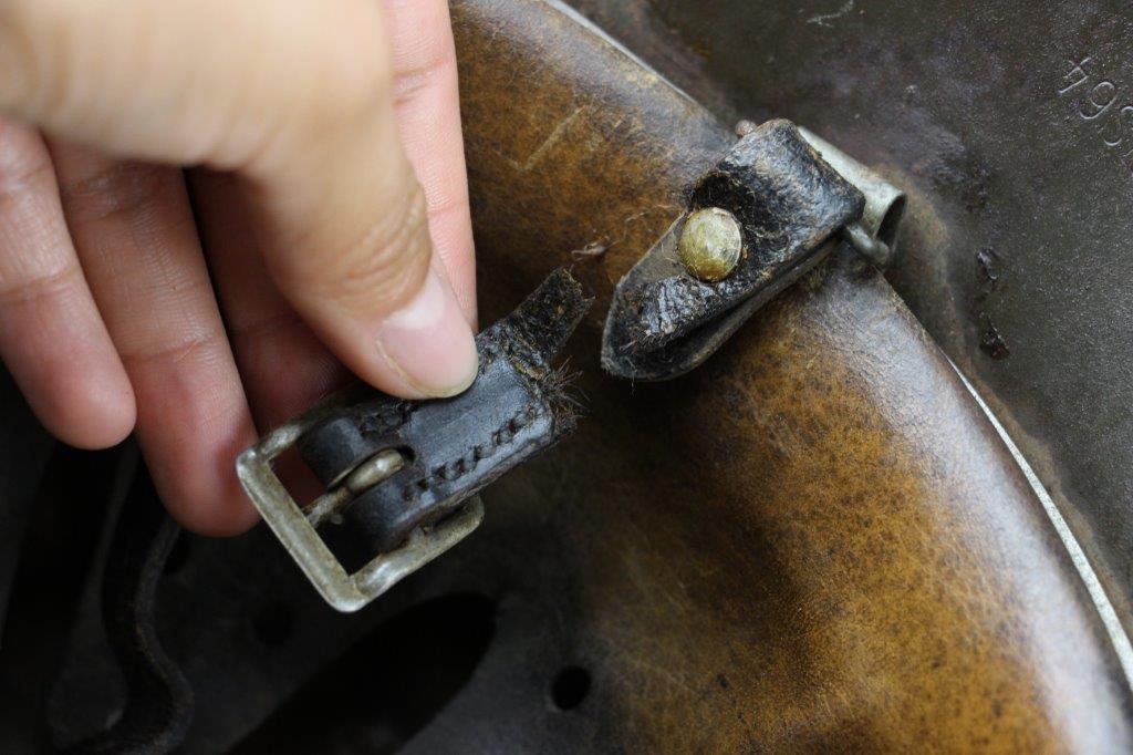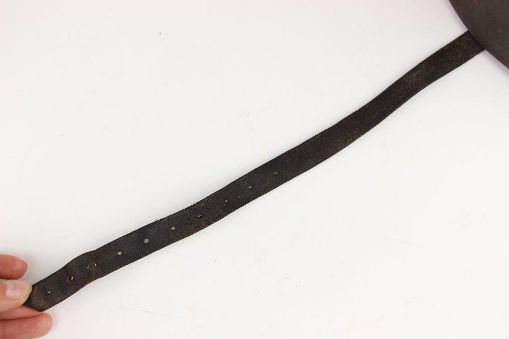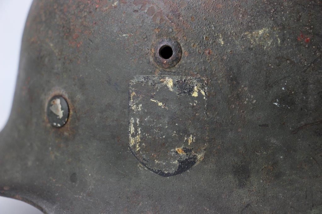 7/23/24 – This is an original WW2 German M35 Heer Army Stahlhelm. The helmet is in very good overall condition with an original leather liner and chinstrap. The helmet shell exterior shows honest patina and light discoloration. The left side of the exterior has a Heer Army decal, which is mostly worn away and only about 10-15% of the decal remains. The interior shell shows similar patina throughout and has a name painted inside, “Uffz Harold”. This matches the name written on the leather liner, which helps authenticate the liner as original to the shell. The left-ear side of the shell is maker and size stamped, “NS64” for Vereinigte Deutsche Nickelwerke. The shell has no dents and retains all of the original rivets and vent holes. The leather liner is in great condition with natural discoloration and strong leather with normal pliability. The chinstrap is broken at the fastening buckle, as shown in photos. The broken-off piece is included however, and the rest of the chinstrap is completely intact. A very good, honest example with aging that’s common for these early M35 helmets that saw heavy use during WW2.
