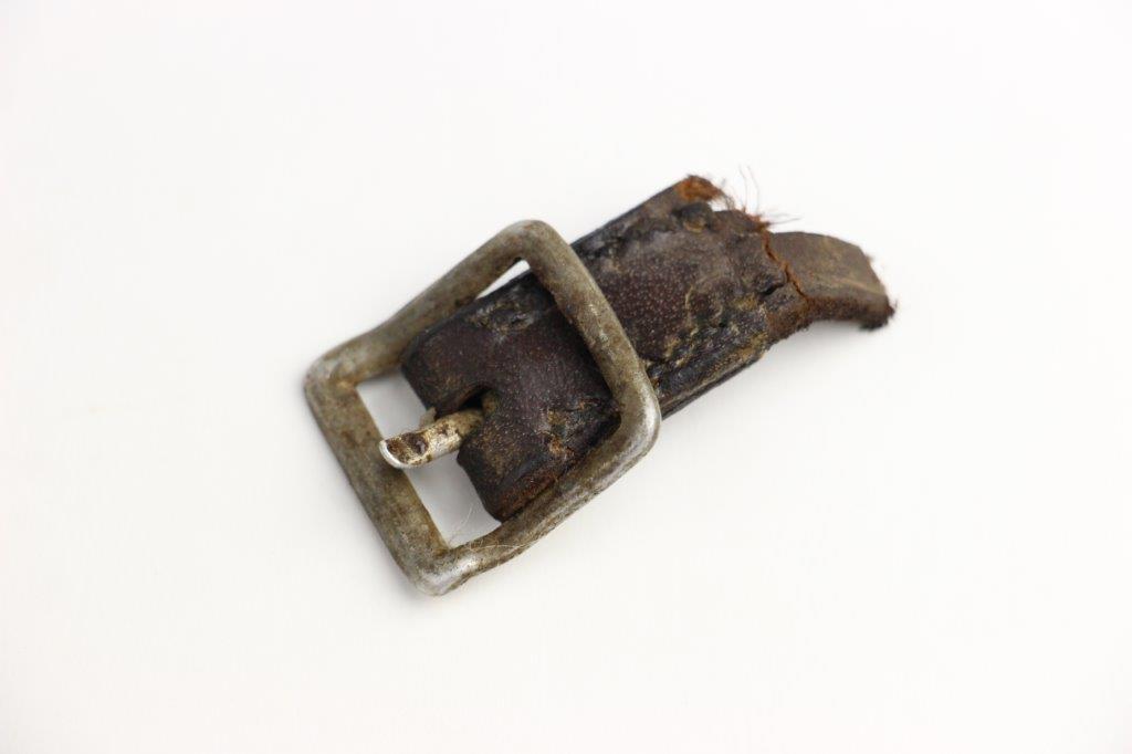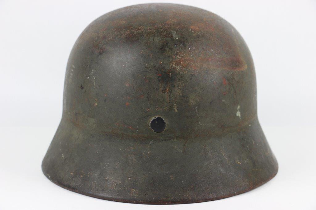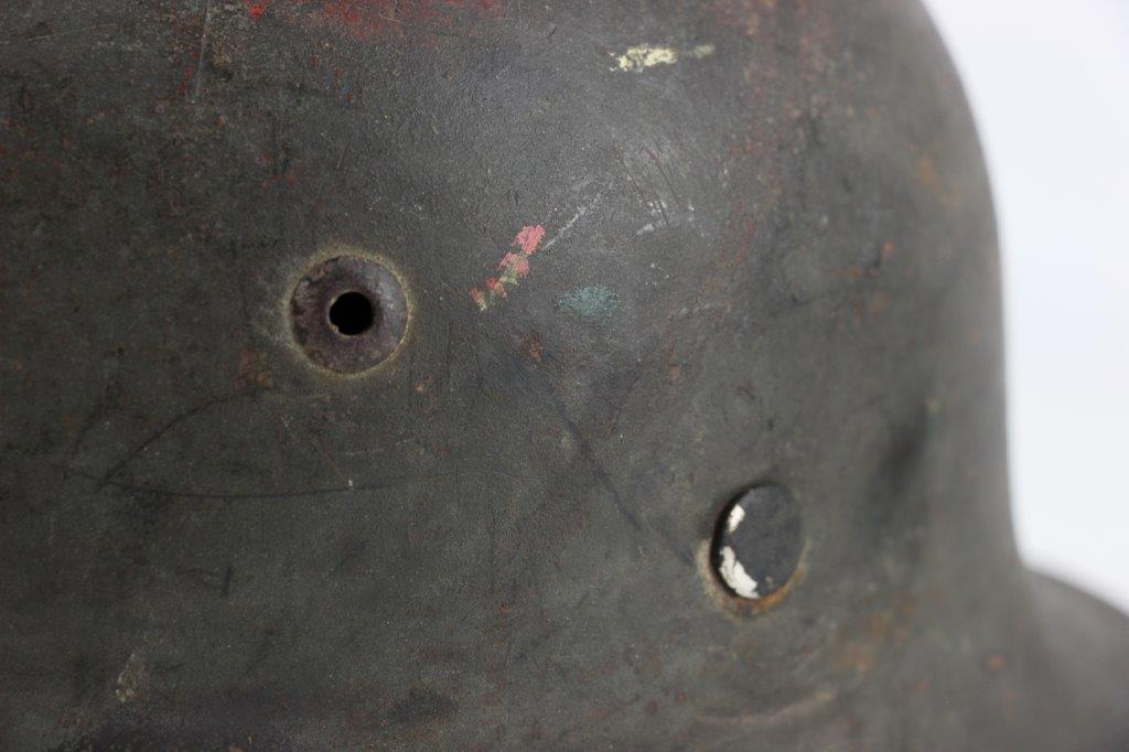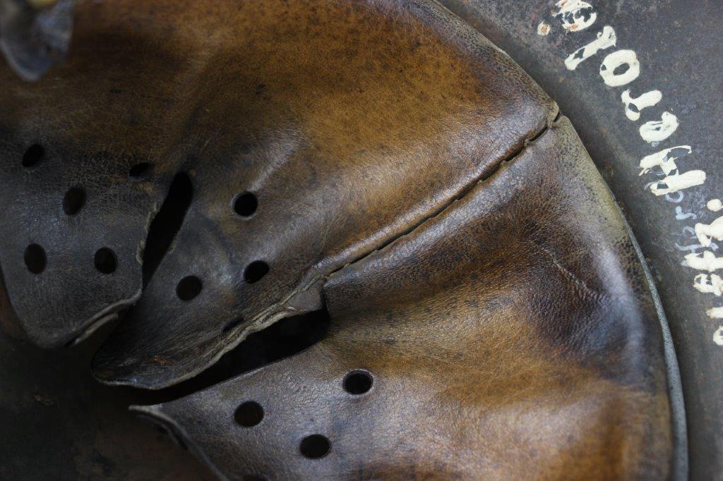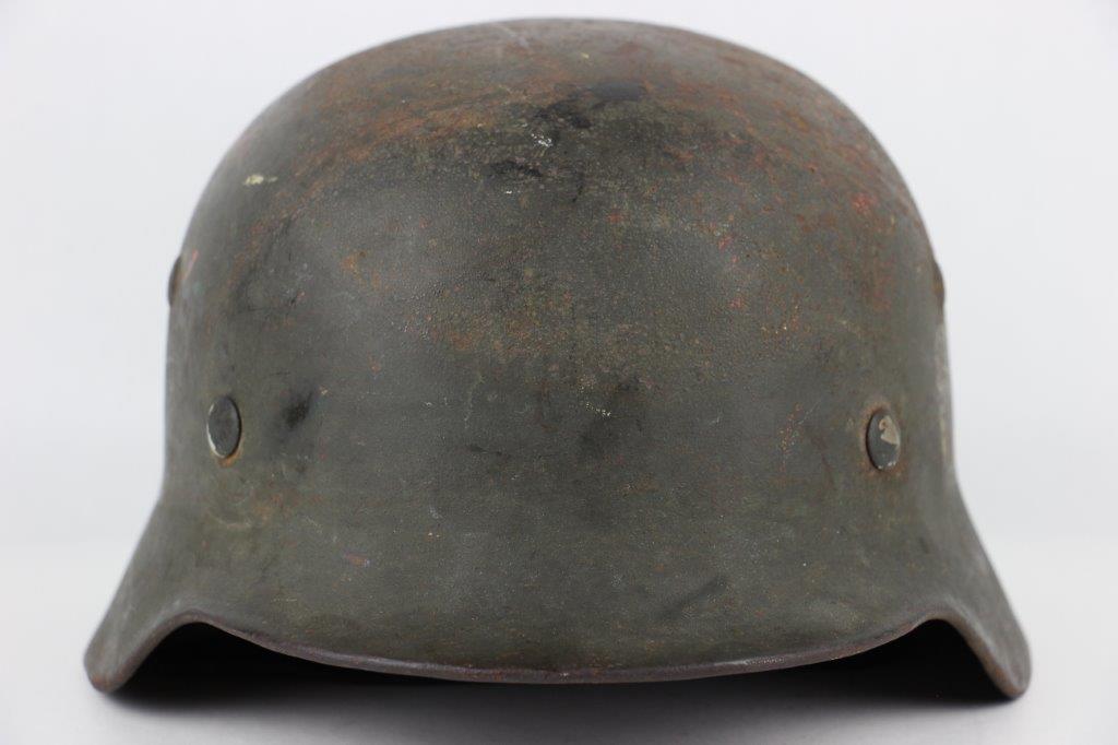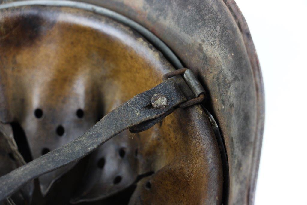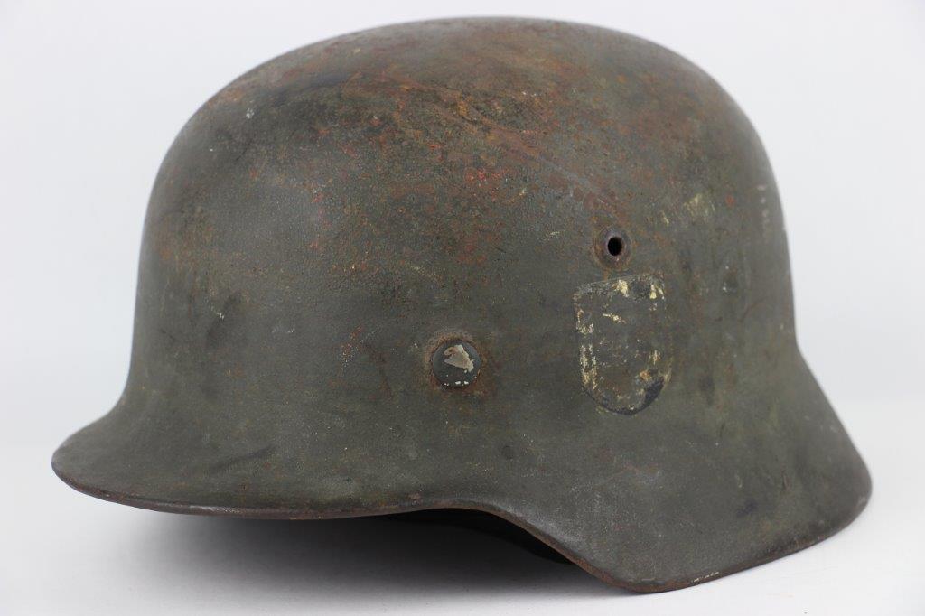 7/23/24 – This is an original WW2 German M35 Heer Army Stahlhelm. The helmet is in very good overall condition with an original leather liner and chinstrap. The helmet shell exterior shows honest patina and light discoloration. The left side of the exterior has a Heer Army decal, which is mostly worn away and only about 10-15% of the decal remains. The interior shell shows similar patina throughout and has a name painted inside, “Uffz Harold”. This matches the name written on the leather liner, which helps authenticate the liner as original to the shell. The left-ear side of the shell is maker and size stamped, “NS64” for Vereinigte Deutsche Nickelwerke. The shell has no dents and retains all of the original rivets and vent holes. The leather liner is in great condition with natural discoloration and strong leather with normal pliability. The chinstrap is broken at the fastening buckle, as shown in photos. The broken-off piece is included however, and the rest of the chinstrap is completely intact. A very good, honest example with aging that’s common for these early M35 helmets that saw heavy use during WW2.
