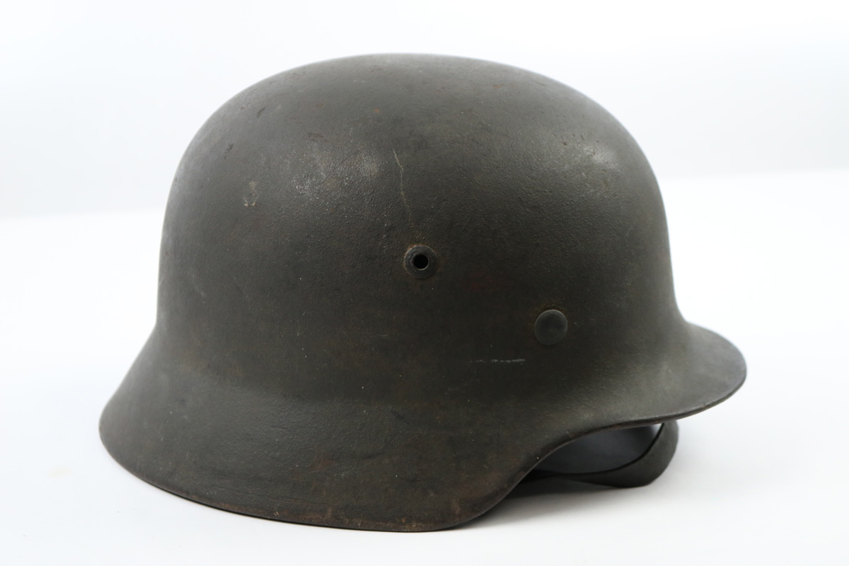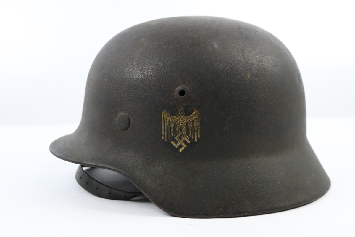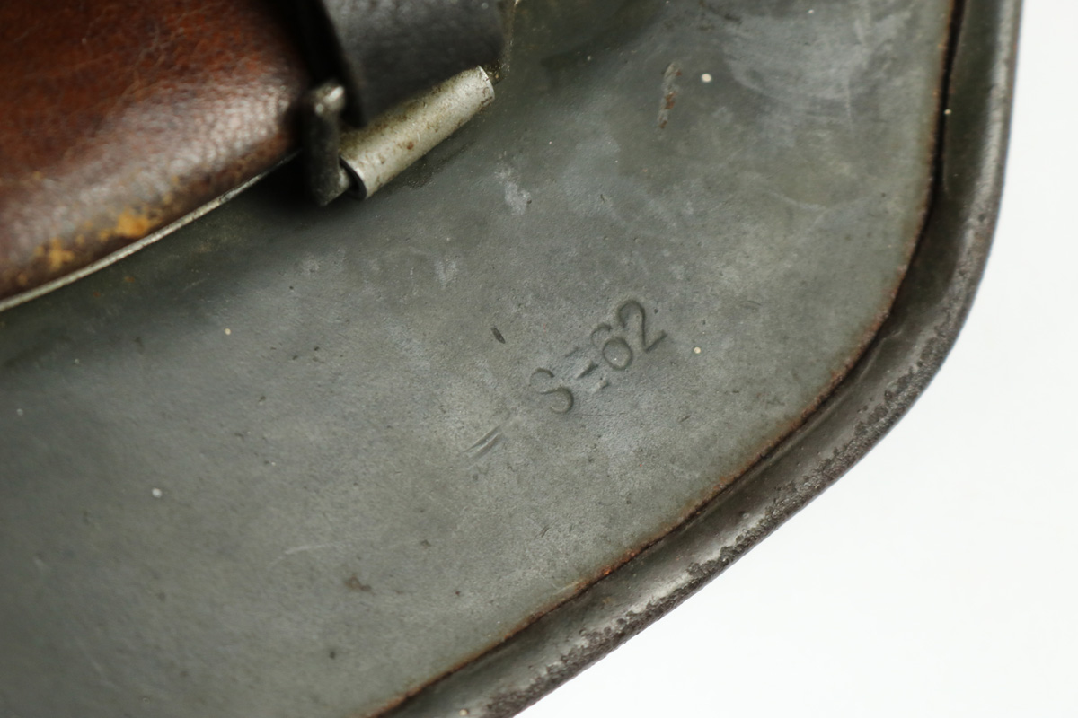 10/23/18 – This is an original WW2 nazi m35 single decal helmet. This helmet has some light wear and normal aging on the exterior but no dents or notable damage. The original leather chin strap is in tact and attached. The decal has very nice paint with some normal wear. The interior of the holster is named and serial number 4807. The maker code is SE for Sachsische Emailler–Stanzewerke and size 62. Very nice leather liner on the interior. All guaranteed original and authentic from WW2. A rare and excellent collectible helmet.