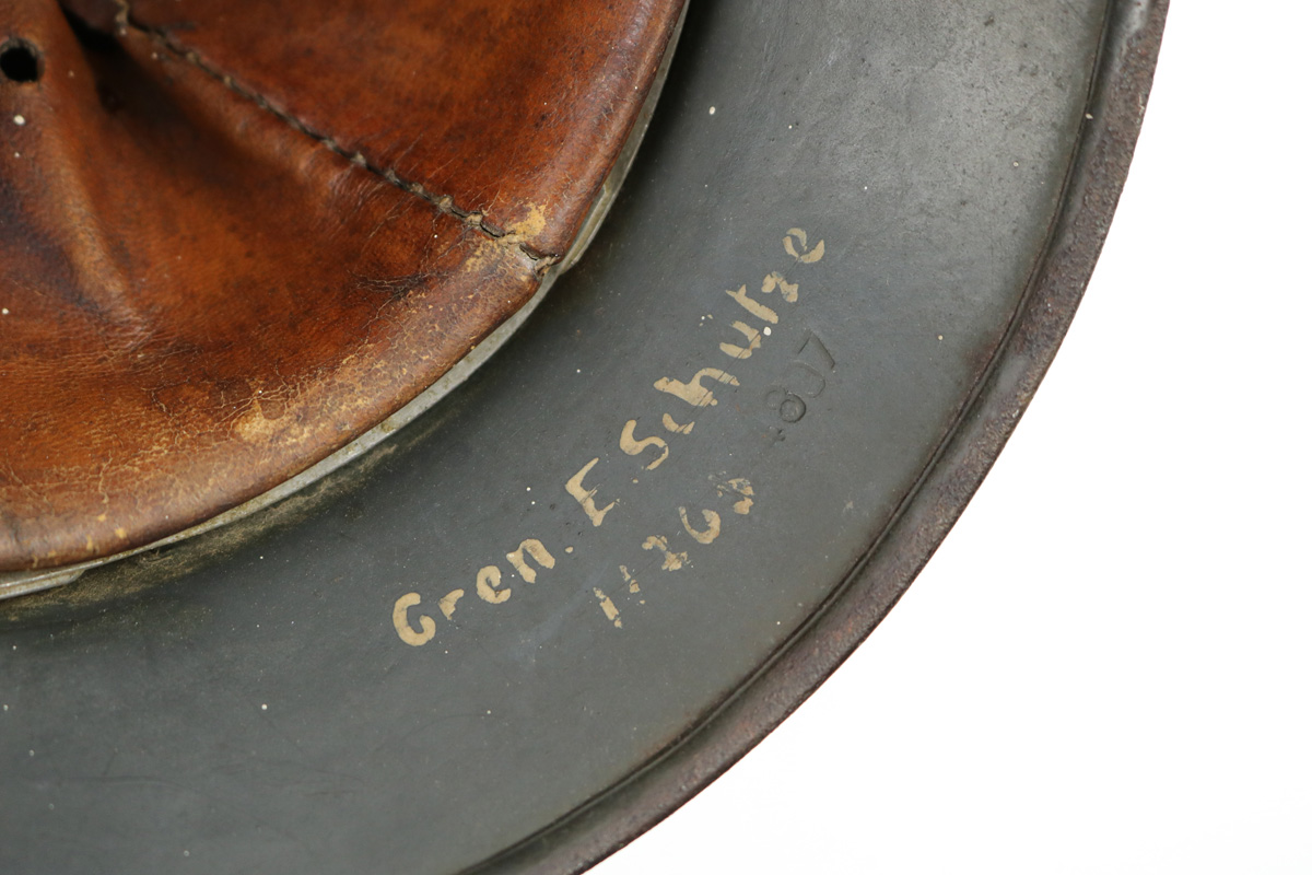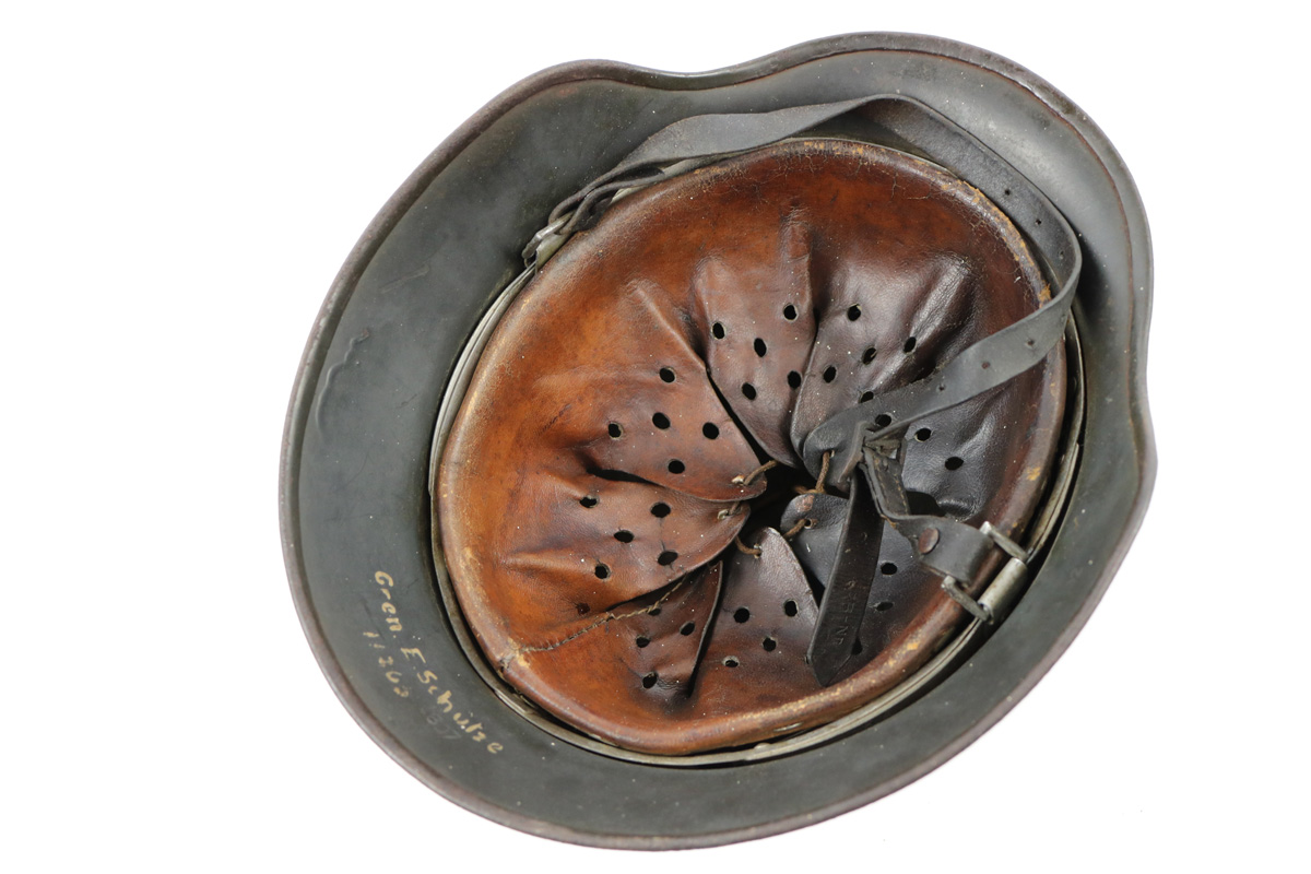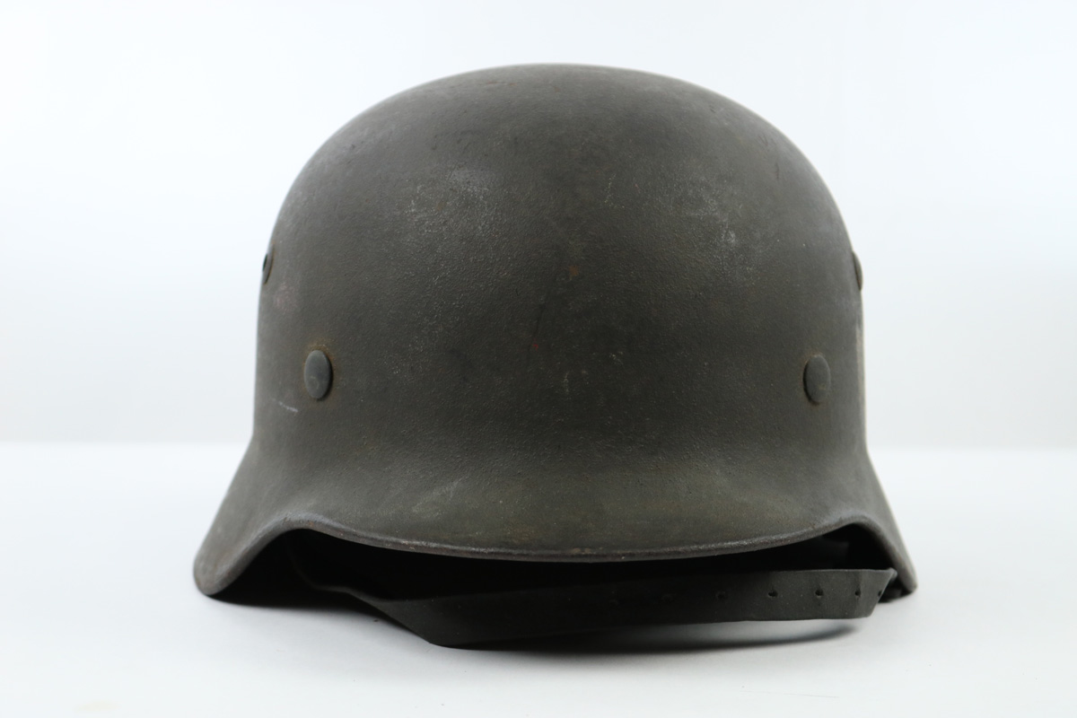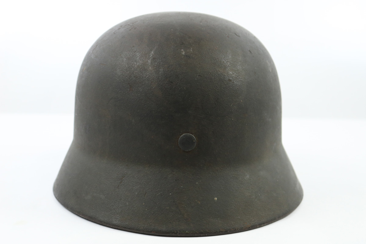 10/23/18 – This is an original WW2 nazi m35 single decal helmet. This helmet has some light wear and normal aging on the exterior but no dents or notable damage. The original leather chin strap is in tact and attached. The decal has very nice paint with some normal wear. The interior of the holster is named and serial number 4807. The maker code is SE for Sachsische Emailler–Stanzewerke and size 62. Very nice leather liner on the interior. All guaranteed original and authentic from WW2. A rare and excellent collectible helmet.