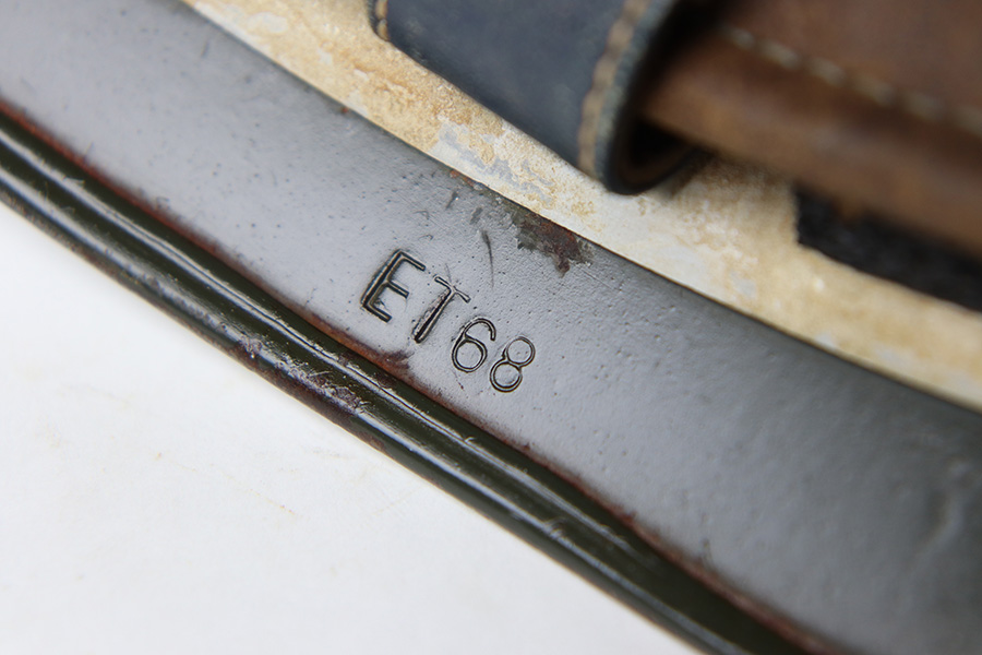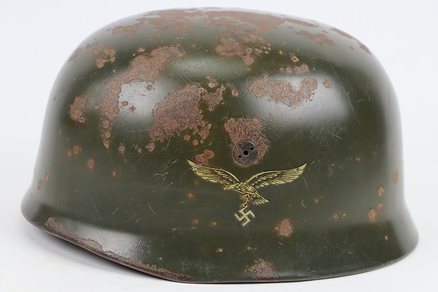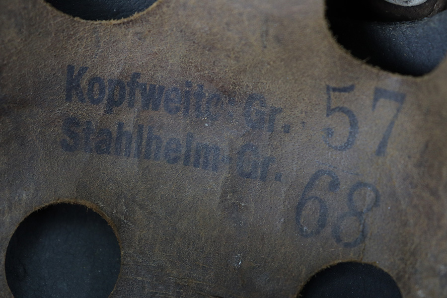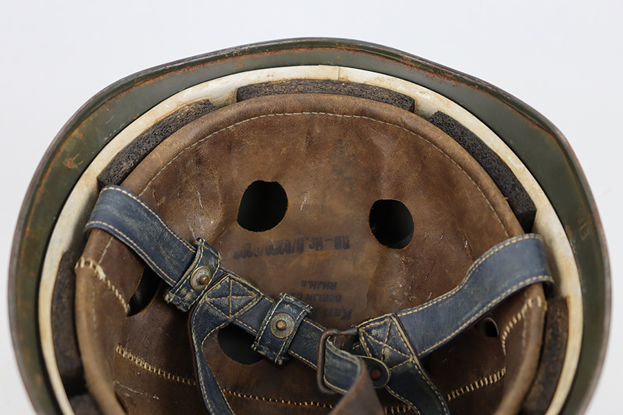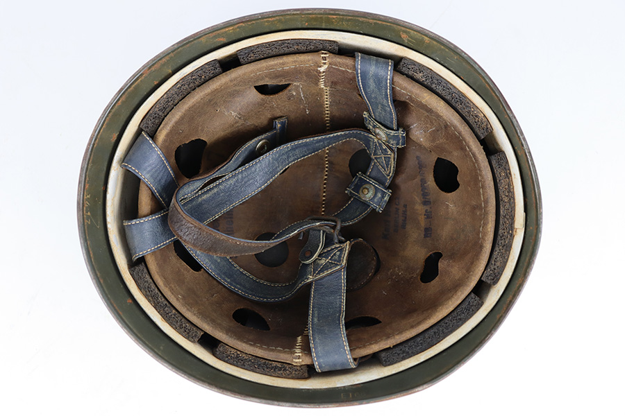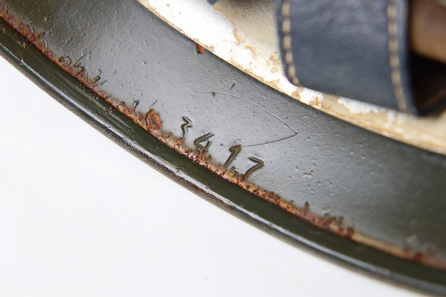 11/14/23 – This is a high quality reproduction example of a German Paratrooper M38 Fallschirmjager helmet. The helmet has a professionally aged shell with some spotty areas of surface rust throughout the exterior. The right side of the helmet has a Luftwaffe decal in excellent condition with great, crisp detail. The interior leather liner looks aged and is in excellent condition. Comes with a leather chin strap as well, which is also excellent.