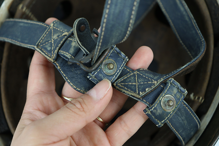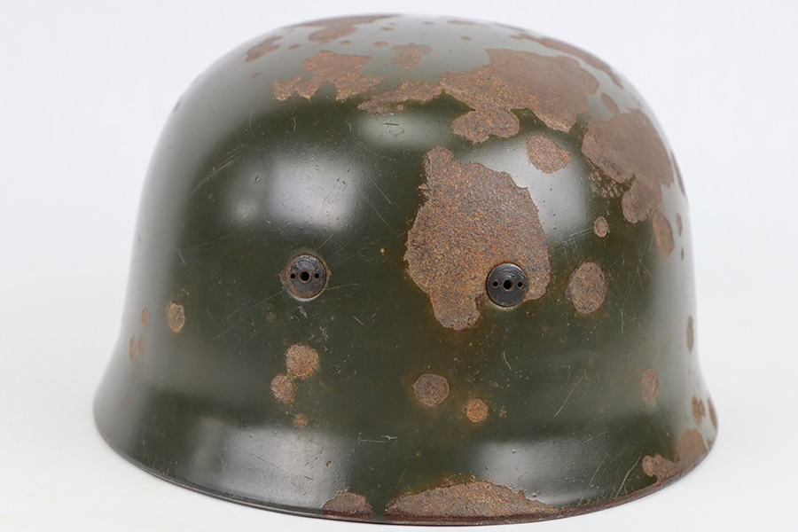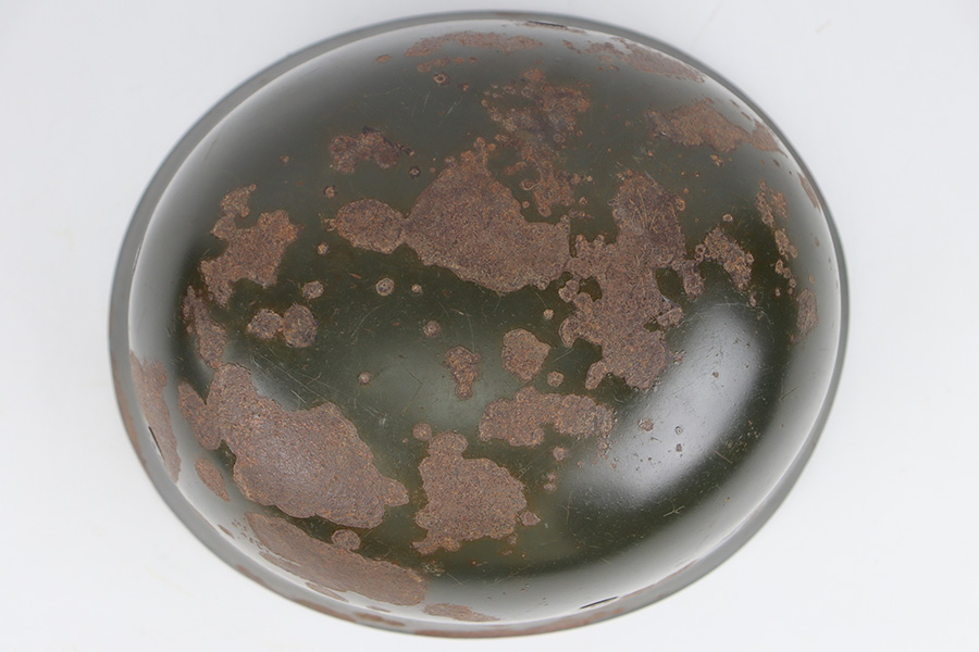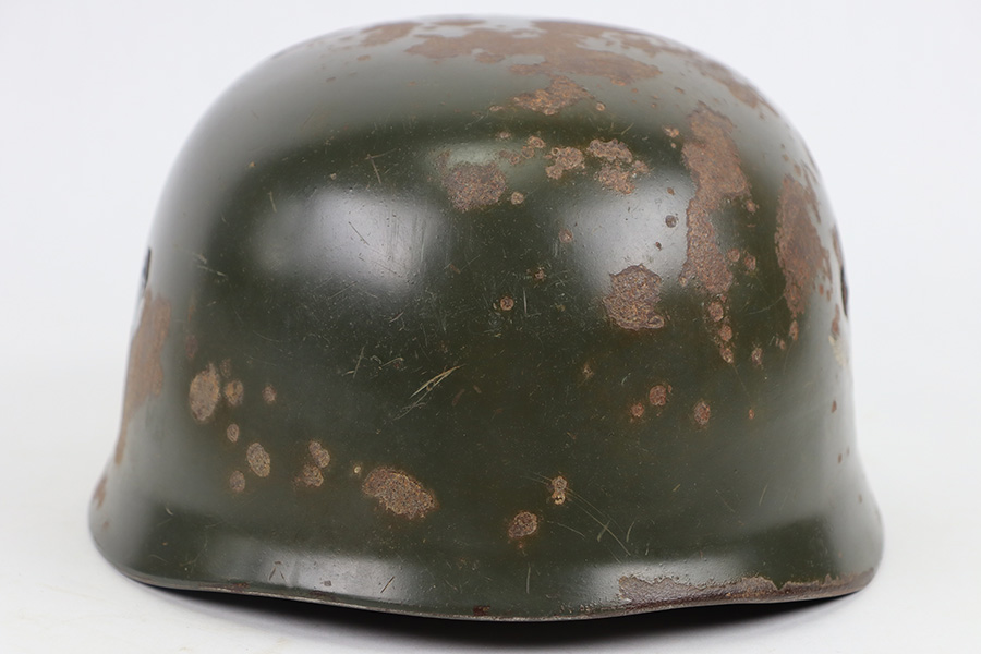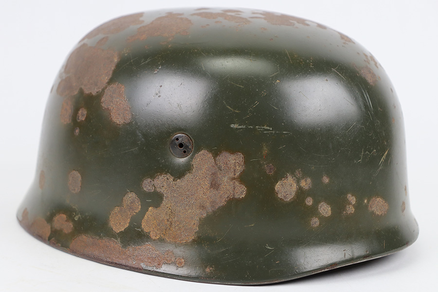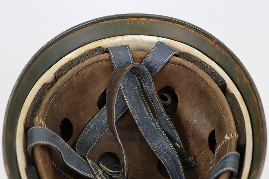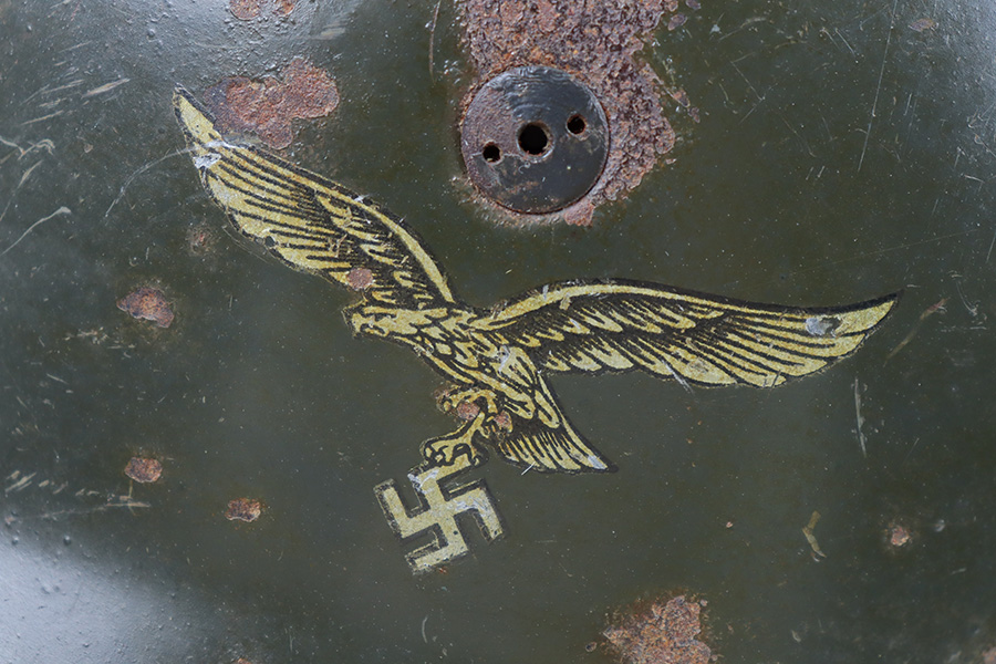 11/14/23 – This is a high quality reproduction example of a German Paratrooper M38 Fallschirmjager helmet. The helmet has a professionally aged shell with some spotty areas of surface rust throughout the exterior. The right side of the helmet has a Luftwaffe decal in excellent condition with great, crisp detail. The interior leather liner looks aged and is in excellent condition. Comes with a leather chin strap as well, which is also excellent.