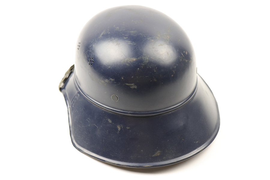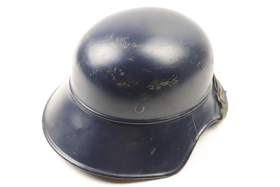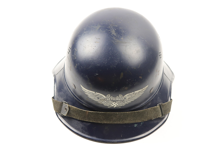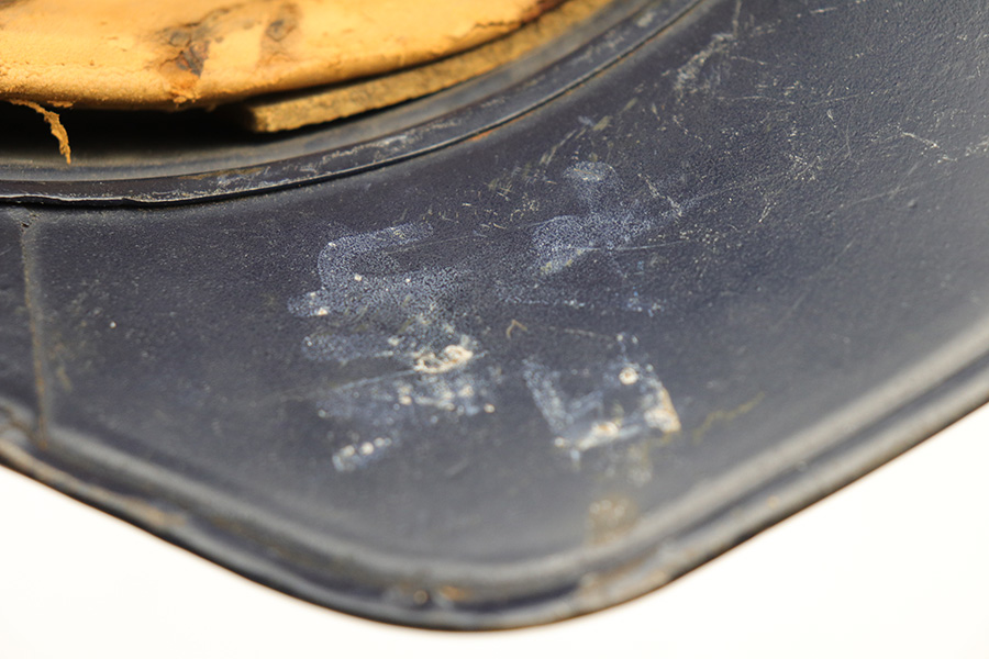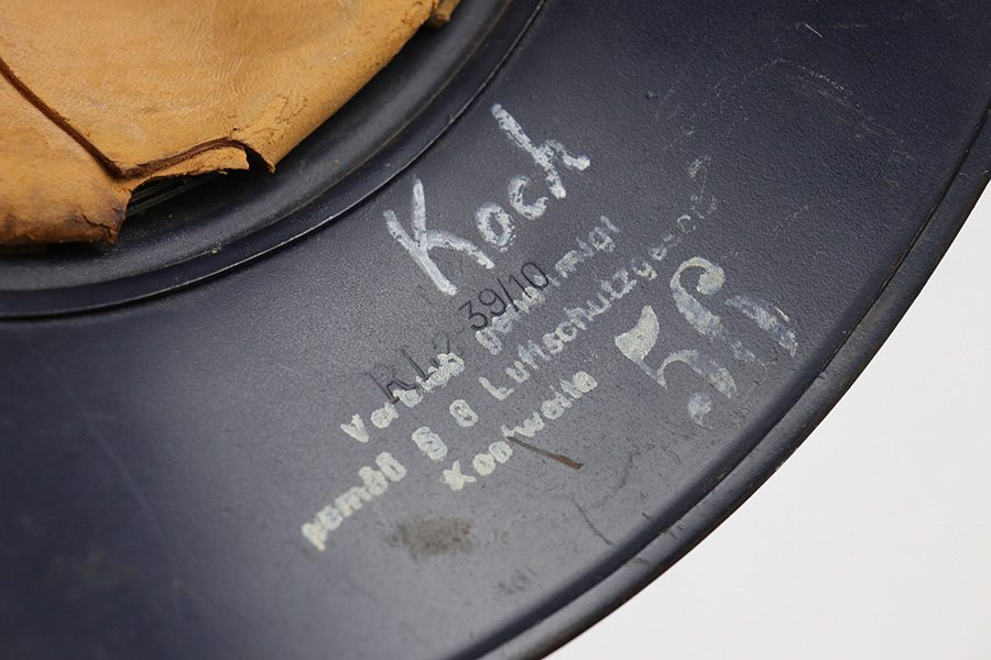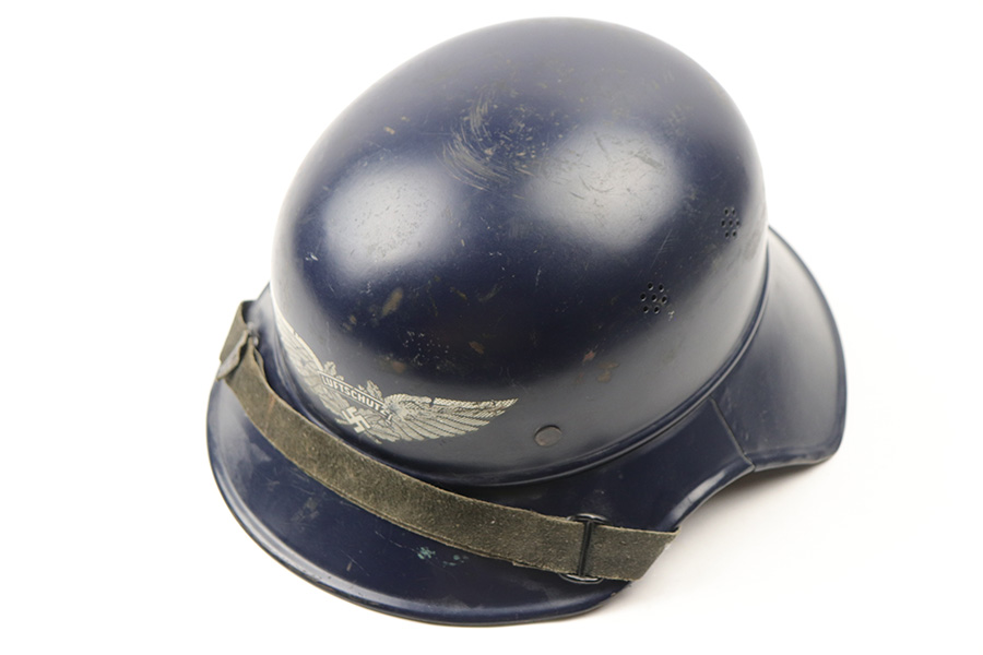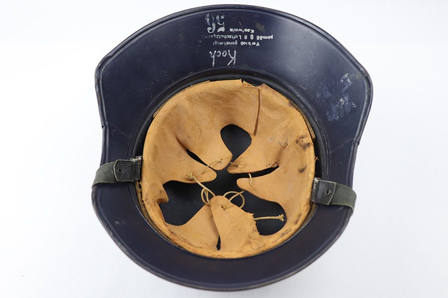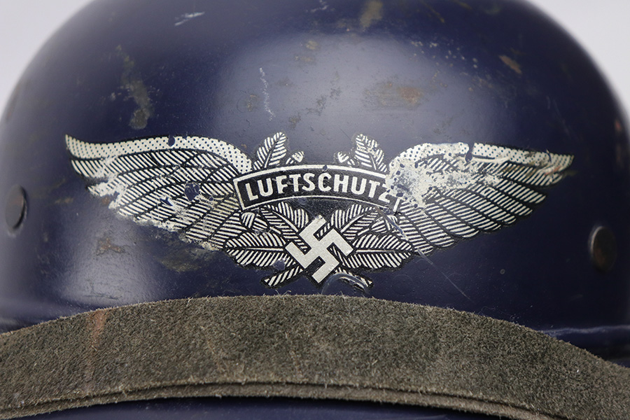 11/1/21 – This is a M1938 beaded Luftschutz German helmet. Also known as the German Air Protection. The exterior of the helmet has about 90% of the front decal still in tact. The exterior blue paint is excellent as well with about 88-90% of the pain remaining, accompanied by some mild scuffing and discoloration. No dents. The interior has a very nice leather liner and original chin strap. The shell is stamped “RL2 – 39/10”. There is also some interior shell writing, which indicates size to be 56.