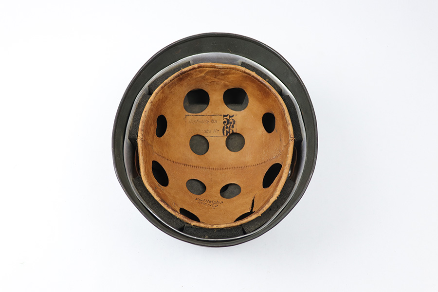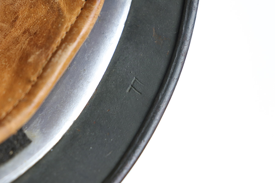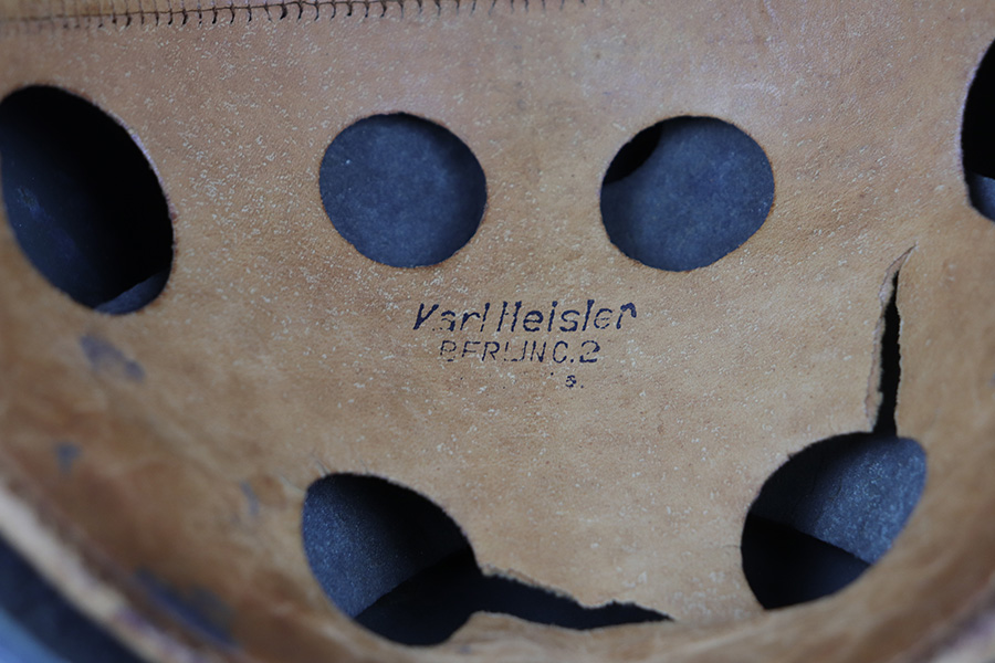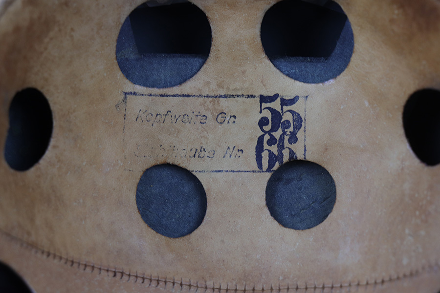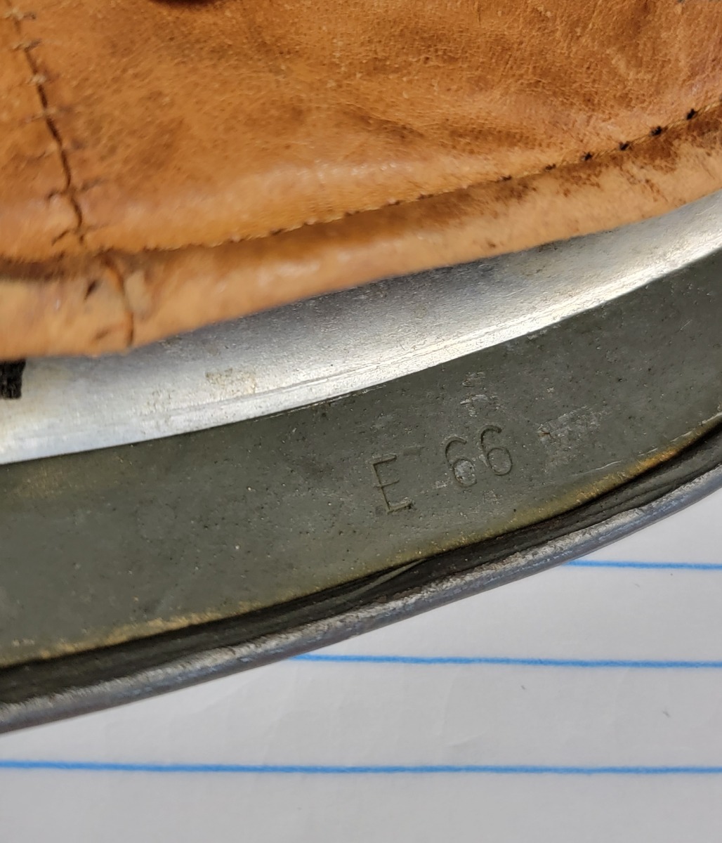 10/12/21 – This is an original M38 Luftwaffe Paratrooper Helmet from WW2. The helmet is in excellent overall condition with a very nice shell that has some mild paint loss and patina but no dents or significant flaws. The single decal Luftwaffe eagle is about 85% condition. There are late war solid slotted bolts. We think it’s possible the bolts and metal liner were removed at one point, or possibly replaced (priced accordingly). The interior shell is serial numbered 77 and maker stamped “ET 66”. The interior leather liner is in great condition despite some cracking in the leather as shown. Ink stamped on the interior leather for sizing.