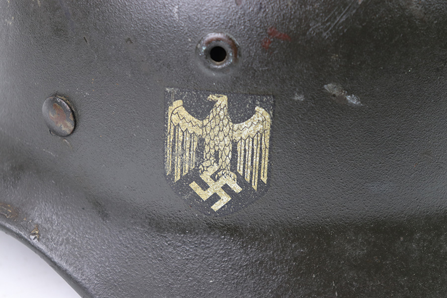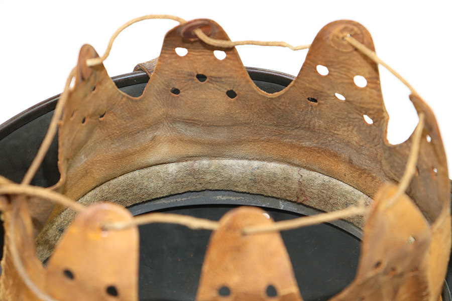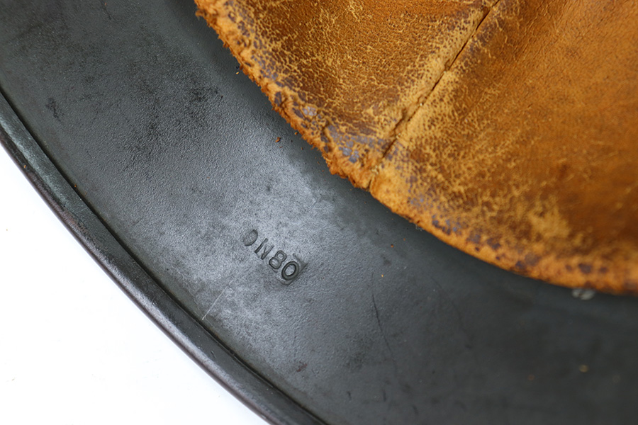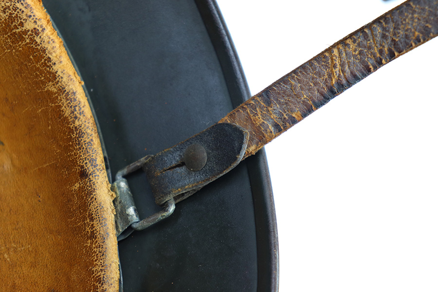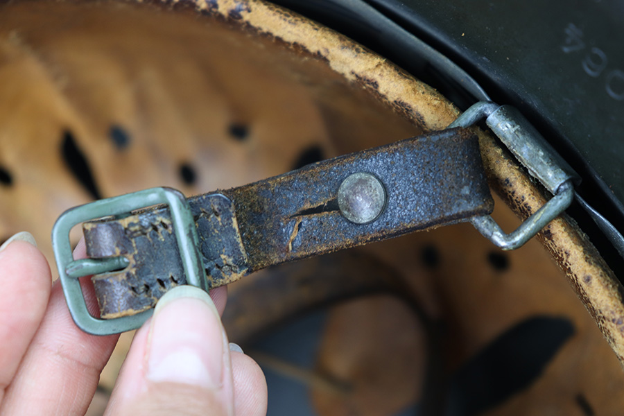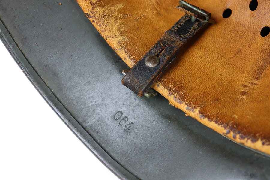 10/17/22 – This is an original German Heer army M40 helmet with the original leather chinstrap and liner. The helmet is a single decal exterior in great condition with no dents and minimal paint loss. Some typical surface patina and aging on the exterior shell but no major issues. The interior shell is maker and size stamped “Q64” near the right ear. The back visor is stamped “DN80” as shown. The metal liner band is in great shape and doesn’t show signs of tampering or alteration. The leather liner has some scuffing and surface wear but is still in great shape overall. The chin strap has some cracking and aging throughout, but mostly near the ends of the leather strap.