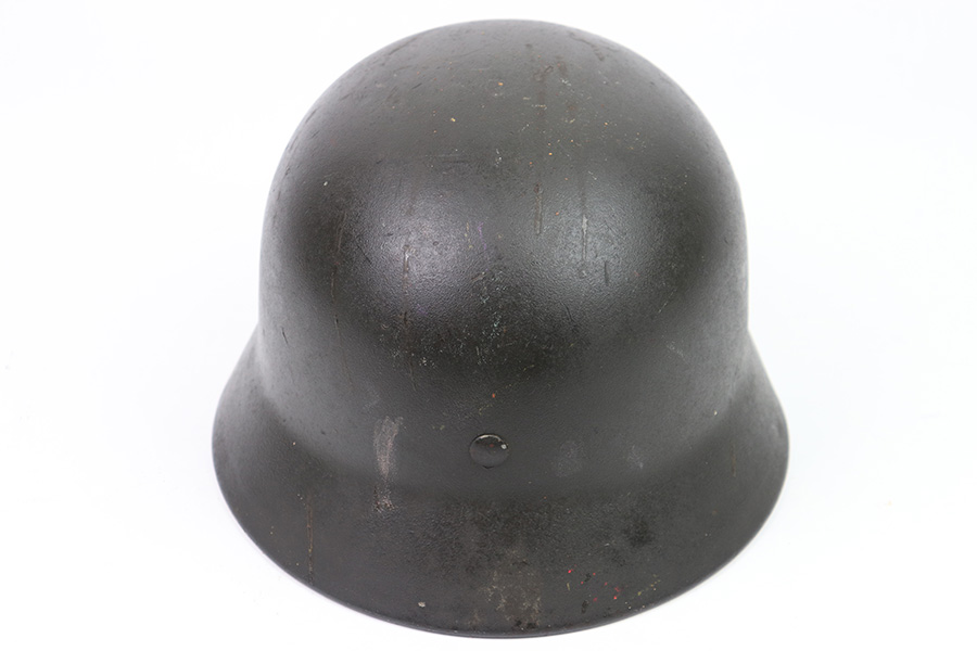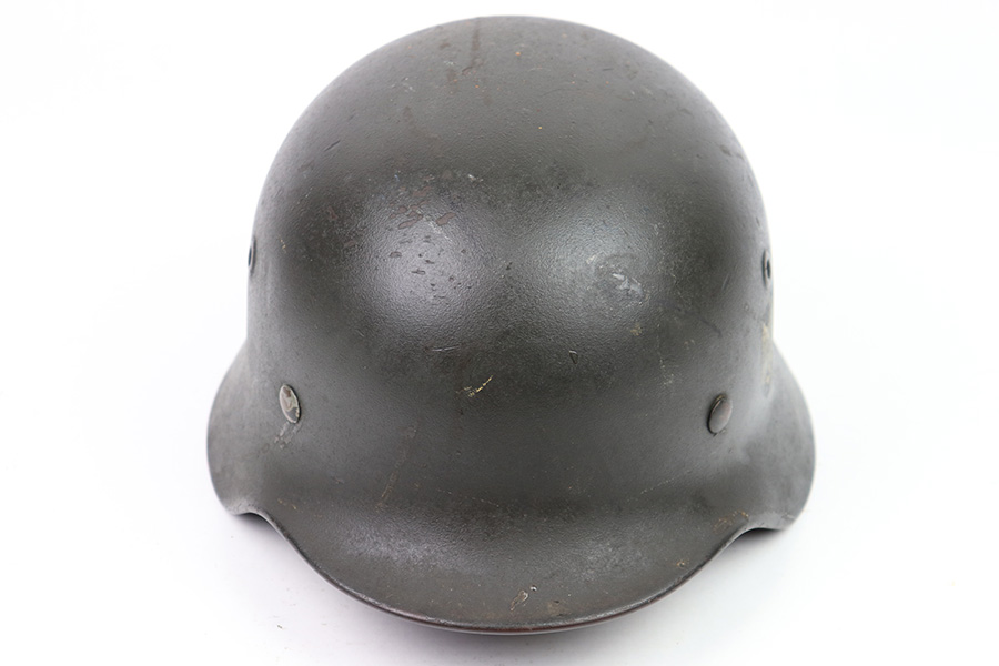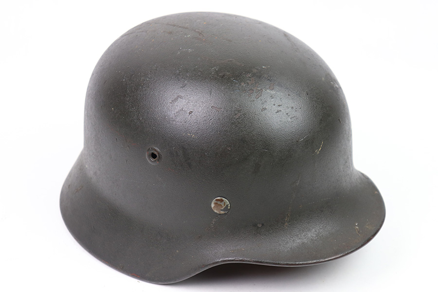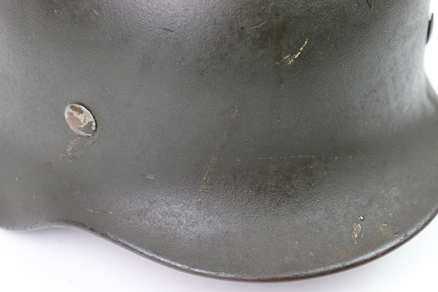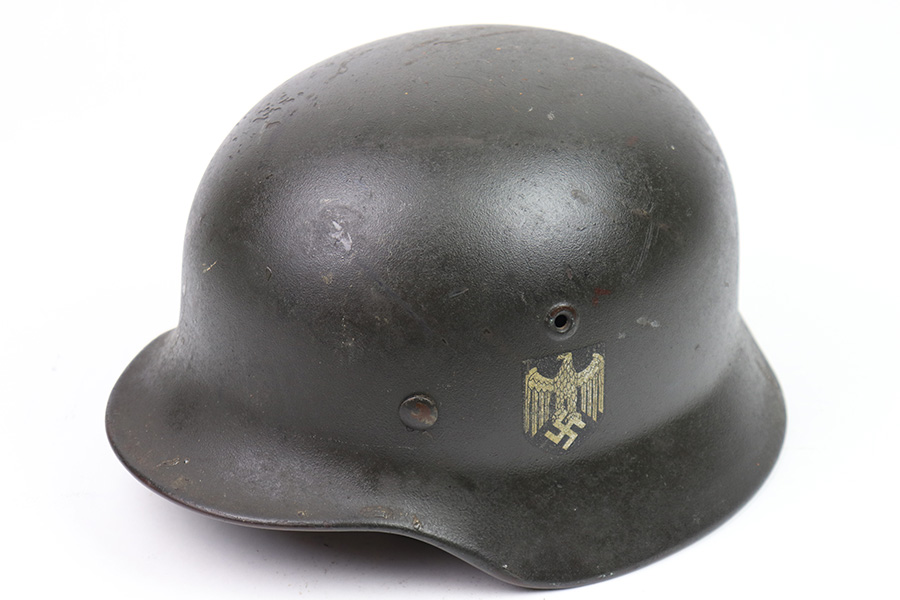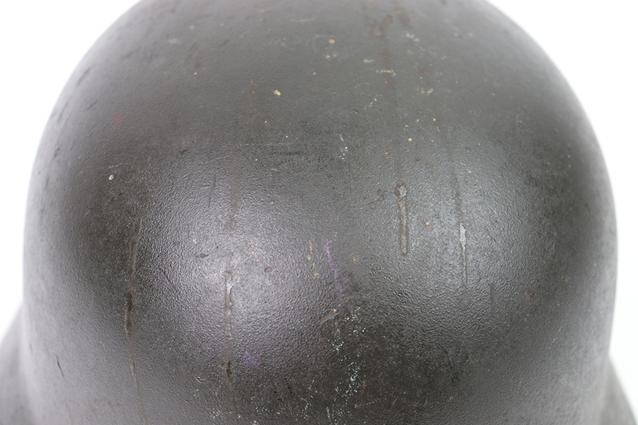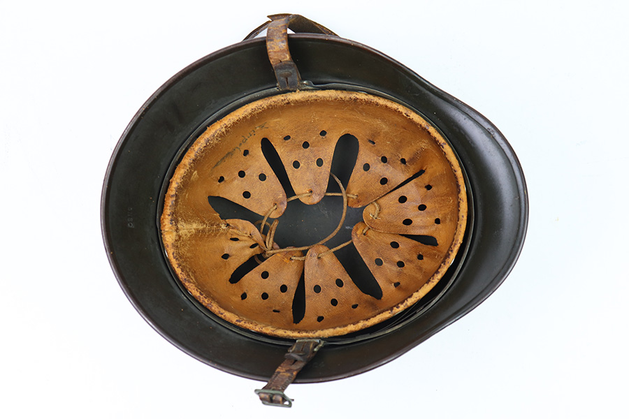 10/17/22 – This is an original German Heer army M40 helmet with the original leather chinstrap and liner. The helmet is a single decal exterior in great condition with no dents and minimal paint loss. Some typical surface patina and aging on the exterior shell but no major issues. The interior shell is maker and size stamped “Q64” near the right ear. The back visor is stamped “DN80” as shown. The metal liner band is in great shape and doesn’t show signs of tampering or alteration. The leather liner has some scuffing and surface wear but is still in great shape overall. The chin strap has some cracking and aging throughout, but mostly near the ends of the leather strap.