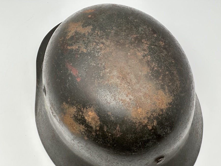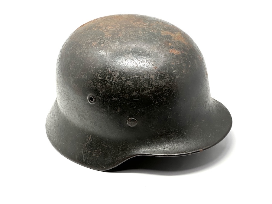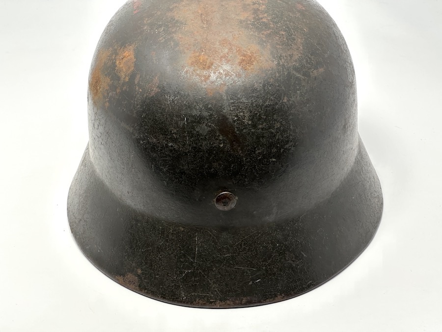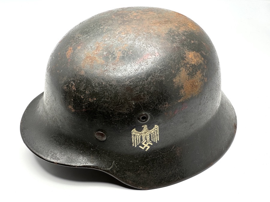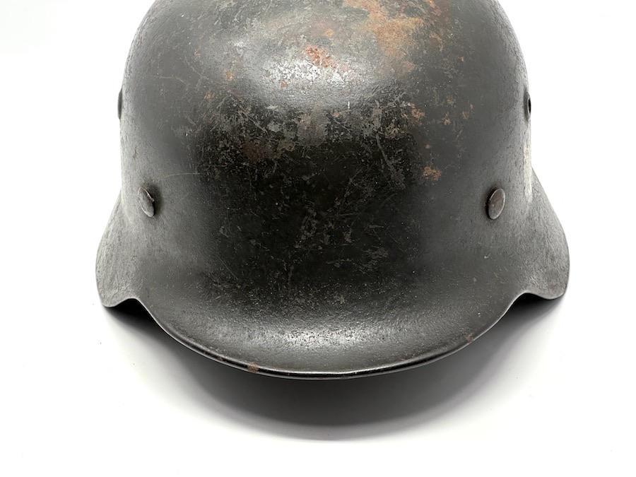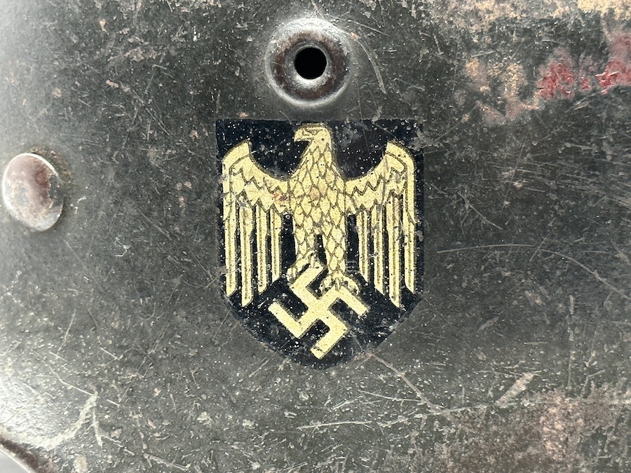 6/13/23 – This is an all original WW2 M40 German Heer Army Helmet. The Heer Army decal is about 85%-90% condition. The exterior of the shell has normal patina with some discoloration as well as some minor surface rust on the top crown, however there is no deep pitting or loss of structural integrity. The helmet is free of dents as well. The interior of the shell is maker stamped “SE” and size 64. The back visor is numbered 9806. The interior leather is all original and fully intact including the chin strap. The leather itself has some fading but little to no wrinkling but has fairly good pliability with the chin strap having a lot of cracking and wrinkling.