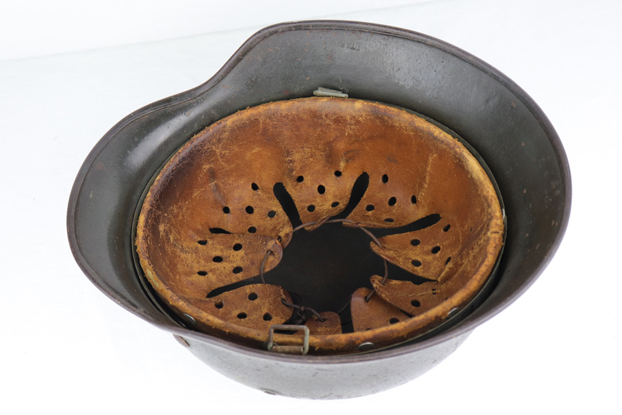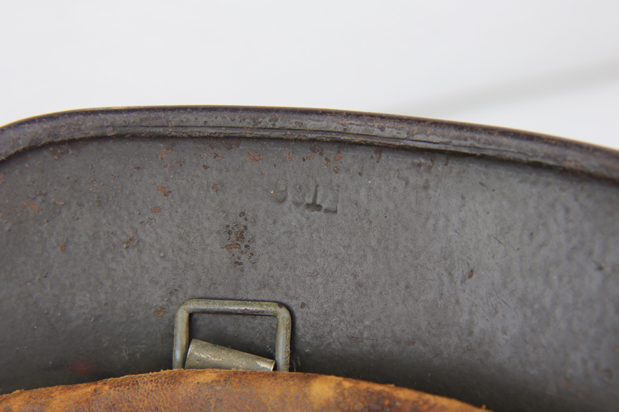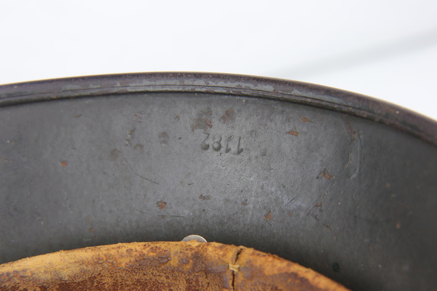 2/6/19 – This is a WW2 production German Kriegsmarine issued helmet (navy). The helmet is a model 40 and size 66. The interior is maker code stamped ET as well and serial numbered “1182”. The helmet has a single decal German eagle that’s gold colored which indicates Kriegsmarine. The exterior shell has no dents, but there is some rust color and missing paint. The interior has more normal wear and the liner has light scuffing and cracking throughout. Some of the leather is missing, but a majority is in tact. See photos!