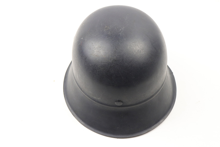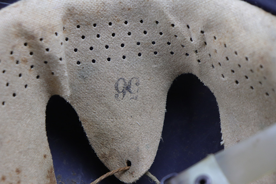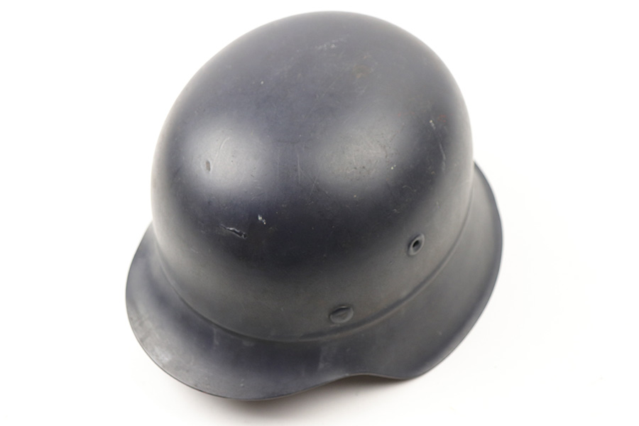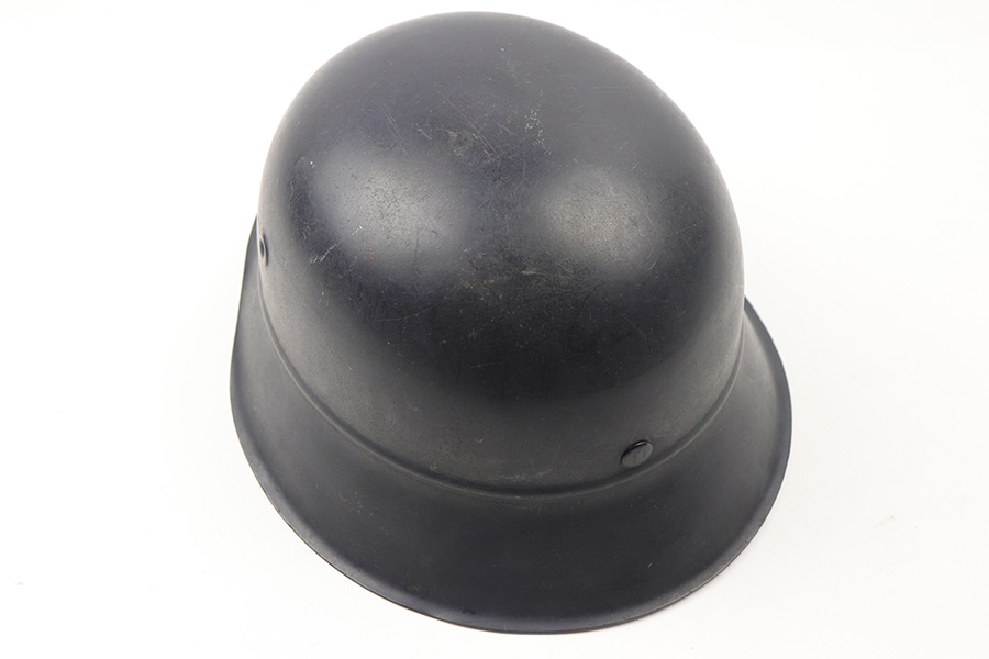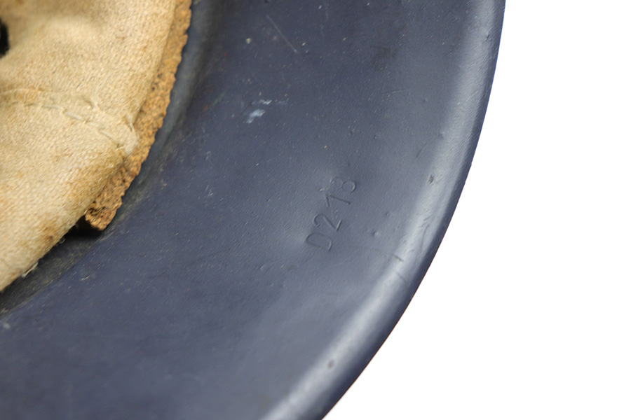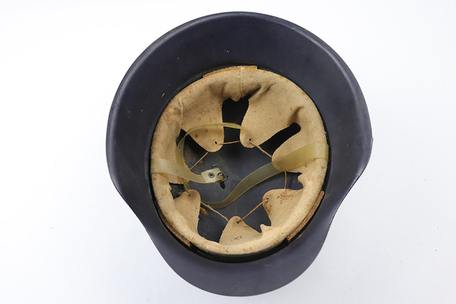 11/2/21 – This is an original M42 beaded helmet, as issued to civil police, Luftschutz, and factory guard personnel. The shell has dark blue paint throughout, in excellent overall condition. No dents and minimal paint loss. The interior of the shell is serial numbered and maker stamped “NS 64”. The leather liner is stamped “56” in ink and is in great condition. The helmet also features a rare, late WW2 production plastic chin strap. See photos.