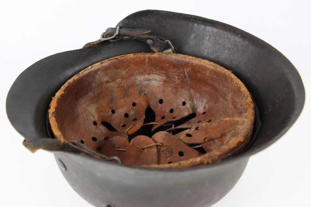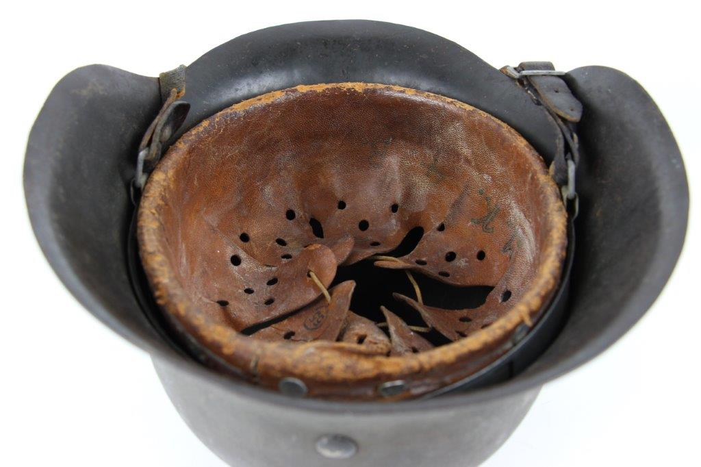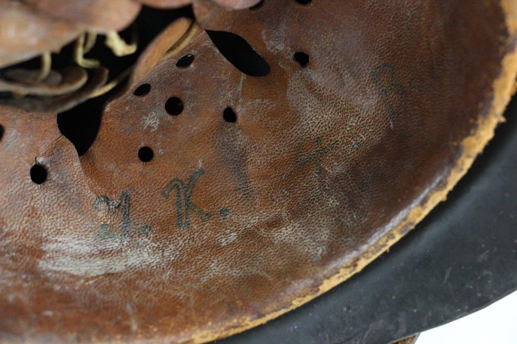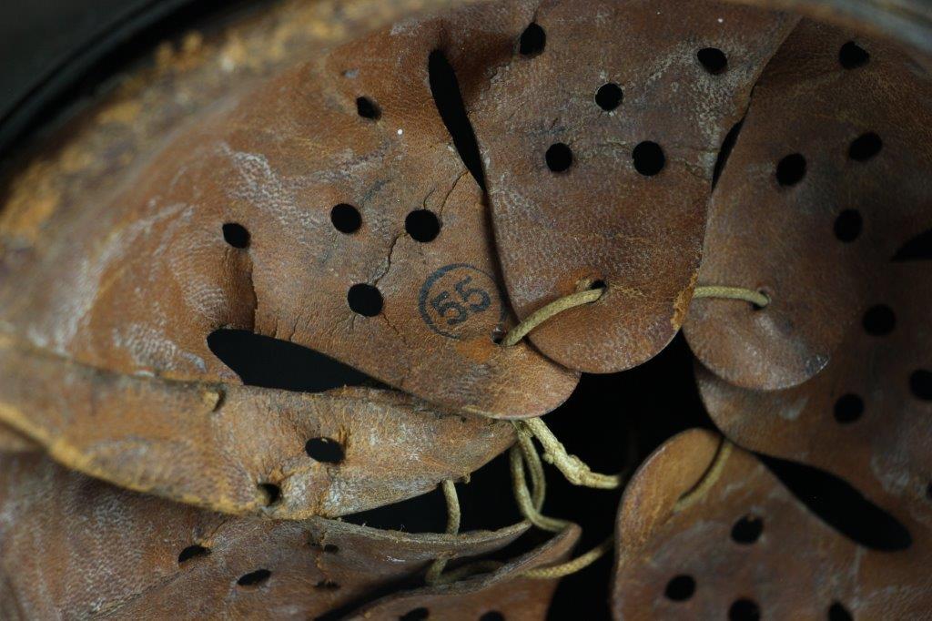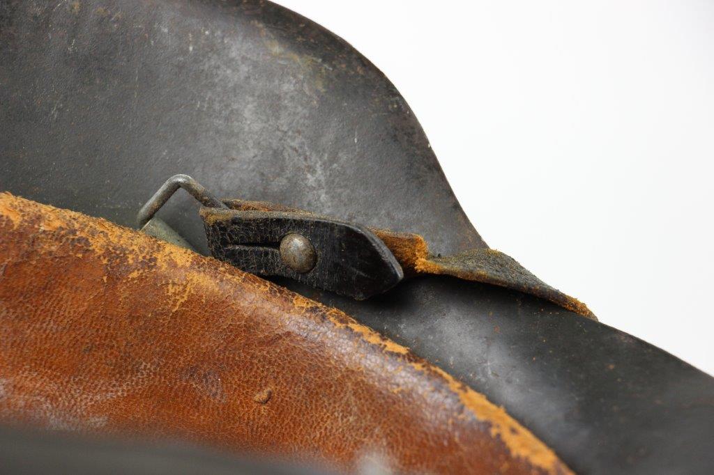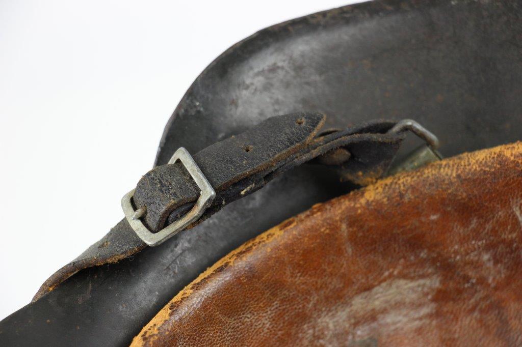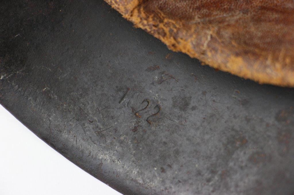7/18/24 – This is a later WW2 production M42 Single Decal Heer Army Helmet. The helmet is in very good overall condition with an original leather chinstrap and liner attached. The army decal on the exterior is mostly worn, with around 15-20% of the decal still visible. The helmet exterior also shows normal surface patina and mild discoloration. No dents or structural issues, and all original rivets intact. The shell interior has a faint maker and size stamp on the left side that’s difficult to read. We can tell the first letter is “E”, for “E.F.” (Emaillerwerke A.G.), and the last digit is a “2”, for size “62”. The back visor is lot numbered “1622”, but the 2nd digit is faint. Overall these faint, somewhat crudely stamped markings are indicative of late-war production. The leather chinstrap is in great overall condition, completely intact but there is one small rip beginning to form on the right side (shown in photos). The leather liner has scuffing and general wear / weakness around the top bend or rounded portion of the headband leather. Ink stamped size “55”. Initials “J.K.” handwritten on the leather. Interior shell crown is fairly clean.
