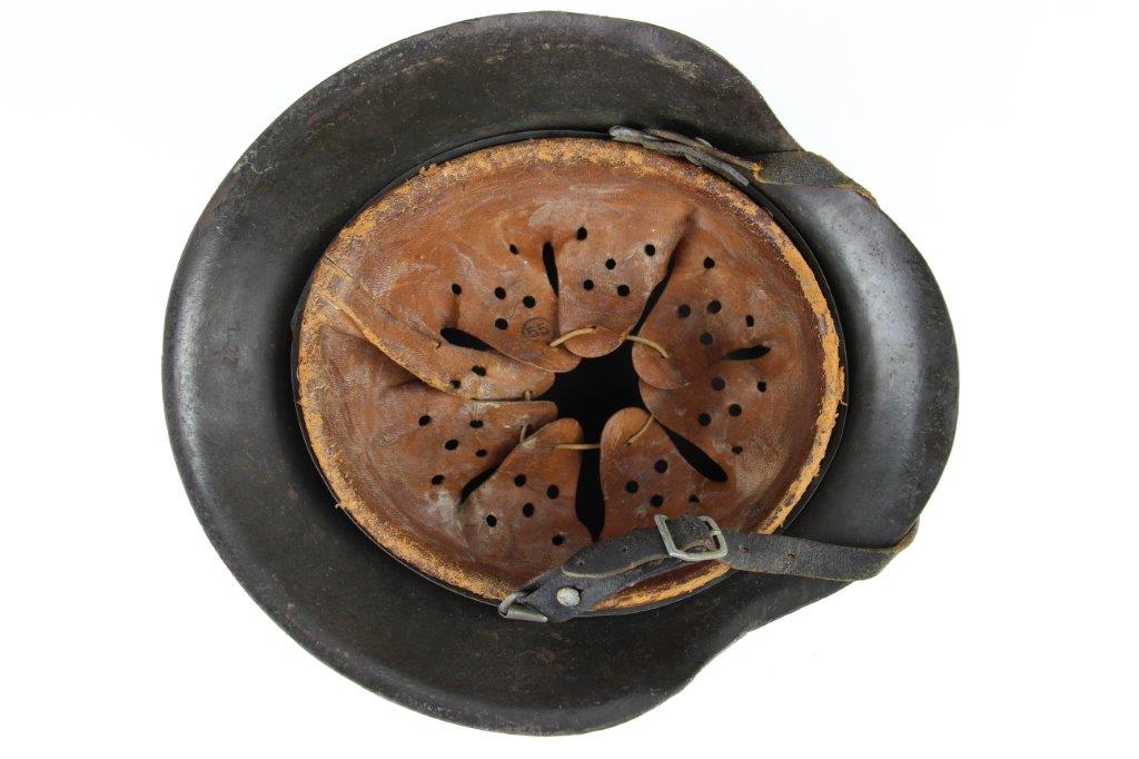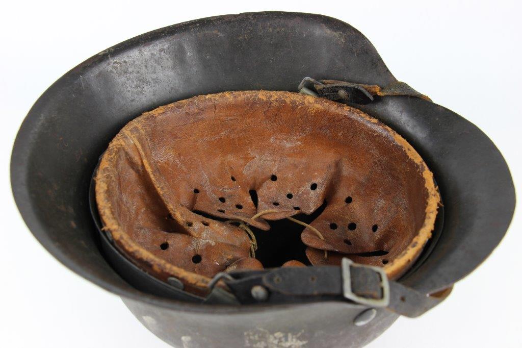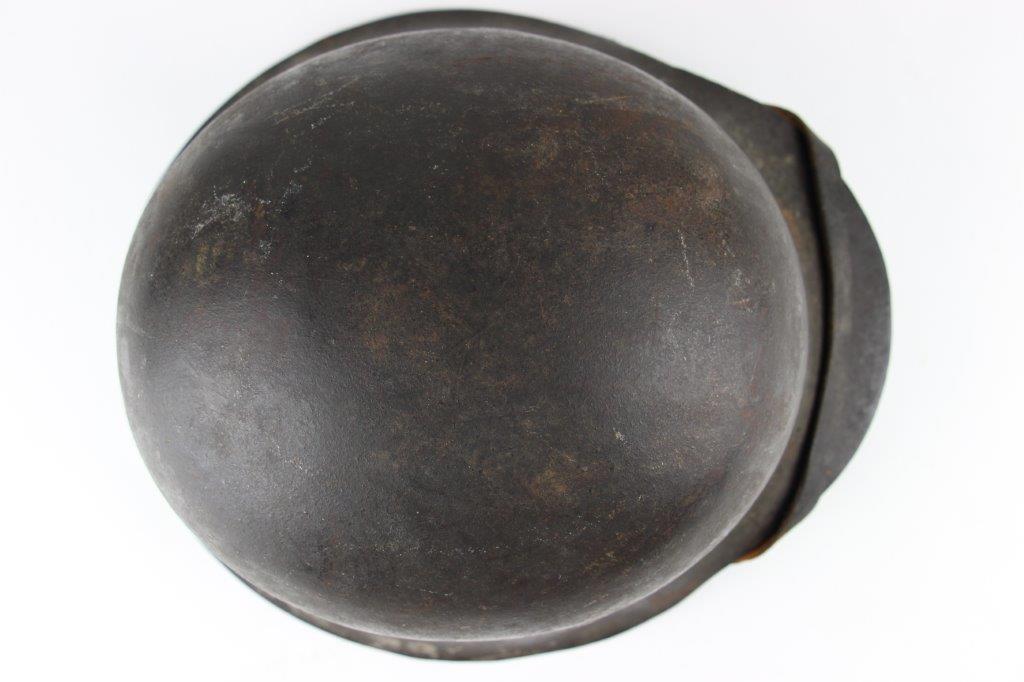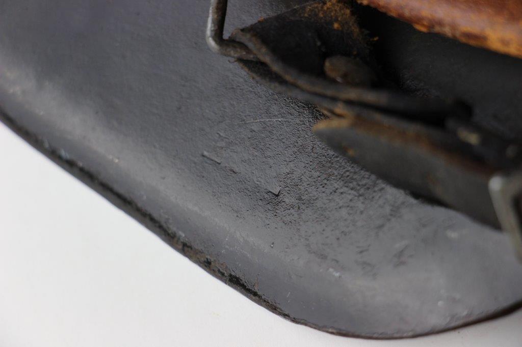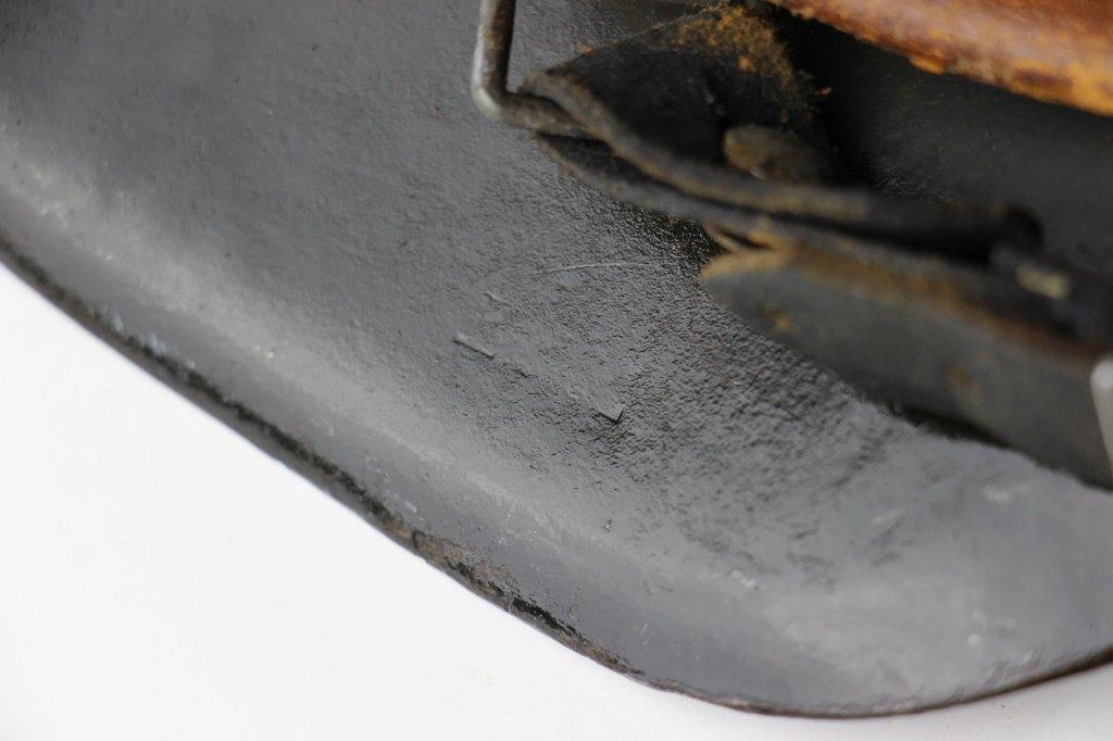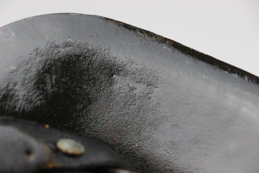 7/18/24 – This is a later WW2 production M42 Single Decal Heer Army Helmet. The helmet is in very good overall condition with an original leather chinstrap and liner attached. The army decal on the exterior is mostly worn, with around 15-20% of the decal still visible. The helmet exterior also shows normal surface patina and mild discoloration. No dents or structural issues, and all original rivets intact. The shell interior has a faint maker and size stamp on the left side that’s difficult to read. We can tell the first letter is “E”, for “E.F.” (Emaillerwerke A.G.), and the last digit is a “2”, for size “62”. The back visor is lot numbered “1622”, but the 2nd digit is faint. Overall these faint, somewhat crudely stamped markings are indicative of late-war production. The leather chinstrap is in great overall condition, completely intact but there is one small rip beginning to form on the right side (shown in photos). The leather liner has scuffing and general wear / weakness around the top bend or rounded portion of the headband leather. Ink stamped size “55”. Initials “J.K.” handwritten on the leather. Interior shell crown is fairly clean.