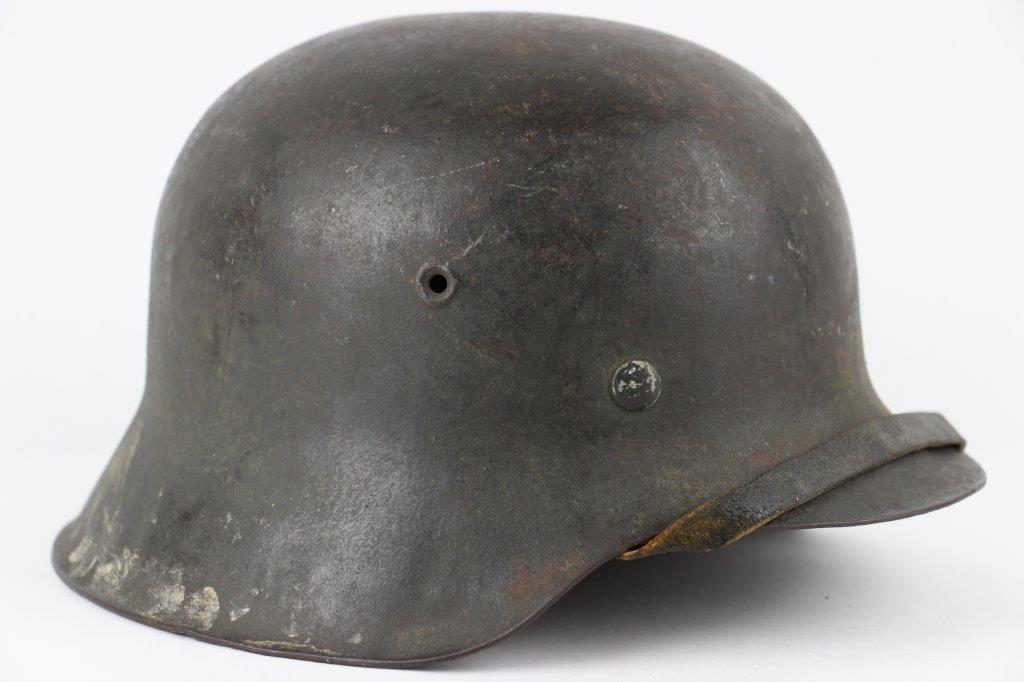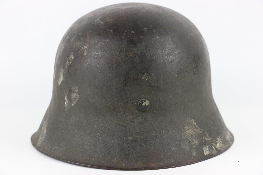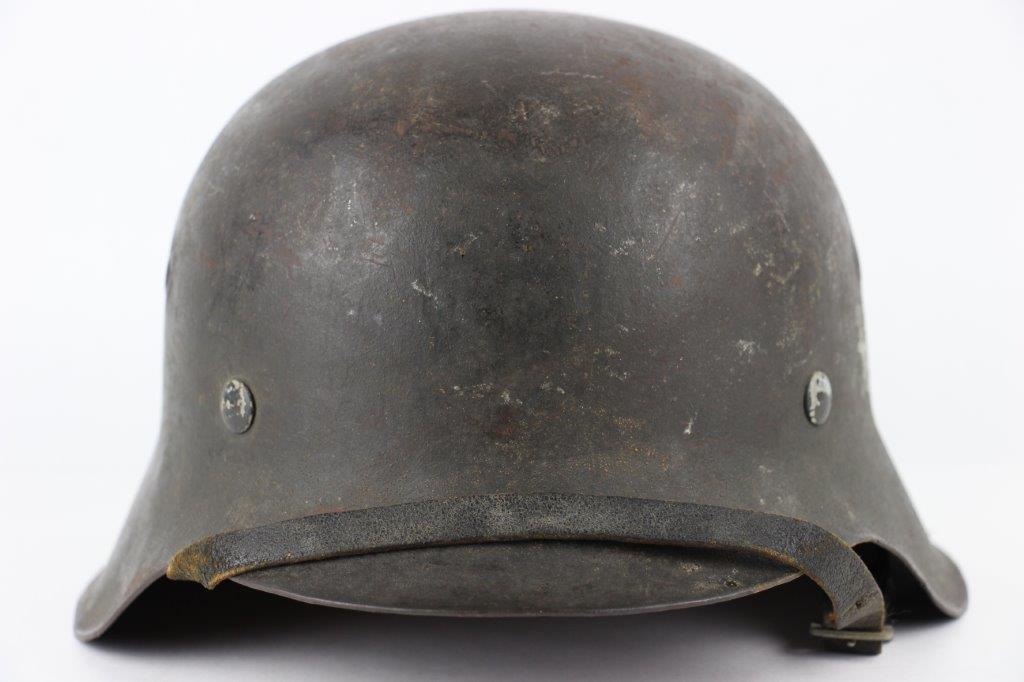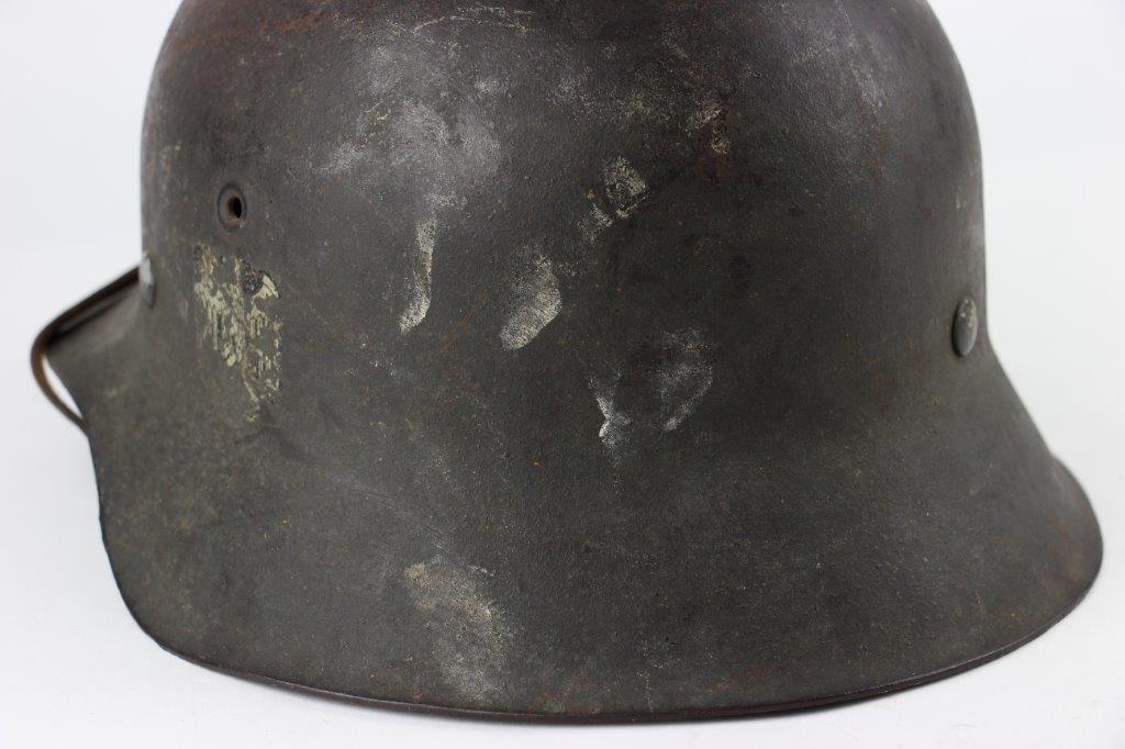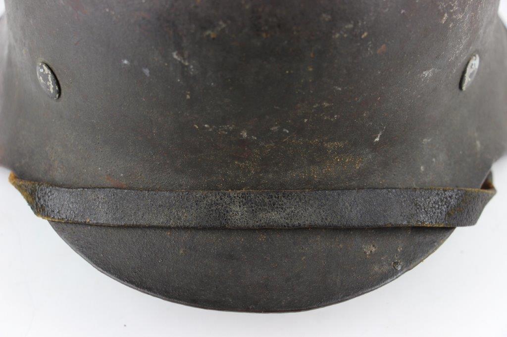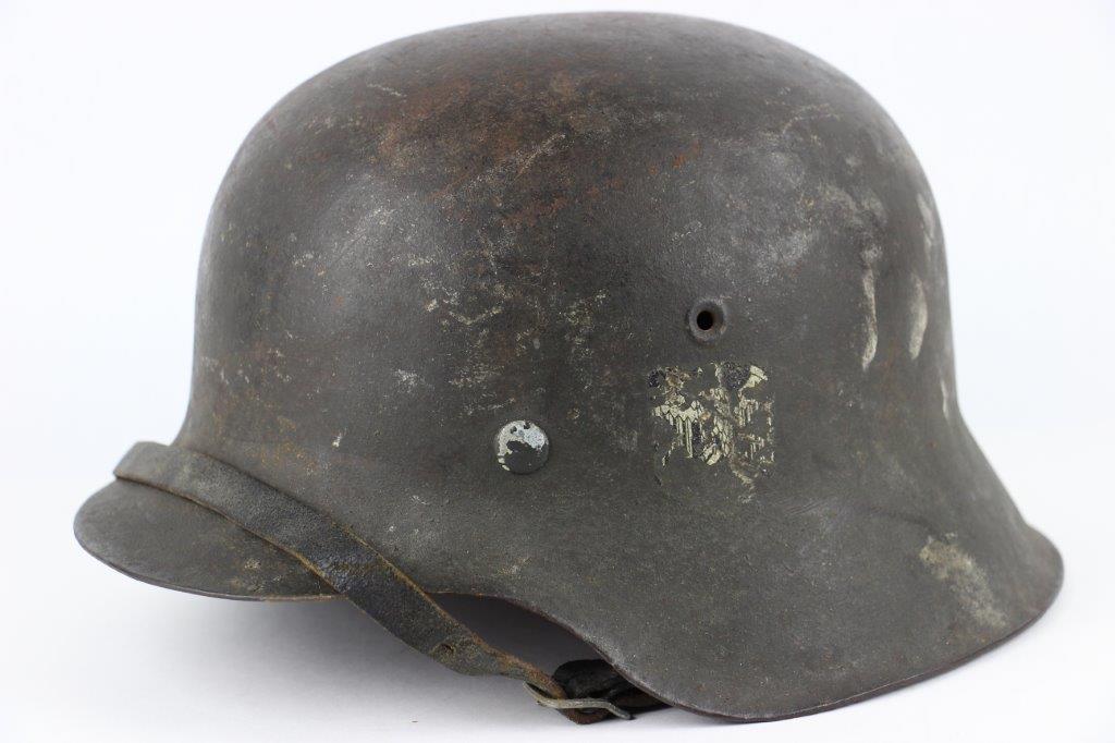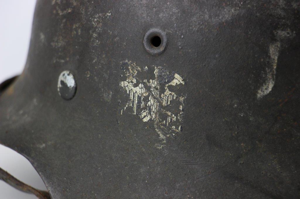 7/18/24 – This is a later WW2 production M42 Single Decal Heer Army Helmet. The helmet is in very good overall condition with an original leather chinstrap and liner attached. The army decal on the exterior is mostly worn, with around 15-20% of the decal still visible. The helmet exterior also shows normal surface patina and mild discoloration. No dents or structural issues, and all original rivets intact. The shell interior has a faint maker and size stamp on the left side that’s difficult to read. We can tell the first letter is “E”, for “E.F.” (Emaillerwerke A.G.), and the last digit is a “2”, for size “62”. The back visor is lot numbered “1622”, but the 2nd digit is faint. Overall these faint, somewhat crudely stamped markings are indicative of late-war production. The leather chinstrap is in great overall condition, completely intact but there is one small rip beginning to form on the right side (shown in photos). The leather liner has scuffing and general wear / weakness around the top bend or rounded portion of the headband leather. Ink stamped size “55”. Initials “J.K.” handwritten on the leather. Interior shell crown is fairly clean.