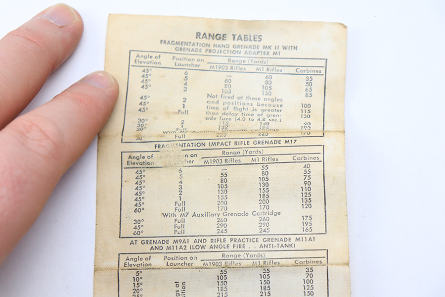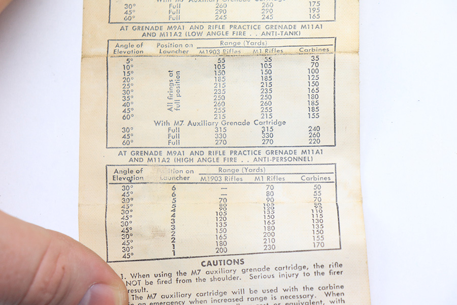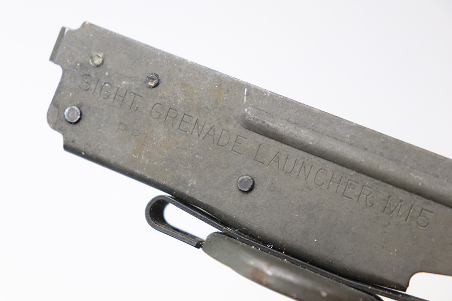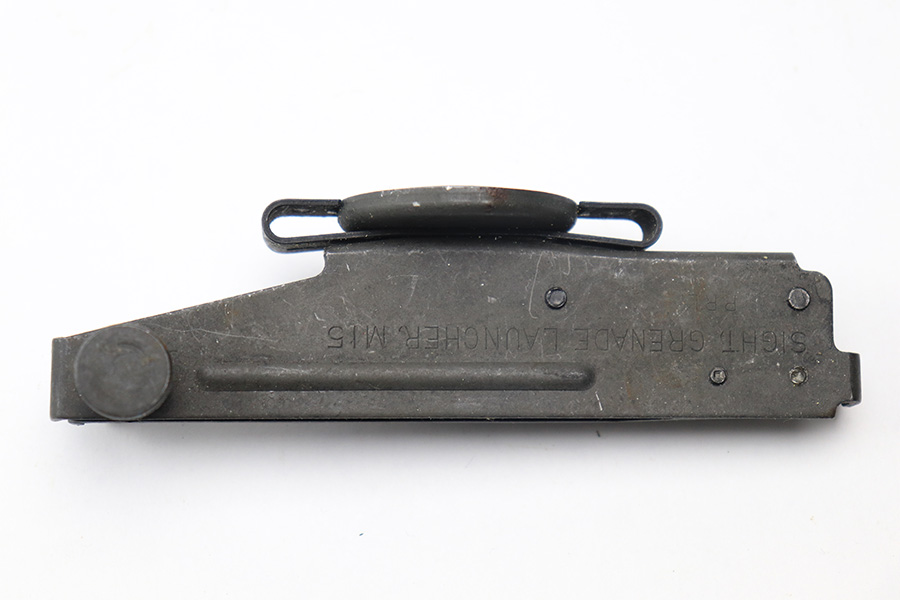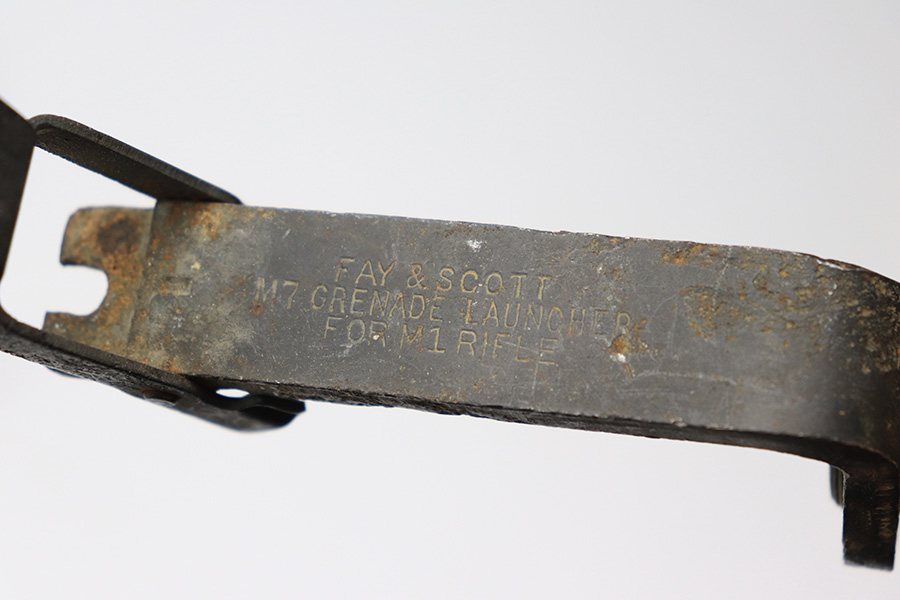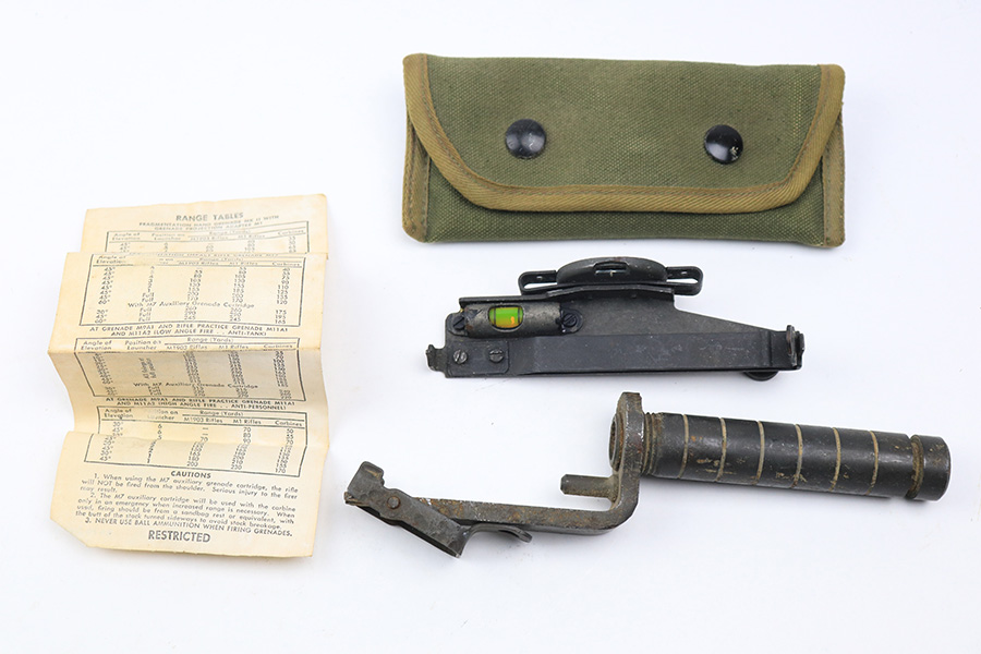 12/3/21 – This is a M7 grenade launcher and M15 grenade launcher sight, both intended for use with M1903, M1, and M1 carbine rifles. The sight comes with both a carrying pouch and a range table sheet. The grenade launcher slides onto the end of a rifle barrel and a M22 grenade then fits into the launcher. A blank round is then fired through the rifle, projecting the grenade much further then it could be thrown, approximately 300 yards depending upon grenade model and angle of trajectory. The sight has light wear throughout with light oxidation. The launcher has minor pitting in various places throughout its metal but does not appear to have any issues functioning as intended. The sight carrying pouch is in great shape and has an ink stamp on the interior of the canvas as shown.