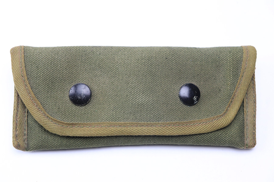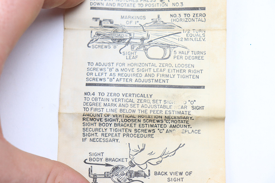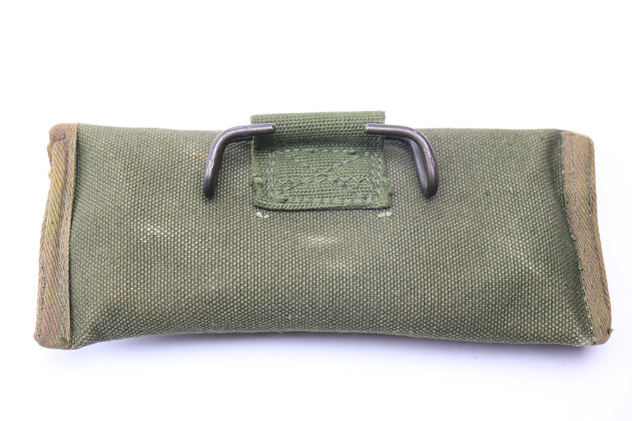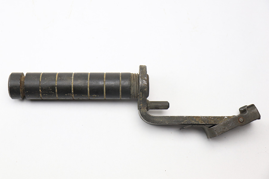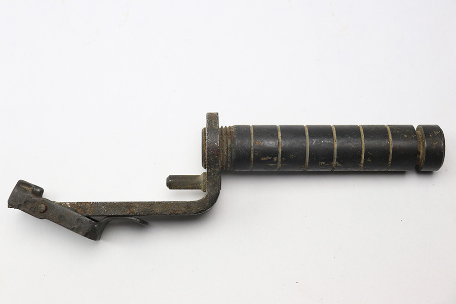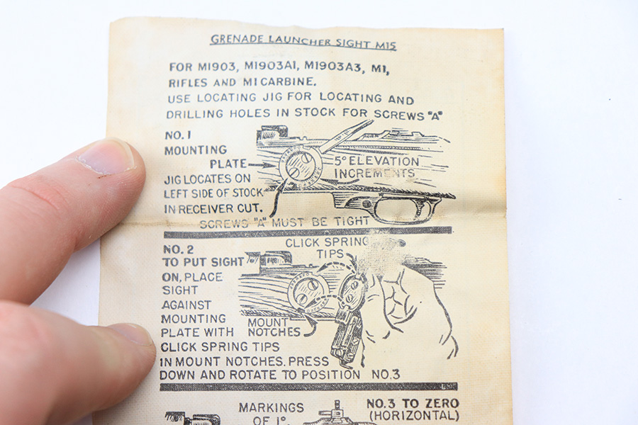 12/3/21 – This is a M7 grenade launcher and M15 grenade launcher sight, both intended for use with M1903, M1, and M1 carbine rifles. The sight comes with both a carrying pouch and a range table sheet. The grenade launcher slides onto the end of a rifle barrel and a M22 grenade then fits into the launcher. A blank round is then fired through the rifle, projecting the grenade much further then it could be thrown, approximately 300 yards depending upon grenade model and angle of trajectory. The sight has light wear throughout with light oxidation. The launcher has minor pitting in various places throughout its metal but does not appear to have any issues functioning as intended. The sight carrying pouch is in great shape and has an ink stamp on the interior of the canvas as shown.