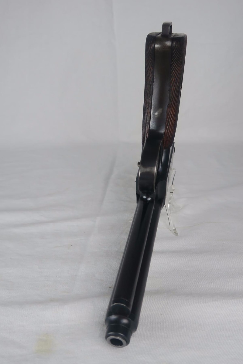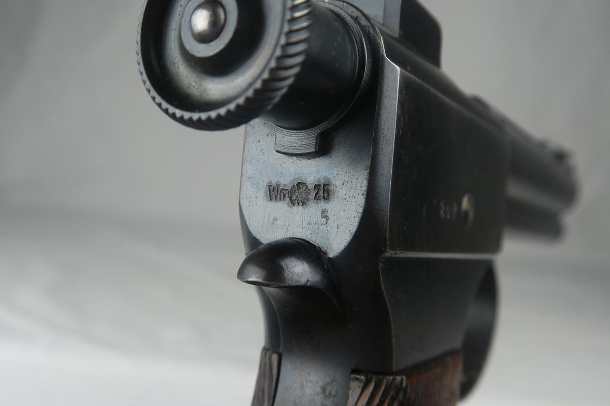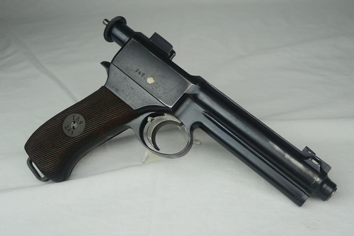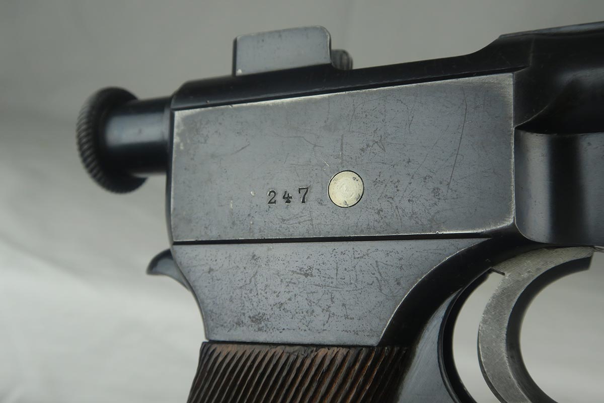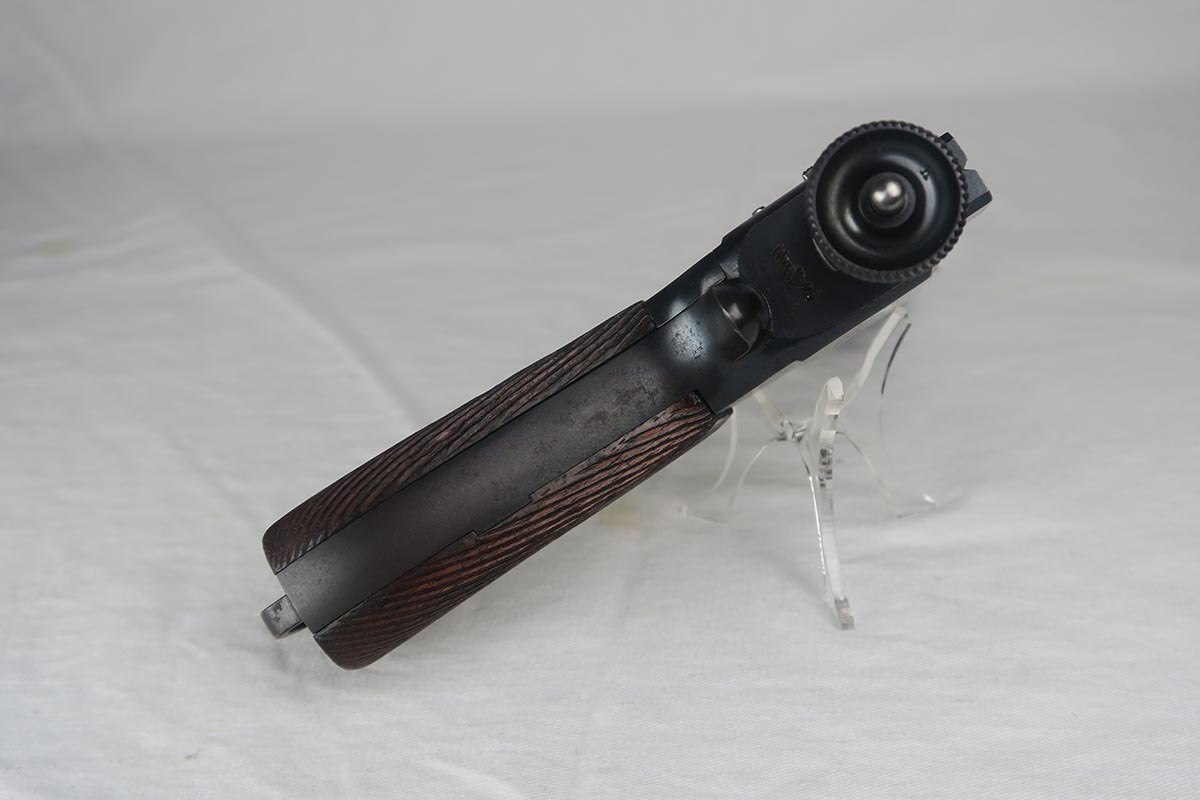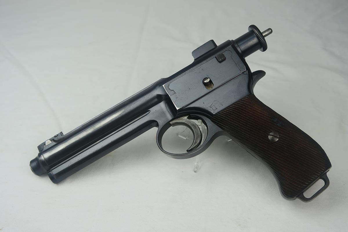 10/3/17 – The M7 Roth Steyr in 8mm was adopted by the Austro-Hungarian Army in 1907. Some portion of the production was contracted to Fegyvergyar in Budapest, including the pistol listed here. It is 1925 dated with the Austro-Hungarian eagle on the back of the pistol. The pistol is all original and correct, with maybe 90-92% bluing remaining. There is some wear on both sides of the slide and the straps show a decent amount of patina. This pistol has a very early serial and is a subvariation 1 gun. The disc in the right grip panel is unit marked. Minty bore. The holster is not included.