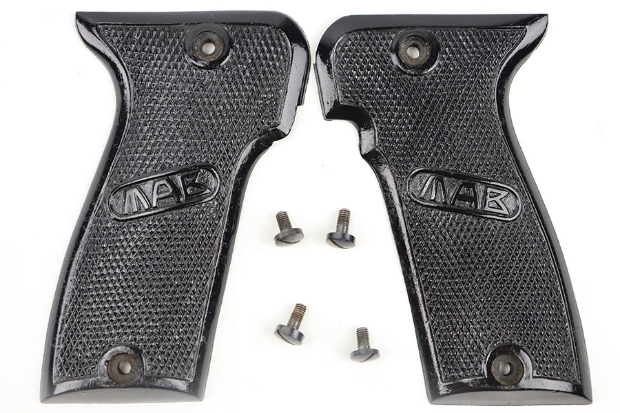 12/4/23 – This is an original pair of French MAB model D pistol grips. The grips come with two sets of screws, as shown in photos. Excellent condition.