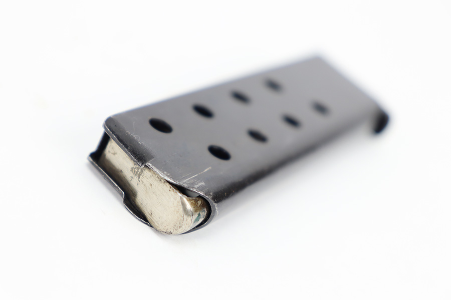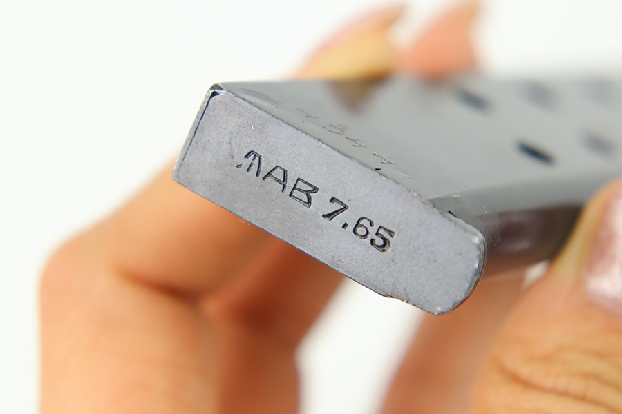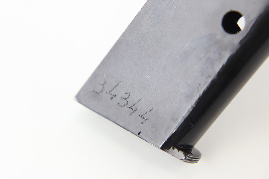 1/2/24 – This is an original French MAB model D magazine in 7.65mm. The magazine is in great condition with very nice original finish throughout and a fully functional spring. The right side of the tube is etched with a serial number “34344”. This was added post-factory. The base of the magazine is stamped “MAB 7.65”. No other markings.