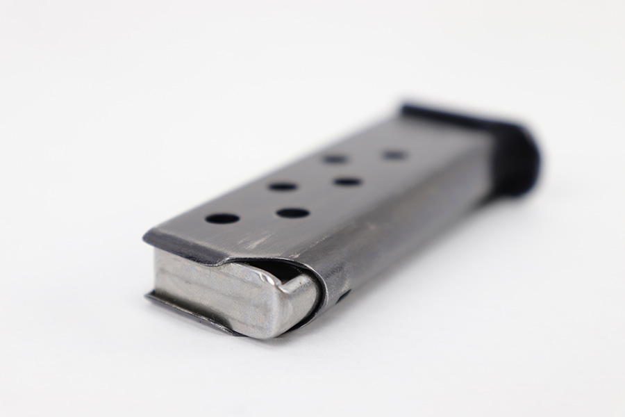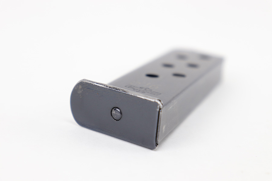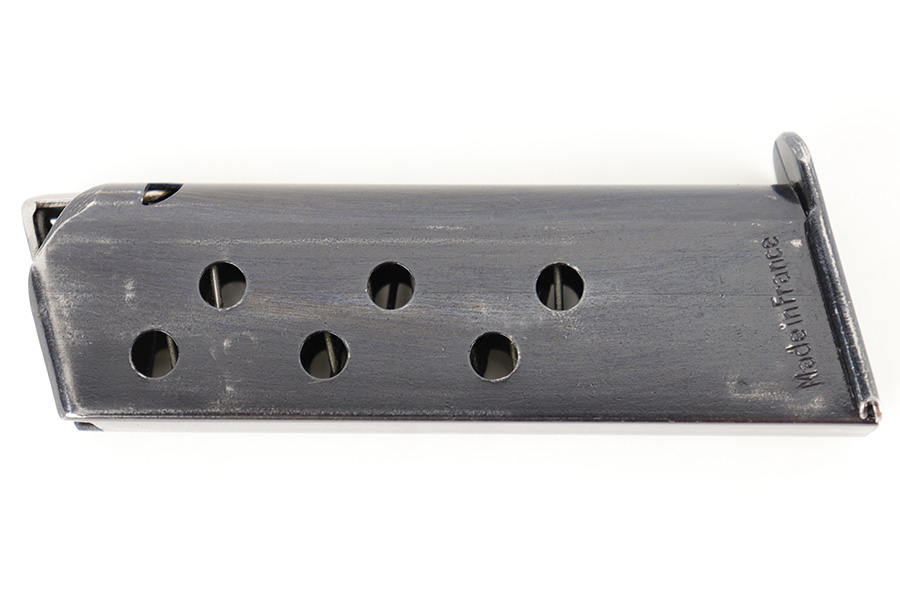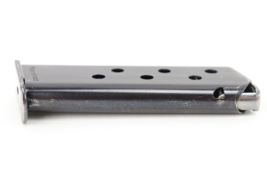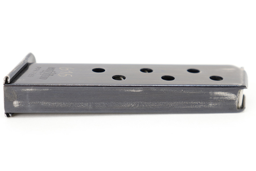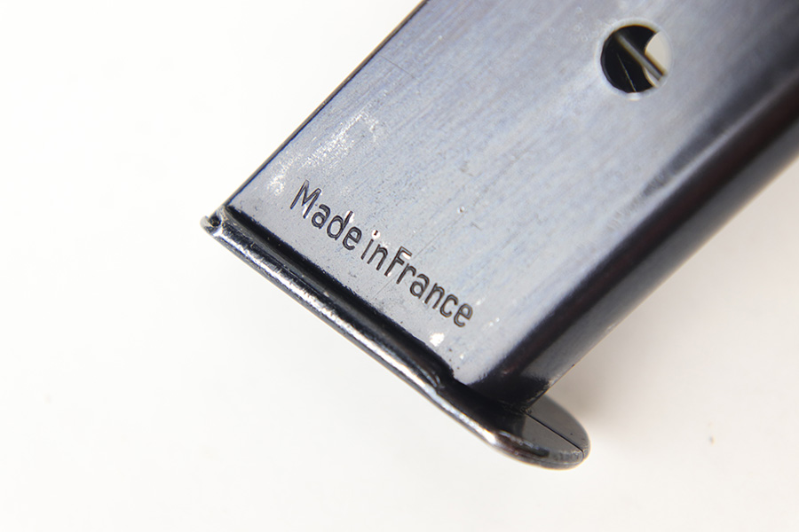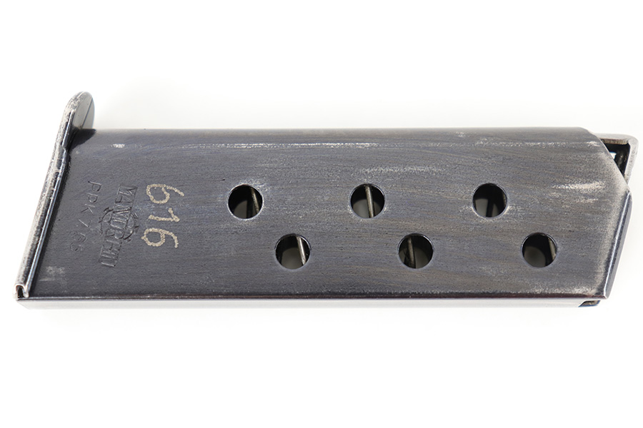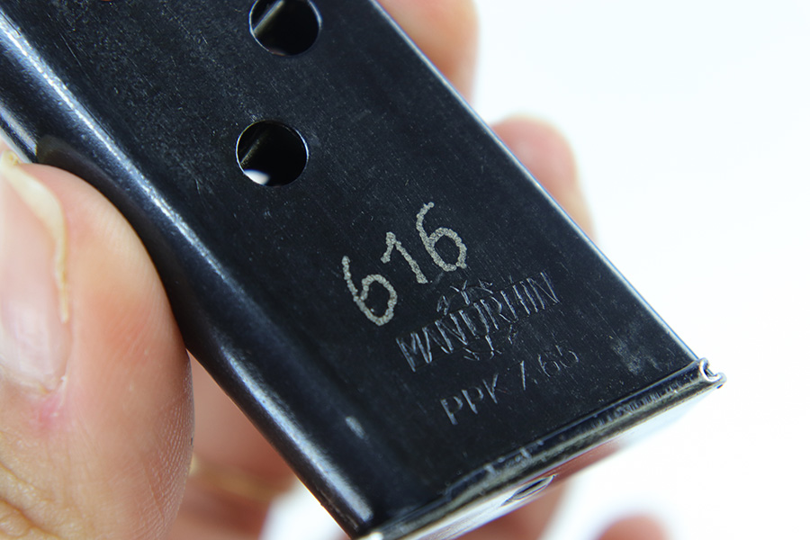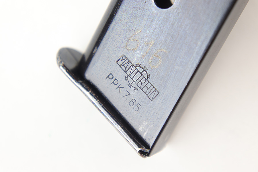 7/25/23 – This is an original French Manurhin production Walther PPK magazine. The magazine is in great condition with all original finish, although there’s an added serial number “616” on the left side of the frame, just above the Manurhin logo. The right side of the frame is stamped “Made in France”. There’s some mild finish loss but no rust or pitting and a fully functional spring.