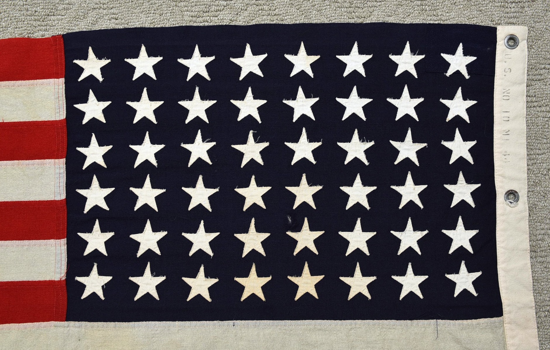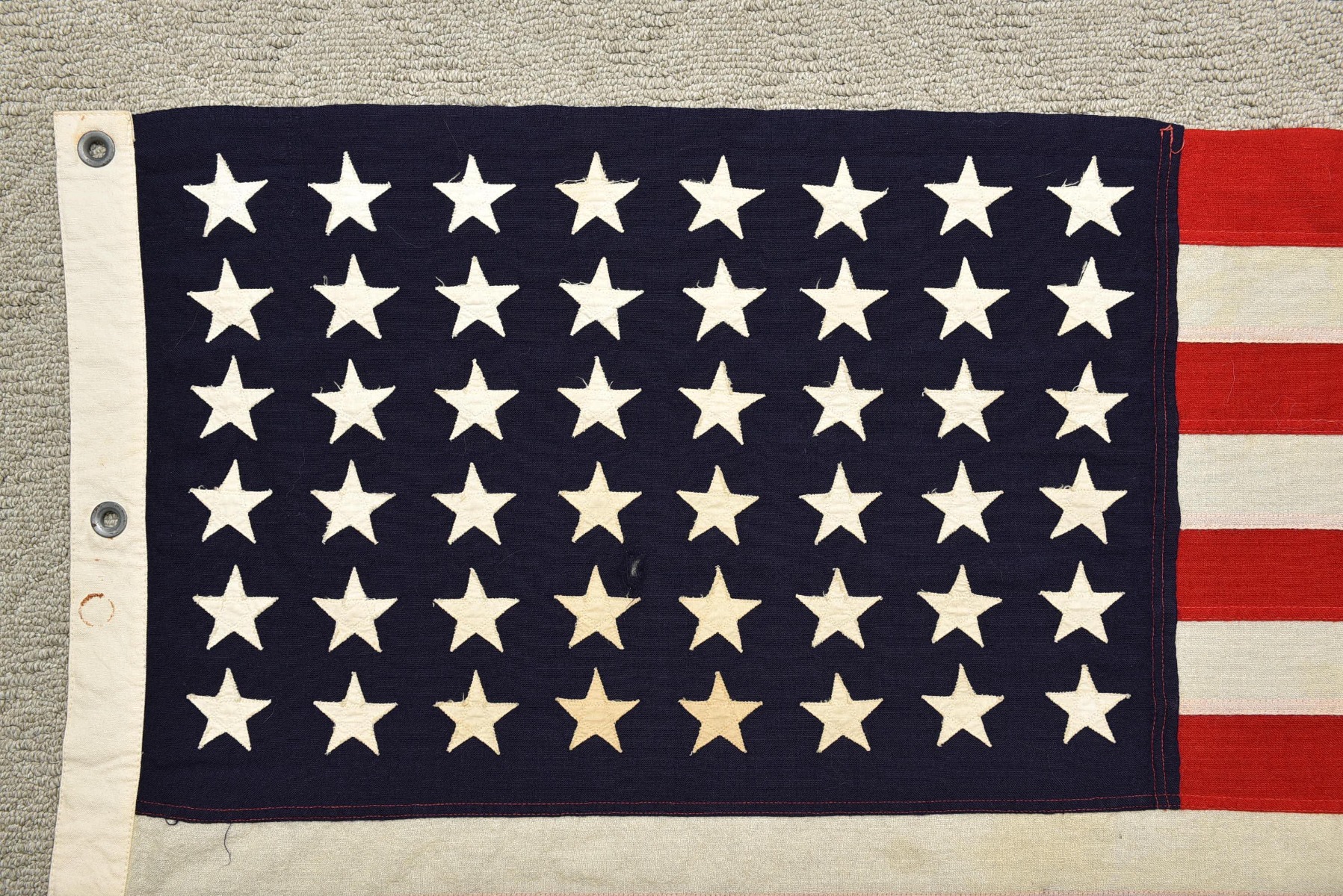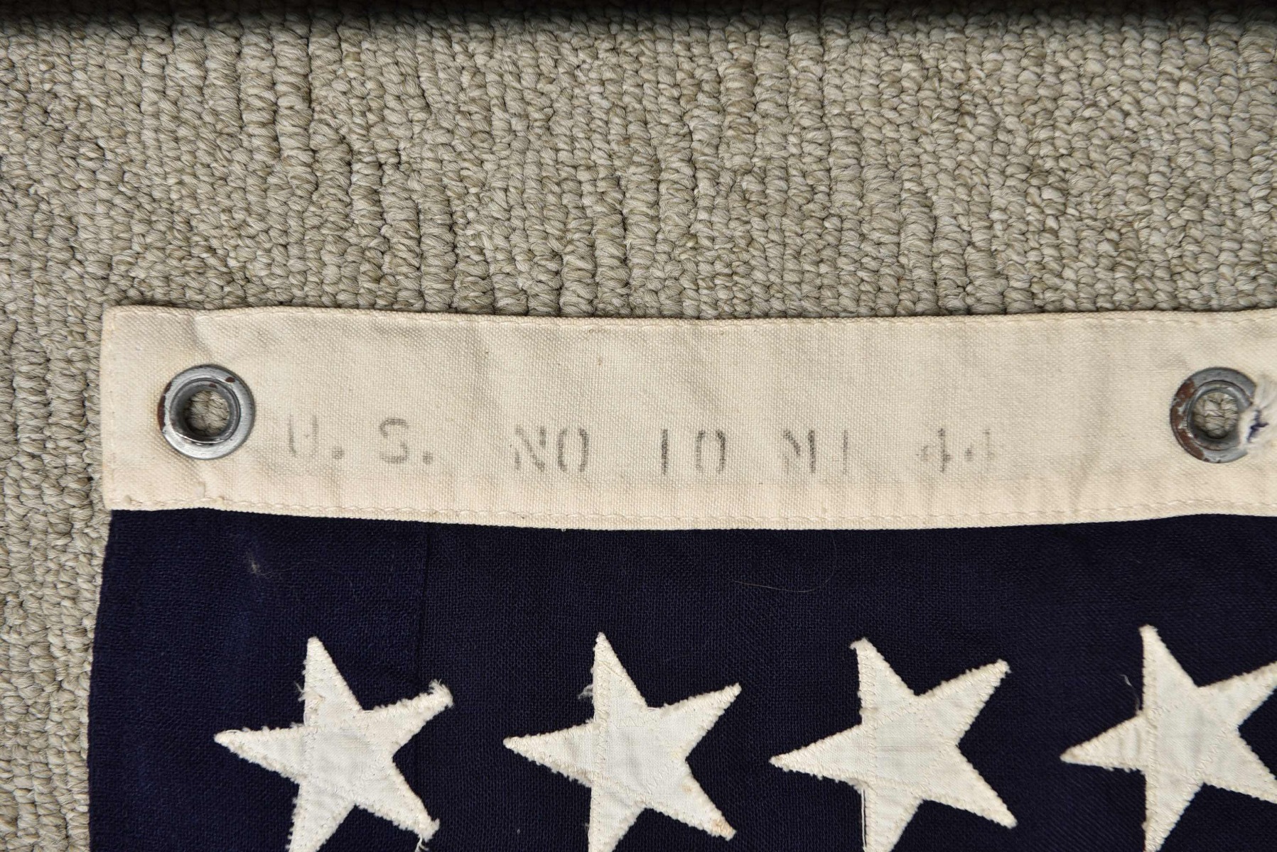 8/12/21 – This is an original US Mare Island No 10 flag from WW2. The flag is ink stamped “U.S. No 10 MI 44”. The number 10 corresponds to the flag size, which is 2.9 x 5.51 feet. The flag has 48 sewn-on stars, and is in great overall condition. There is a small hole just under the 2nd row of stars, and this is the only significant damage on the entire flag. The hole is small and can be seen in photos. There’s also some mild yellowing on a few stars, but overall this flag is in great condition.
