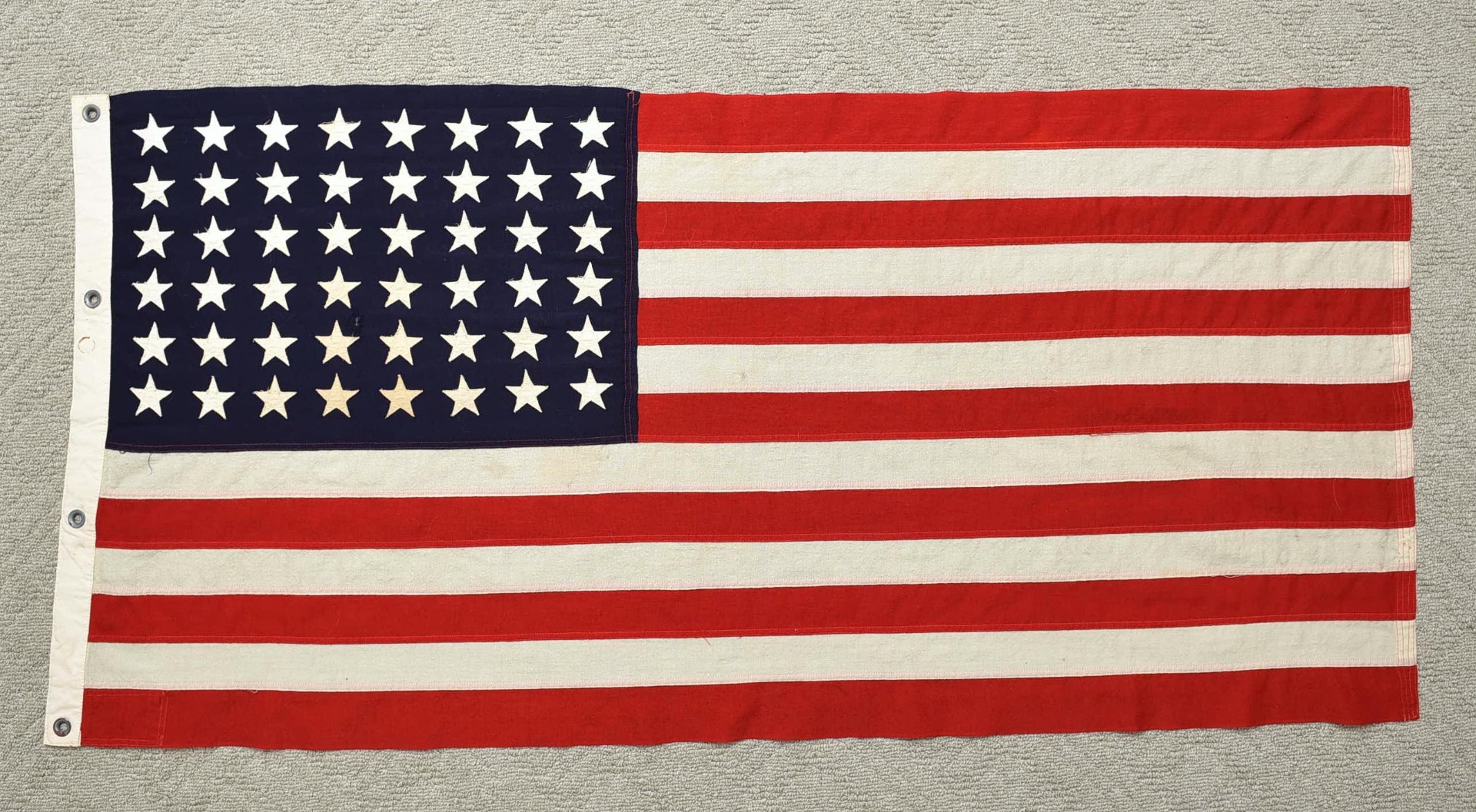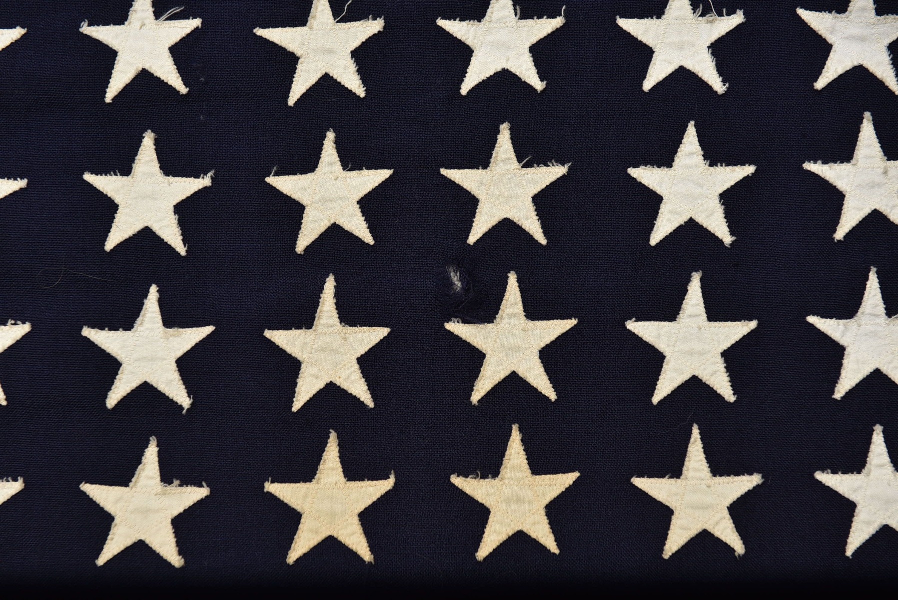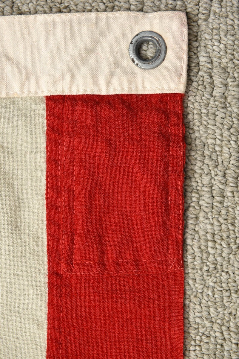 8/12/21 – This is an original US Mare Island No 10 flag from WW2. The flag is ink stamped “U.S. No 10 MI 44”. The number 10 corresponds to the flag size, which is 2.9 x 5.51 feet. The flag has 48 sewn-on stars, and is in great overall condition. There is a small hole just under the 2nd row of stars, and this is the only significant damage on the entire flag. The hole is small and can be seen in photos. There’s also some mild yellowing on a few stars, but overall this flag is in great condition.