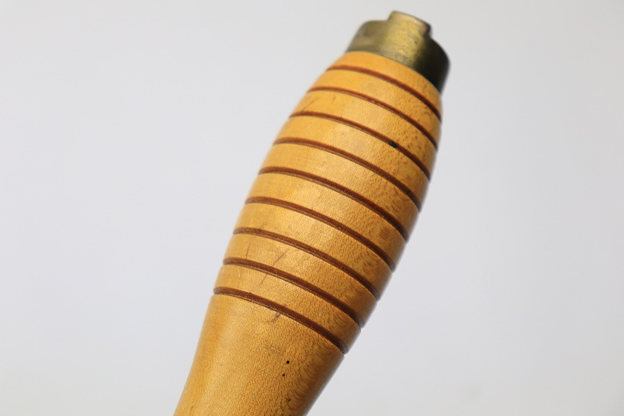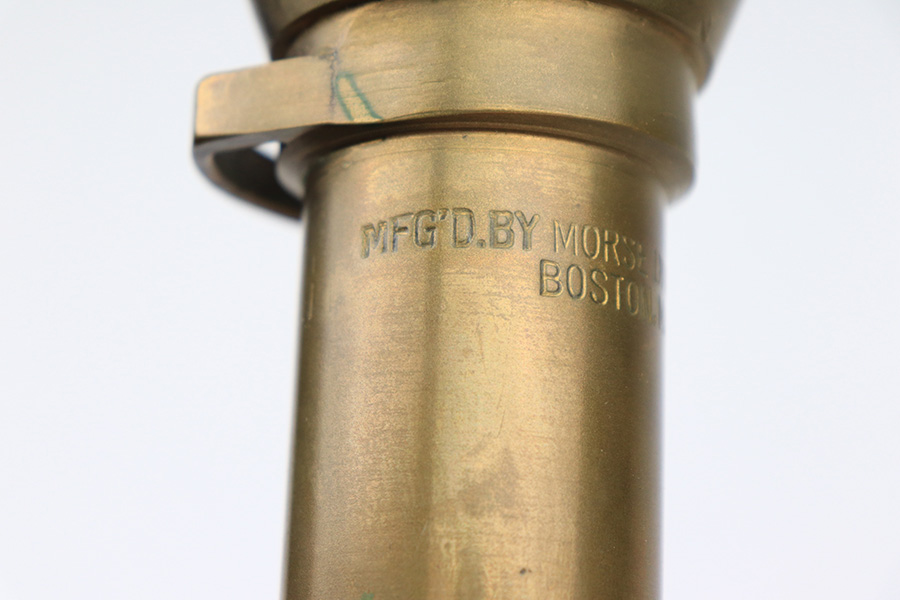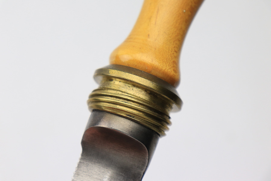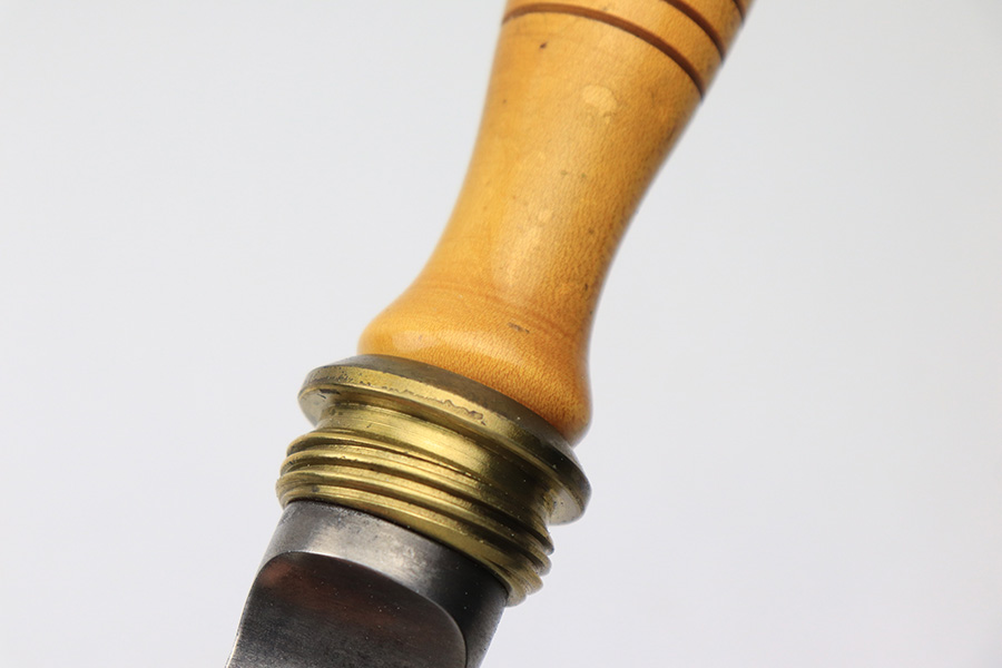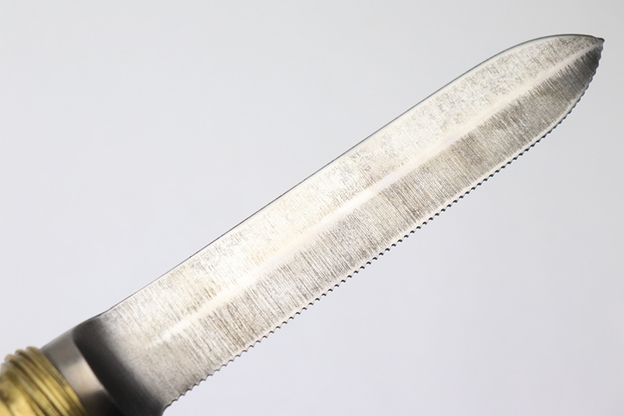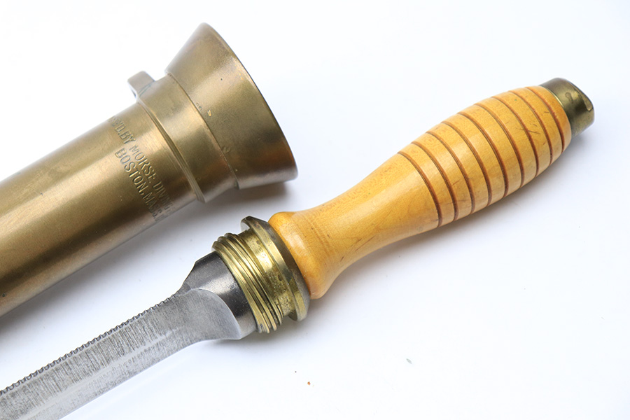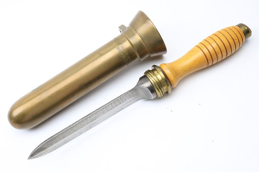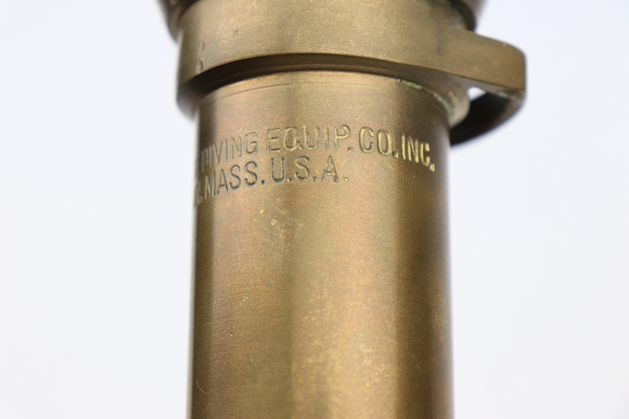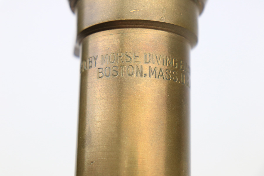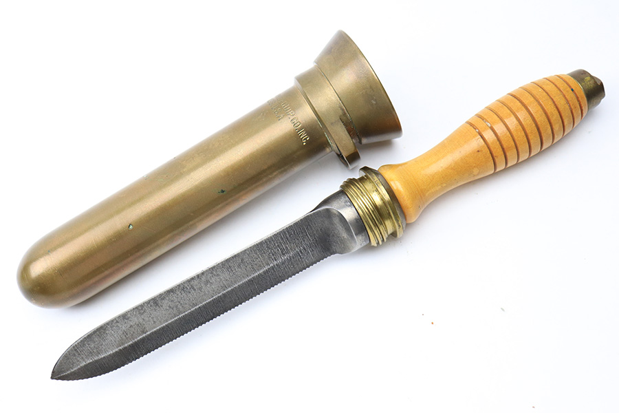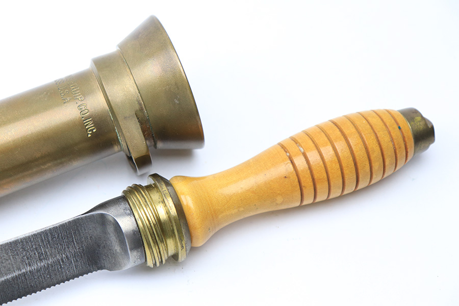 5/31/22 – This is an original US Navy WW2 Diving knife. Made by Morse Diving Equipment, and known as the Mark V diving knife, which accompanied the mark V diving helmet. The knife features a 6 7/8th inch blade that’s serrated on one edge. There’s some mild surface oxidation and aging throughout the blade but the edge is excellent and unsharpened. The wood handle has no cracks or chips and is excellent overall. The scabbard is brass and in excellent condition with a maker stamp near the mouth as shown.