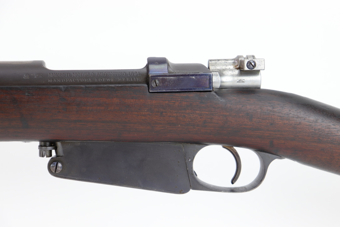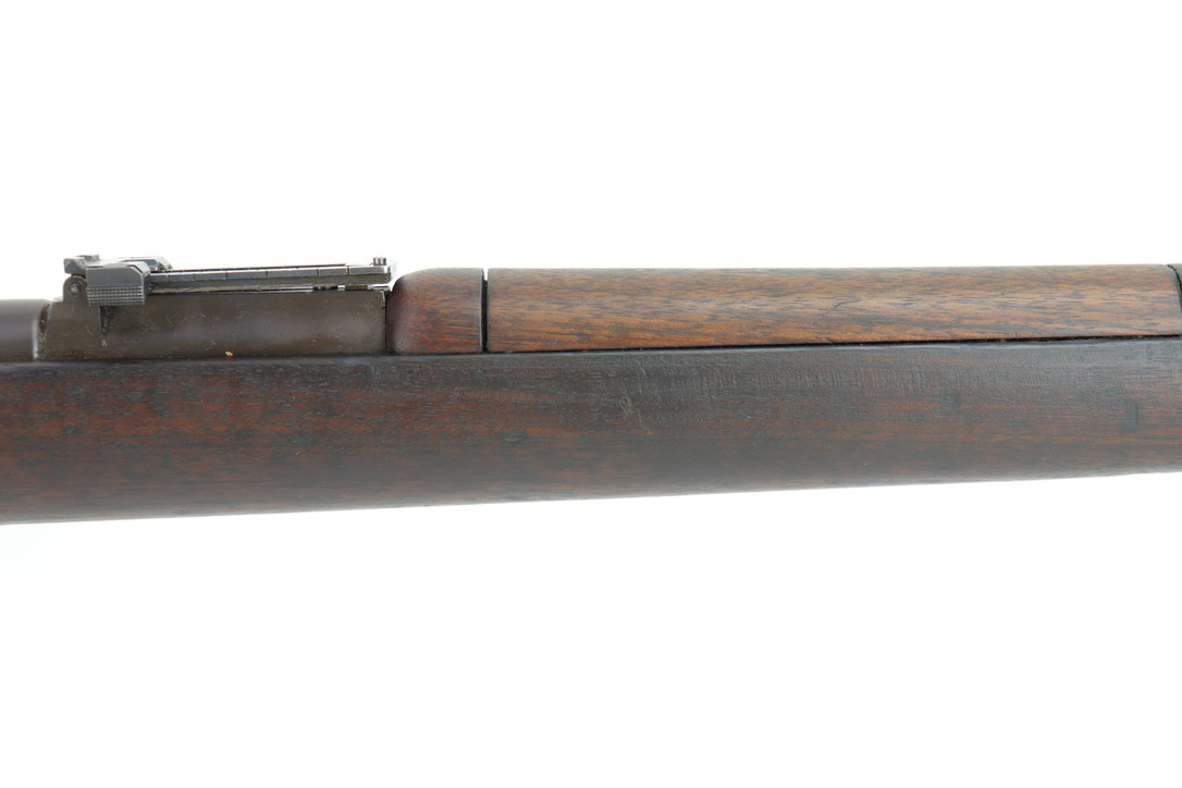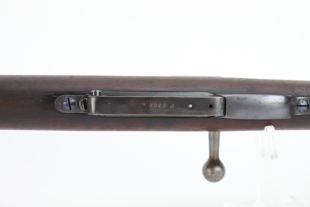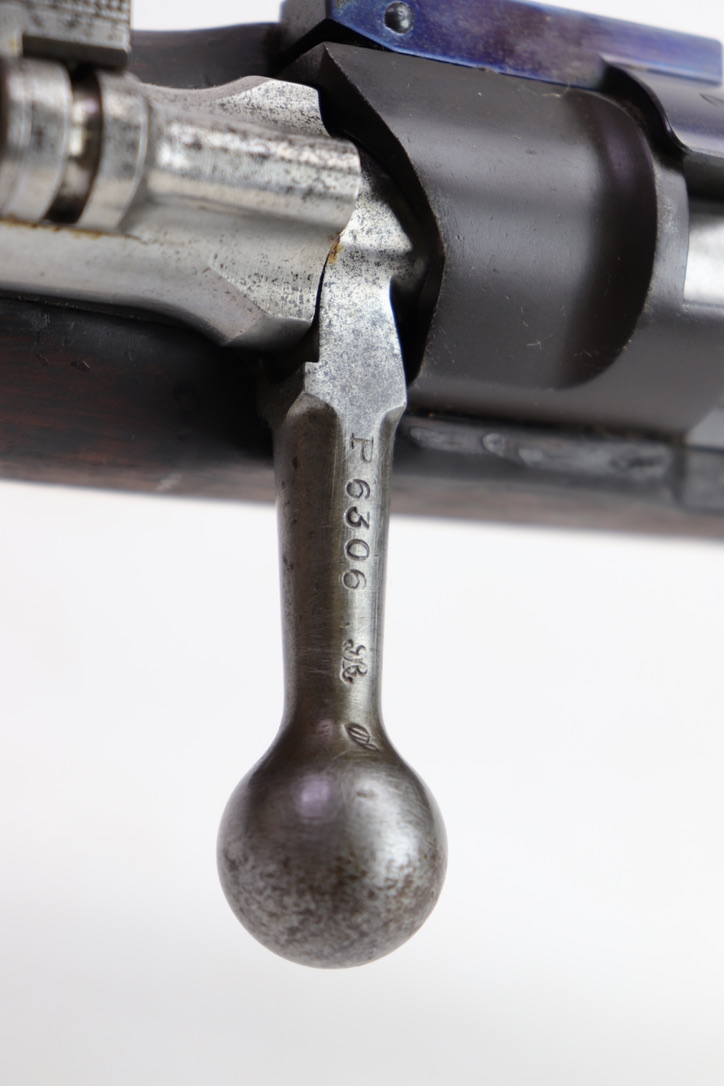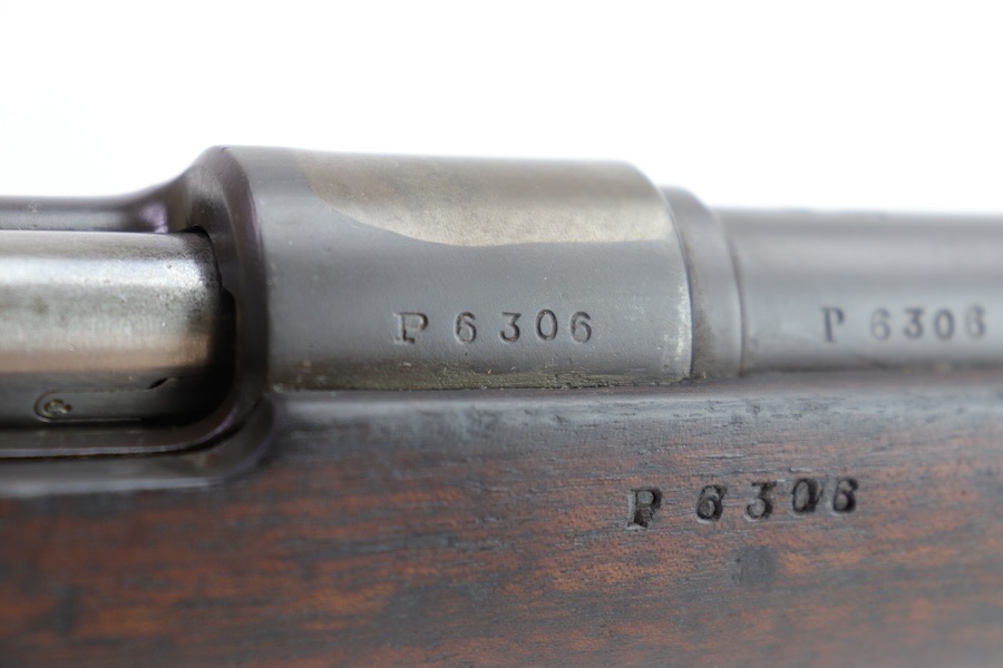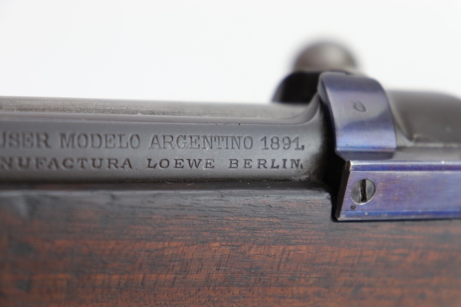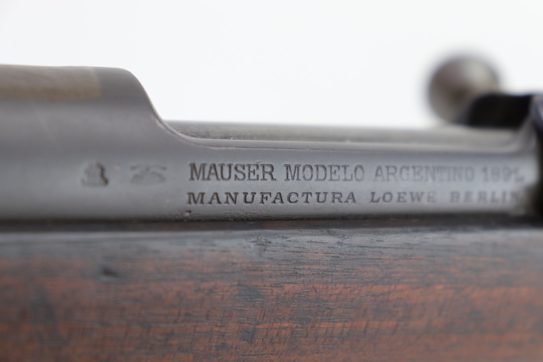 8/29/24 – For sale is an original and matching 1891 Argentine Mauser. The finish on this rifle has thinned over the years but is overall very clean with no rust on the barrel, receiver, or magazine; in addition, the rifle retains almost all of the fire bluing on the bolt release lever. Overall finish Rates 85%. The bore is a bit dark with light pitting throughout but still has pretty strong rifling; we rate the bore a 7.5/10. Excellent wood throughout that shows nothing more than normal handling wear. The action is very smooth and is fully functional. Argentine national crest has been ground off the receiver, which was common practice when these rifles were imported into the United States in the 1960s. One thing to note about this particular rifle is that Loewe Berlin did not send any complete rifles to Argentina under the P serial block. This rifle was assembled and delivered by DWM in 1899 using old stock Loewe Berlin receivers. The actual production date of the receiver is 1895, making this rifle an antique.