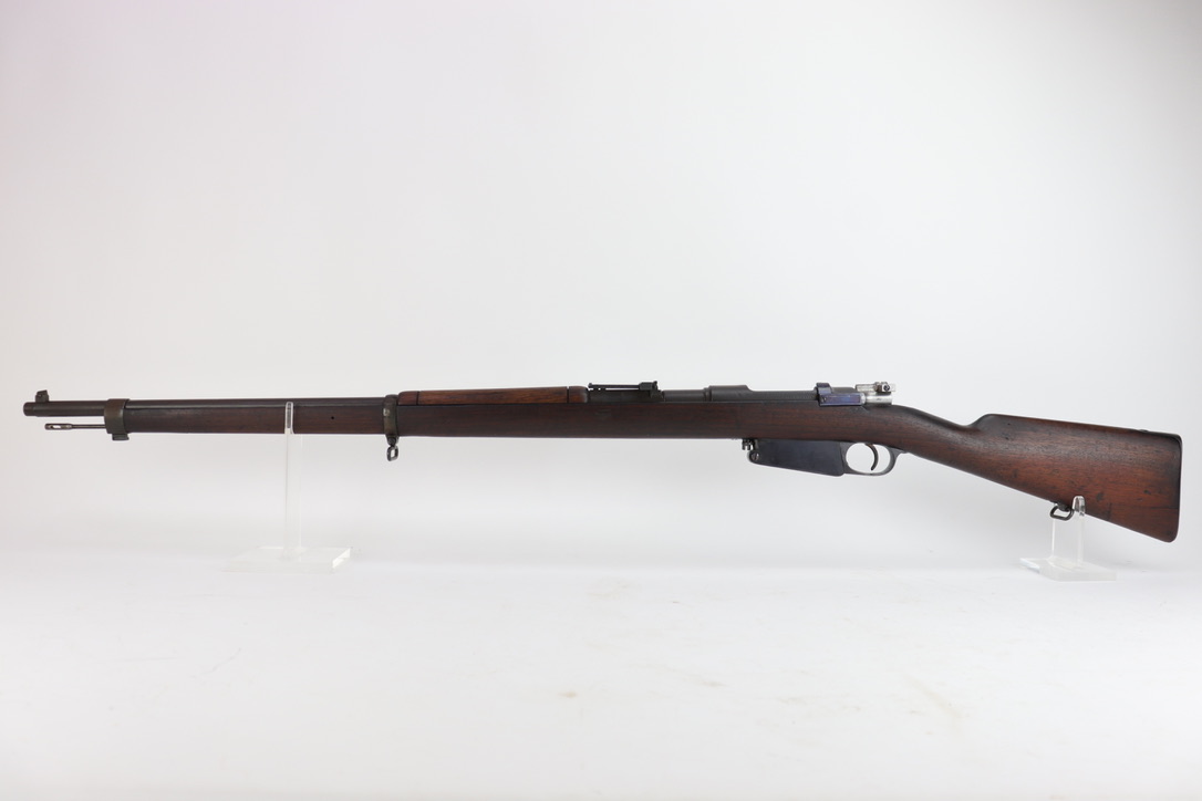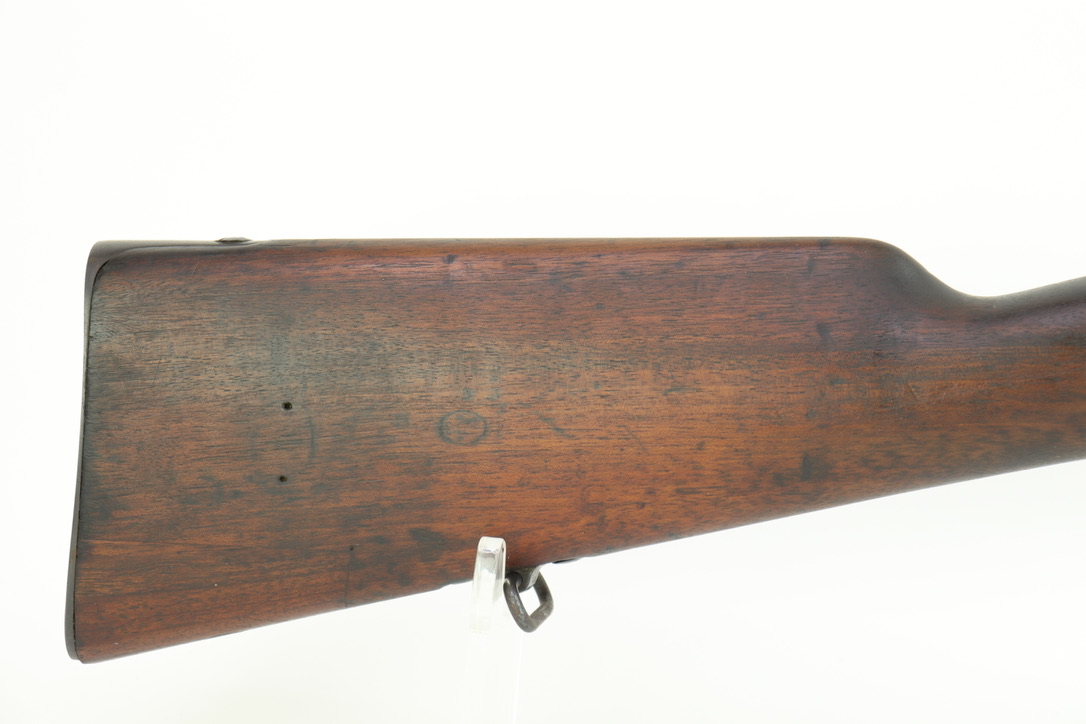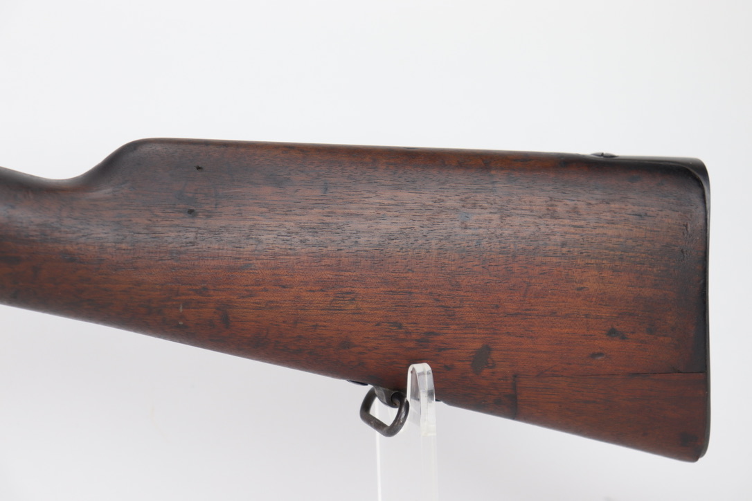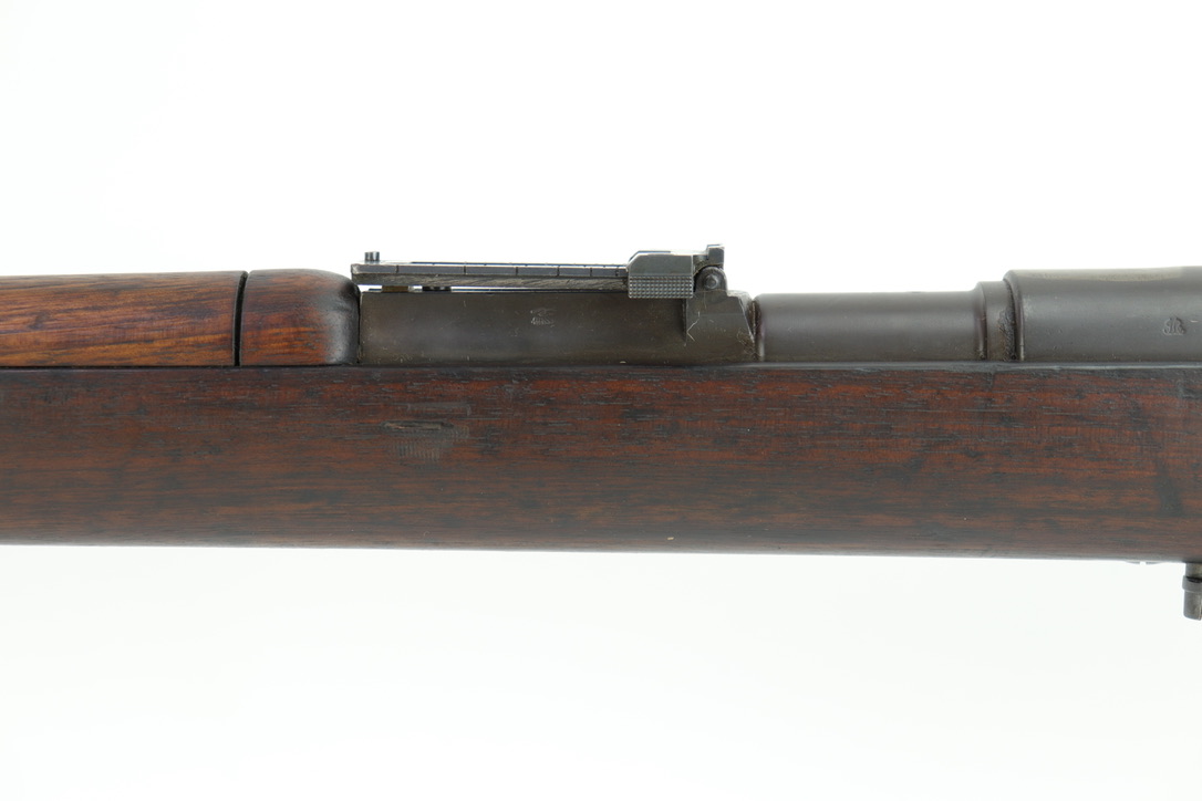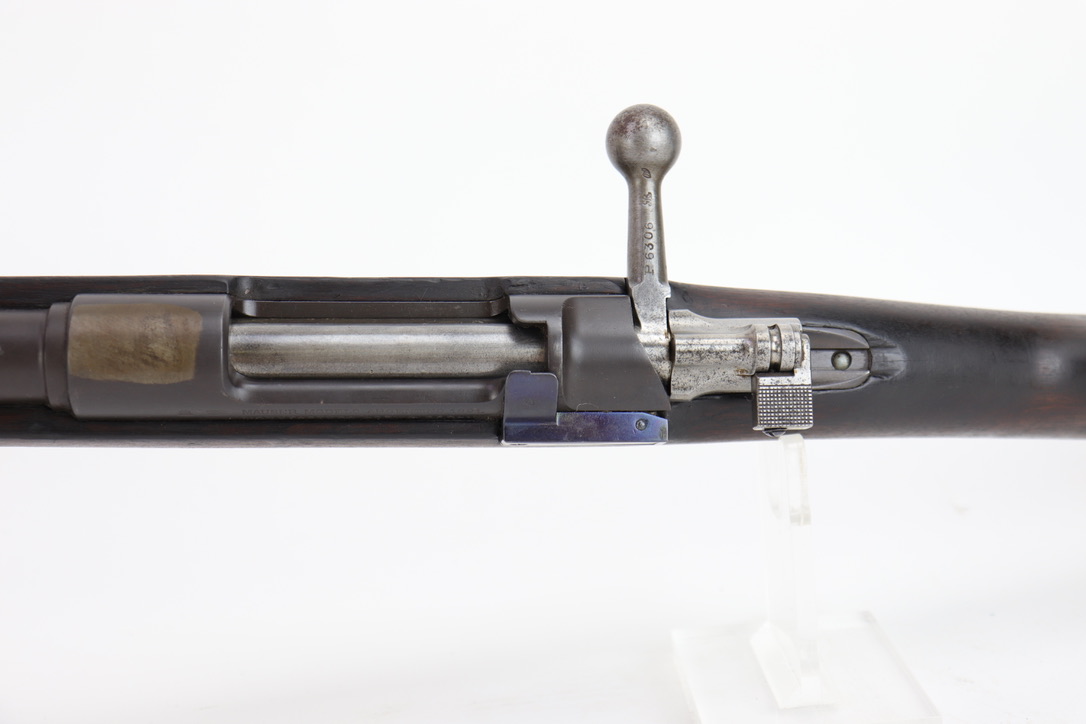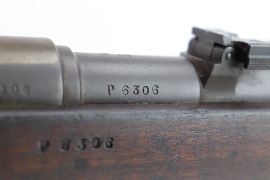 8/29/24 – For sale is an original and matching 1891 Argentine Mauser. The finish on this rifle has thinned over the years but is overall very clean with no rust on the barrel, receiver, or magazine; in addition, the rifle retains almost all of the fire bluing on the bolt release lever. Overall finish Rates 85%. The bore is a bit dark with light pitting throughout but still has pretty strong rifling; we rate the bore a 7.5/10. Excellent wood throughout that shows nothing more than normal handling wear. The action is very smooth and is fully functional. Argentine national crest has been ground off the receiver, which was common practice when these rifles were imported into the United States in the 1960s. One thing to note about this particular rifle is that Loewe Berlin did not send any complete rifles to Argentina under the P serial block. This rifle was assembled and delivered by DWM in 1899 using old stock Loewe Berlin receivers. The actual production date of the receiver is 1895, making this rifle an antique.