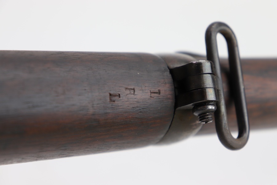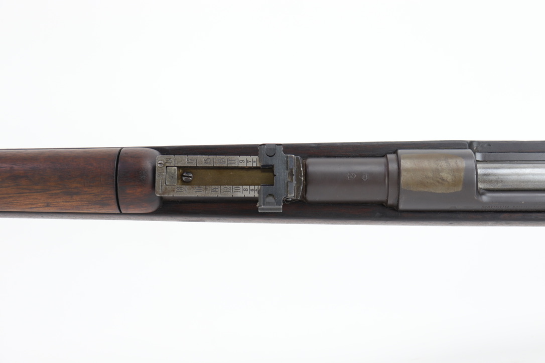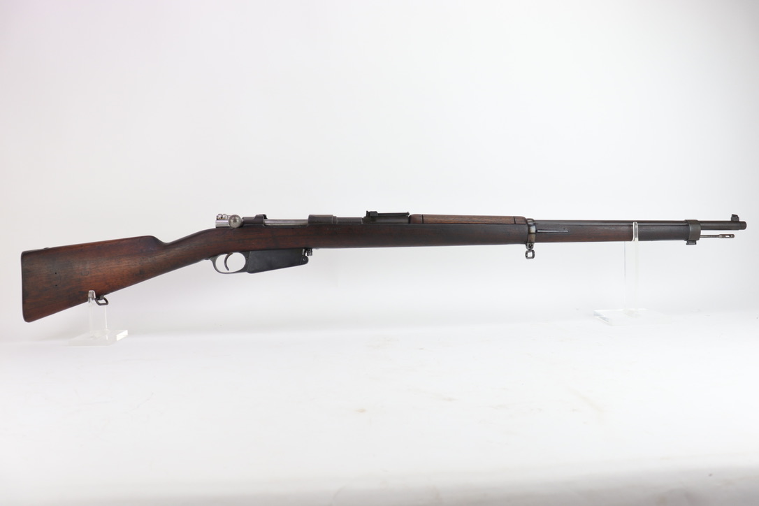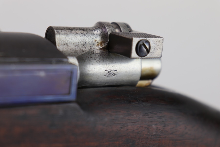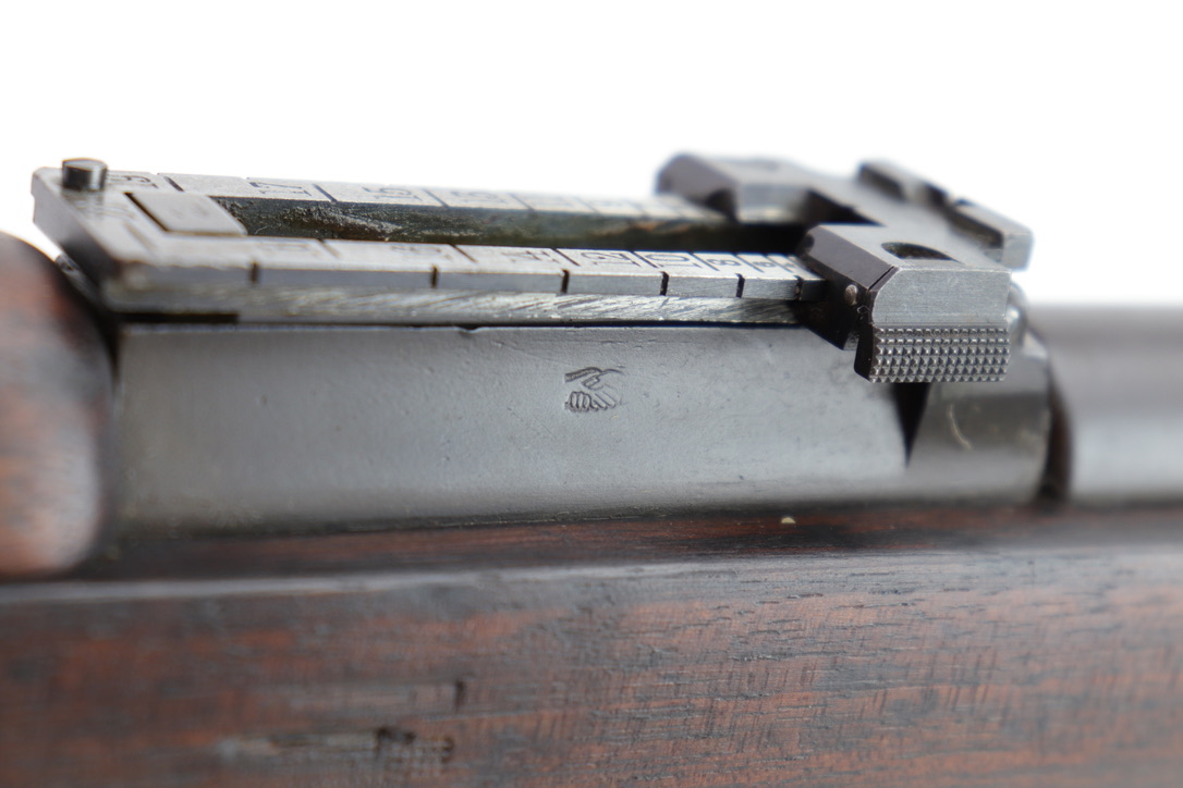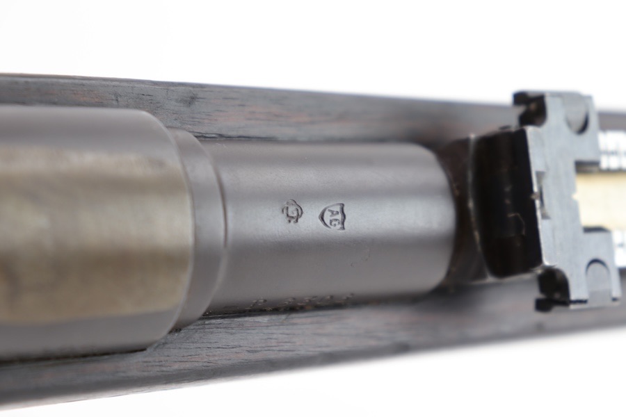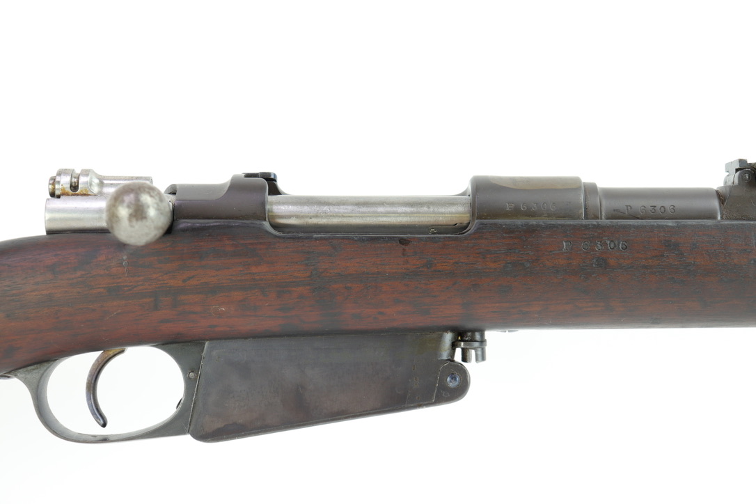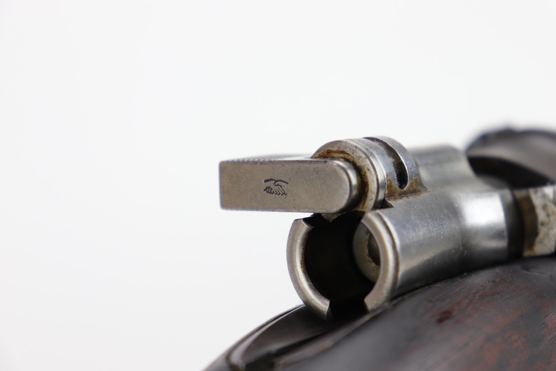 8/29/24 – For sale is an original and matching 1891 Argentine Mauser. The finish on this rifle has thinned over the years but is overall very clean with no rust on the barrel, receiver, or magazine; in addition, the rifle retains almost all of the fire bluing on the bolt release lever. Overall finish Rates 85%. The bore is a bit dark with light pitting throughout but still has pretty strong rifling; we rate the bore a 7.5/10. Excellent wood throughout that shows nothing more than normal handling wear. The action is very smooth and is fully functional. Argentine national crest has been ground off the receiver, which was common practice when these rifles were imported into the United States in the 1960s. One thing to note about this particular rifle is that Loewe Berlin did not send any complete rifles to Argentina under the P serial block. This rifle was assembled and delivered by DWM in 1899 using old stock Loewe Berlin receivers. The actual production date of the receiver is 1895, making this rifle an antique.