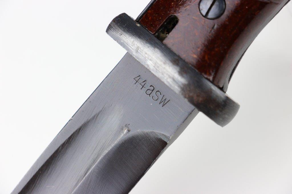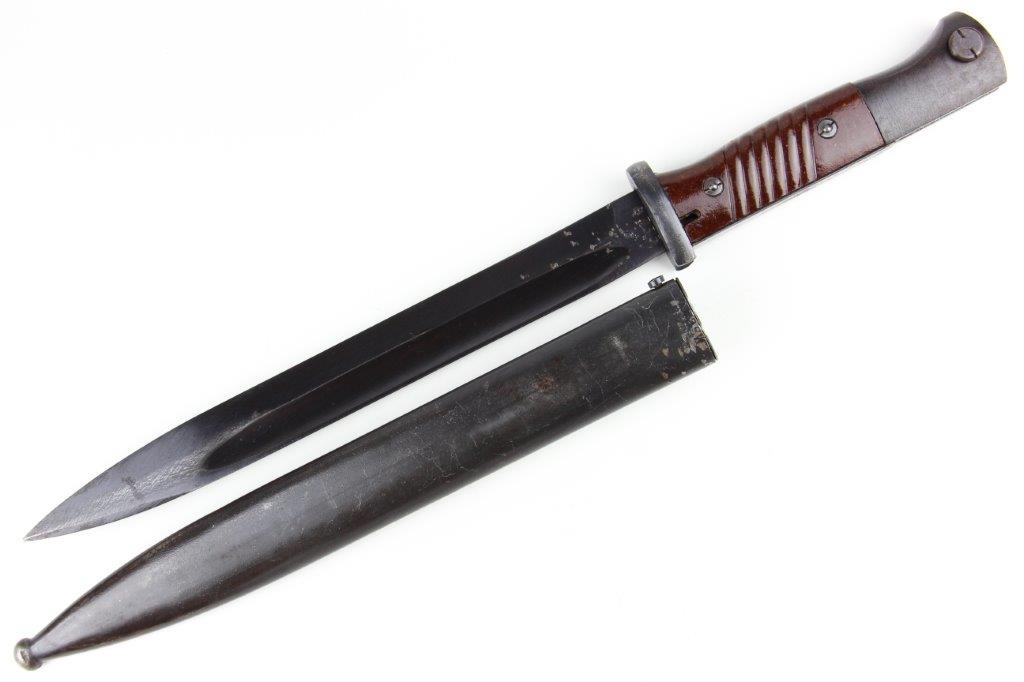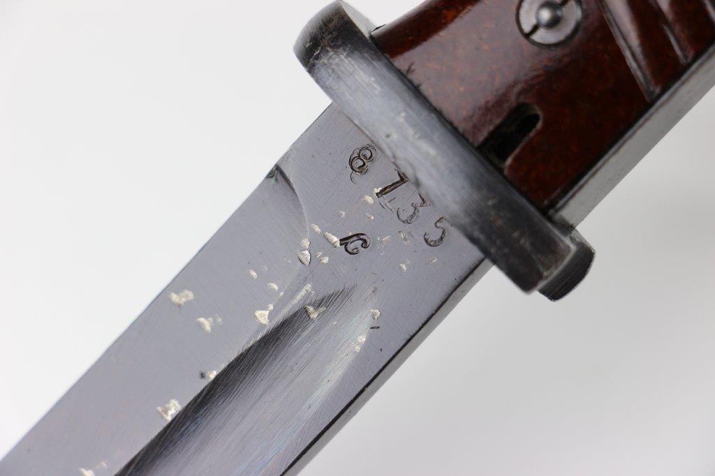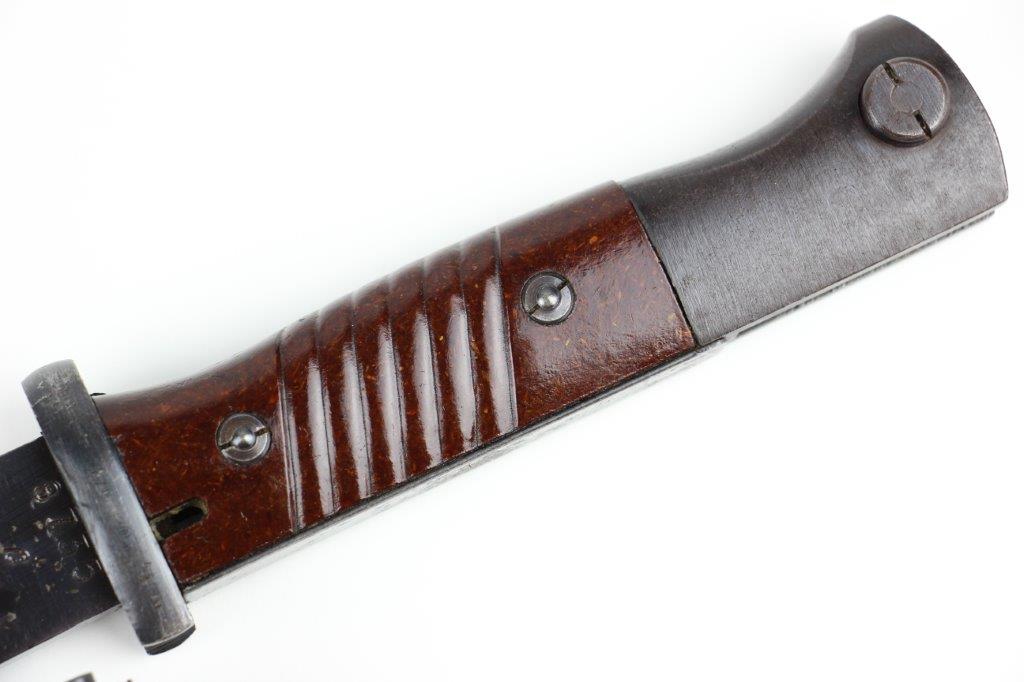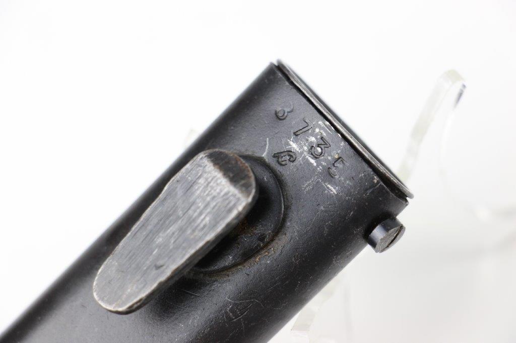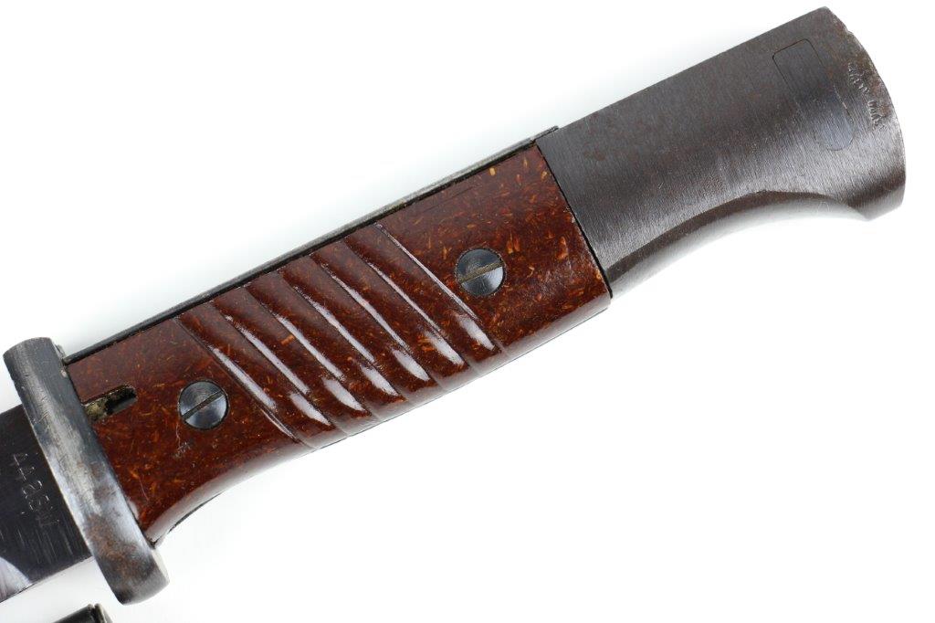 7/16/24 – This is an original 1944 dated K98 bayonet with a matching numbered scabbard. The bayonet blade is in excellent condition with minimal finish loss, which is mostly located around and below the serial number stamped on the ricasso. The edge is clean and unsharpened. One side of the ricasso is stamped “44asw” while the other side is stamped “8735c”. The hand guard, hilt, and pommel are all in great shape with honest surface patina and dark discoloration. Spotty wear is mixed throughout the finish. The bayonet comes with a scabbard that’s in great overall condition with light finish loss but no dents or major issues. The markings on the scabbard match those found on the ricasso.