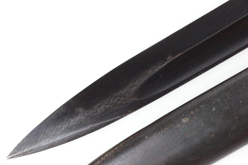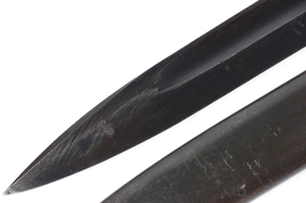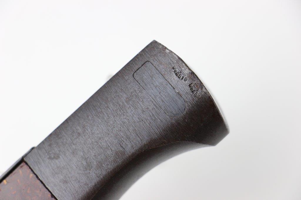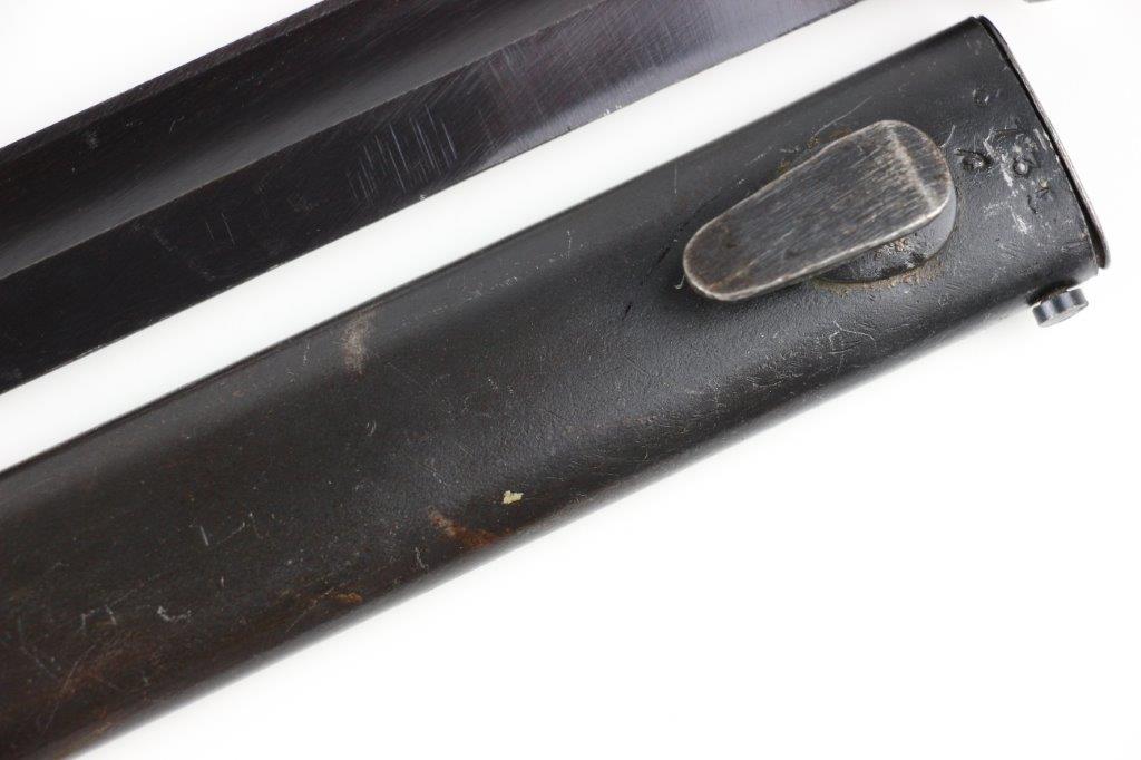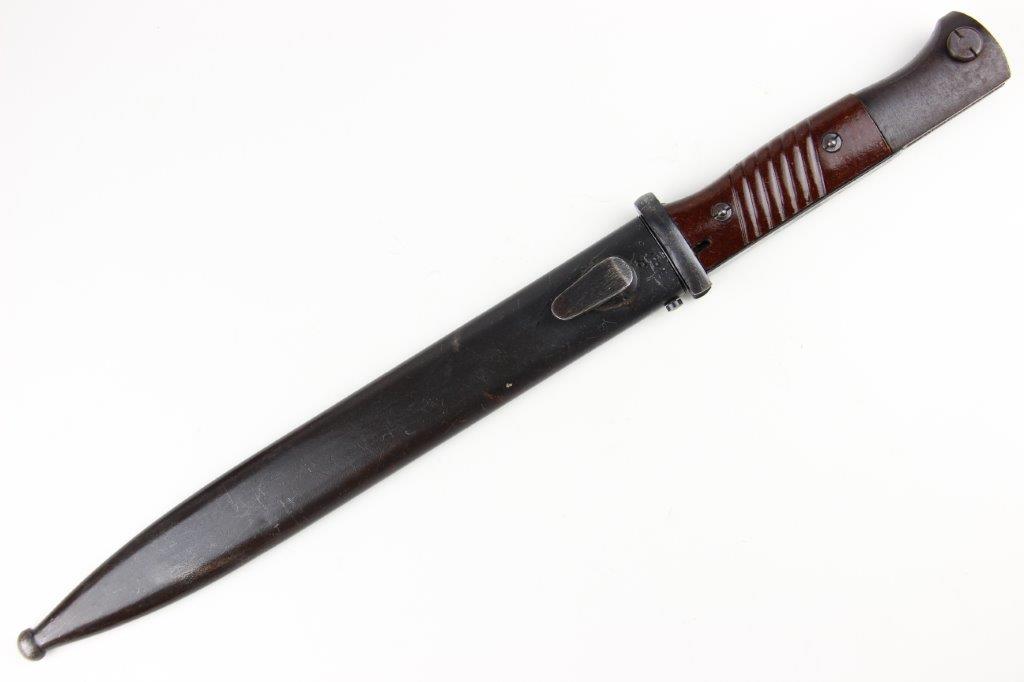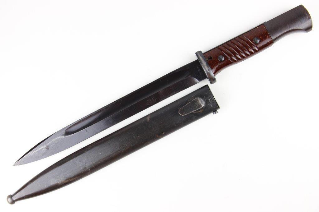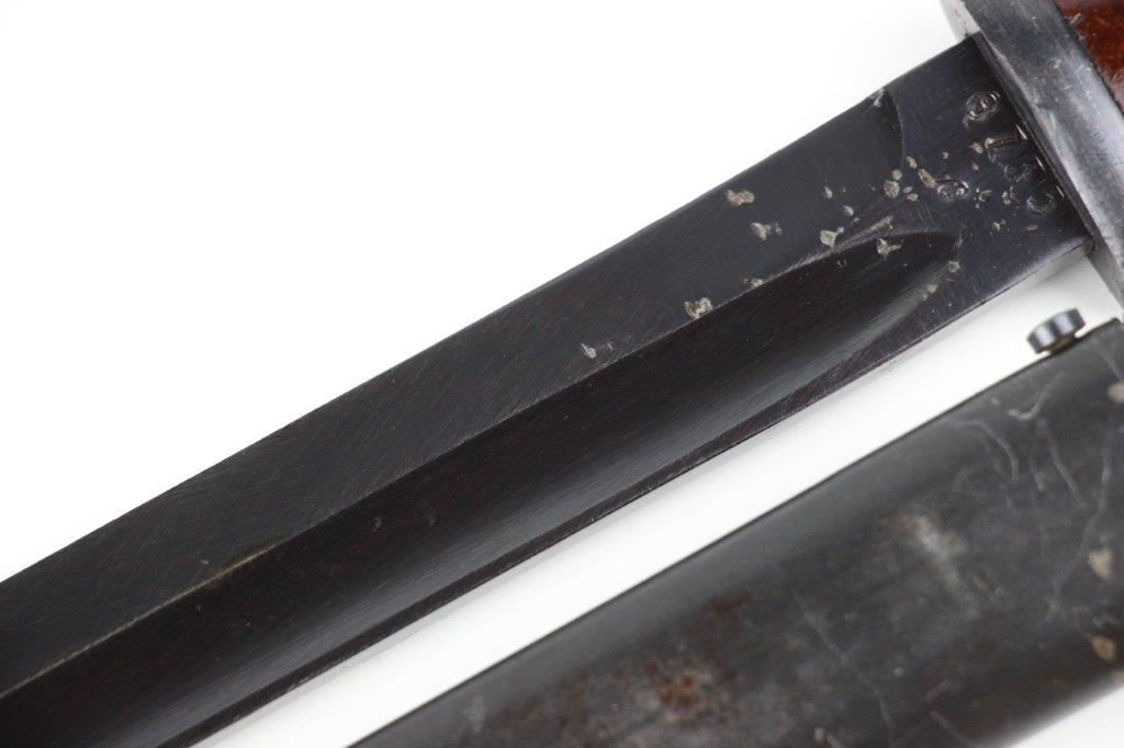 7/16/24 – This is an original 1944 dated K98 bayonet with a matching numbered scabbard. The bayonet blade is in excellent condition with minimal finish loss, which is mostly located around and below the serial number stamped on the ricasso. The edge is clean and unsharpened. One side of the ricasso is stamped “44asw” while the other side is stamped “8735c”. The hand guard, hilt, and pommel are all in great shape with honest surface patina and dark discoloration. Spotty wear is mixed throughout the finish. The bayonet comes with a scabbard that’s in great overall condition with light finish loss but no dents or major issues. The markings on the scabbard match those found on the ricasso.