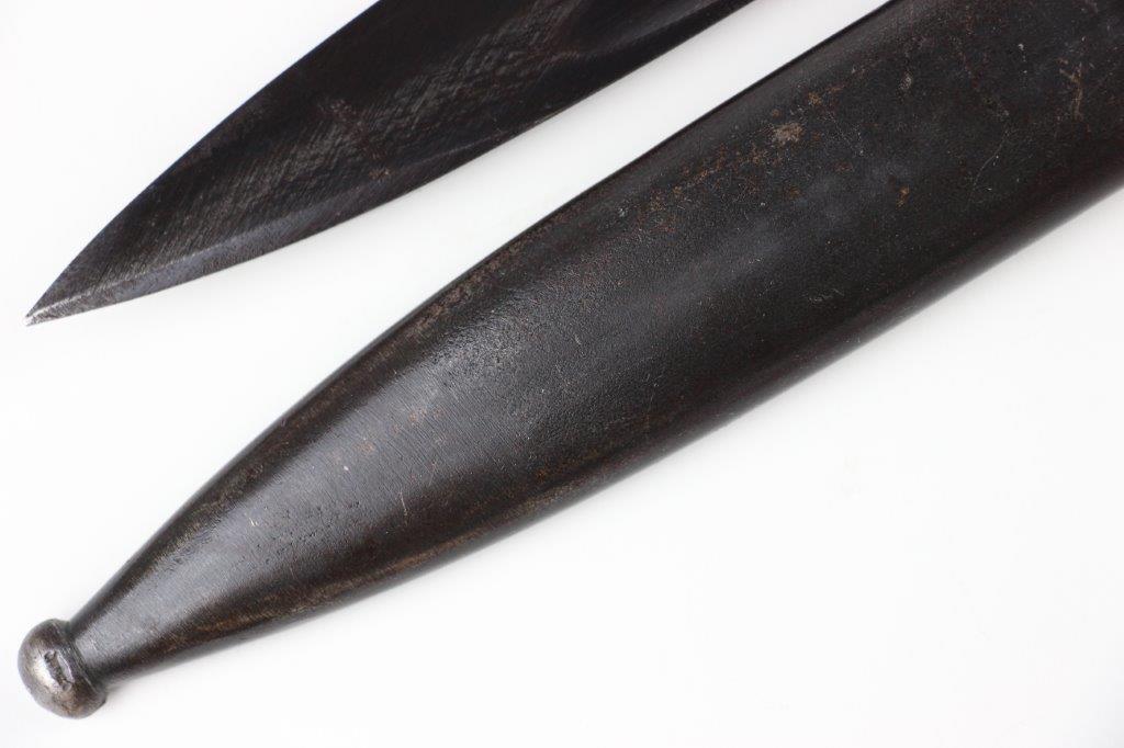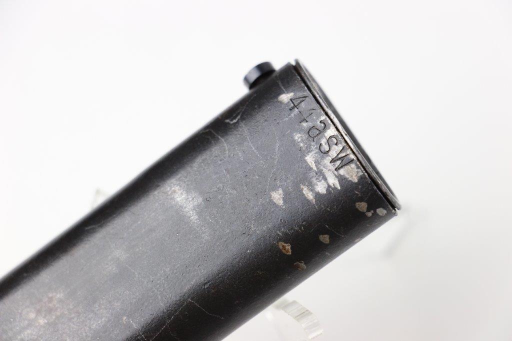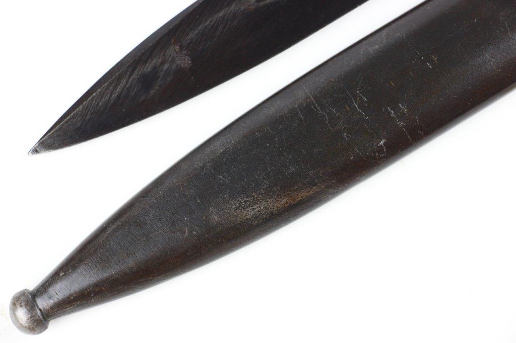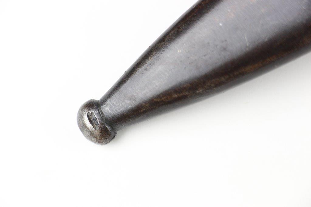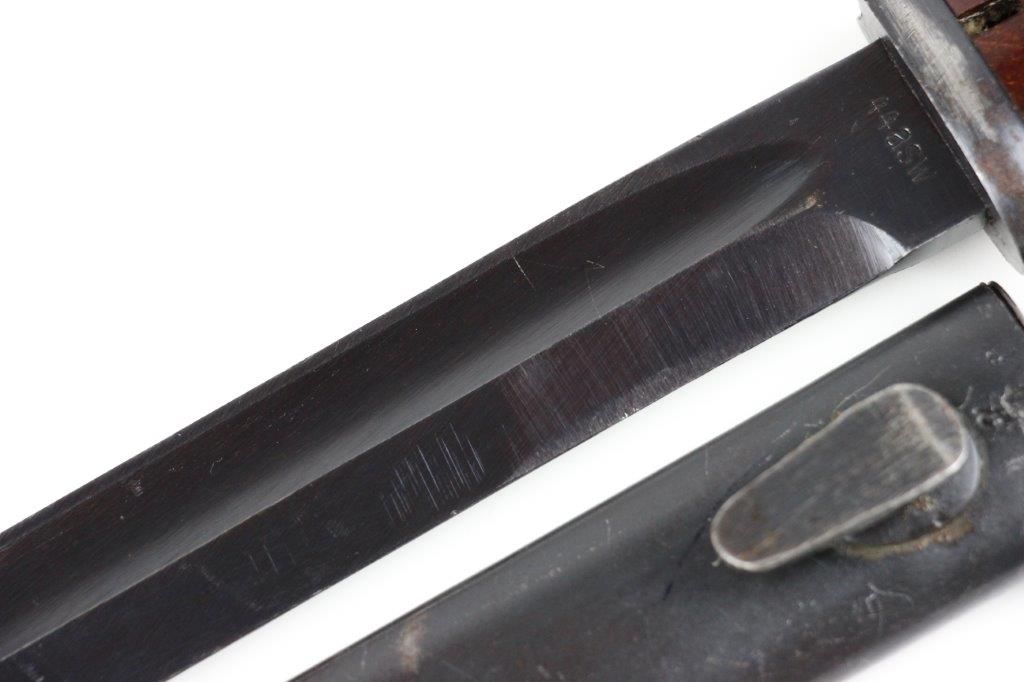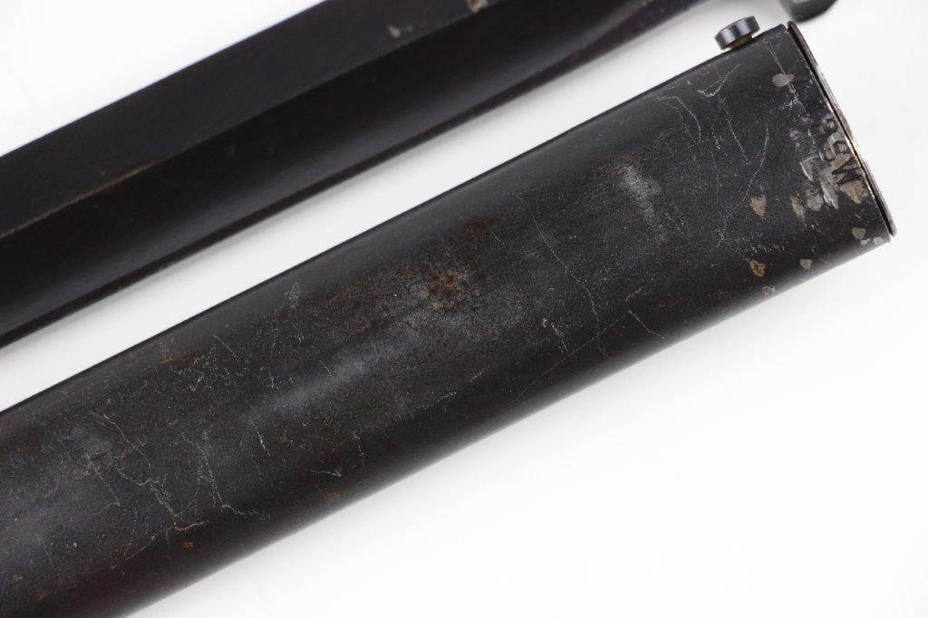 7/16/24 – This is an original 1944 dated K98 bayonet with a matching numbered scabbard. The bayonet blade is in excellent condition with minimal finish loss, which is mostly located around and below the serial number stamped on the ricasso. The edge is clean and unsharpened. One side of the ricasso is stamped “44asw” while the other side is stamped “8735c”. The hand guard, hilt, and pommel are all in great shape with honest surface patina and dark discoloration. Spotty wear is mixed throughout the finish. The bayonet comes with a scabbard that’s in great overall condition with light finish loss but no dents or major issues. The markings on the scabbard match those found on the ricasso.