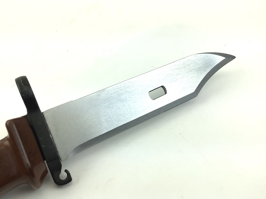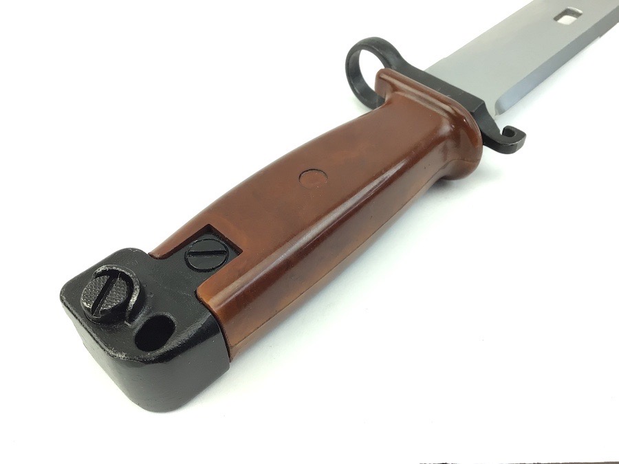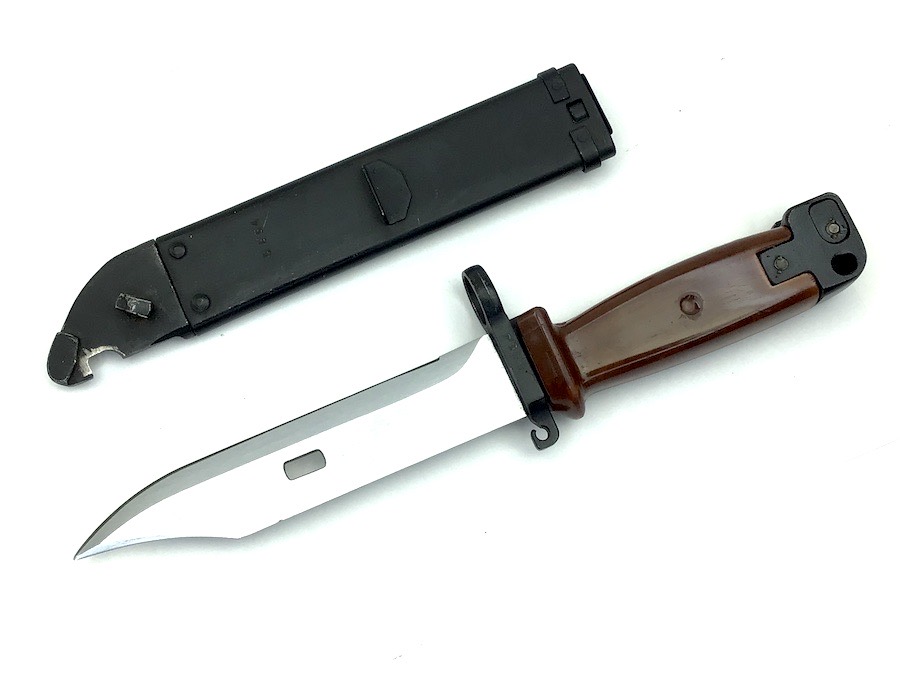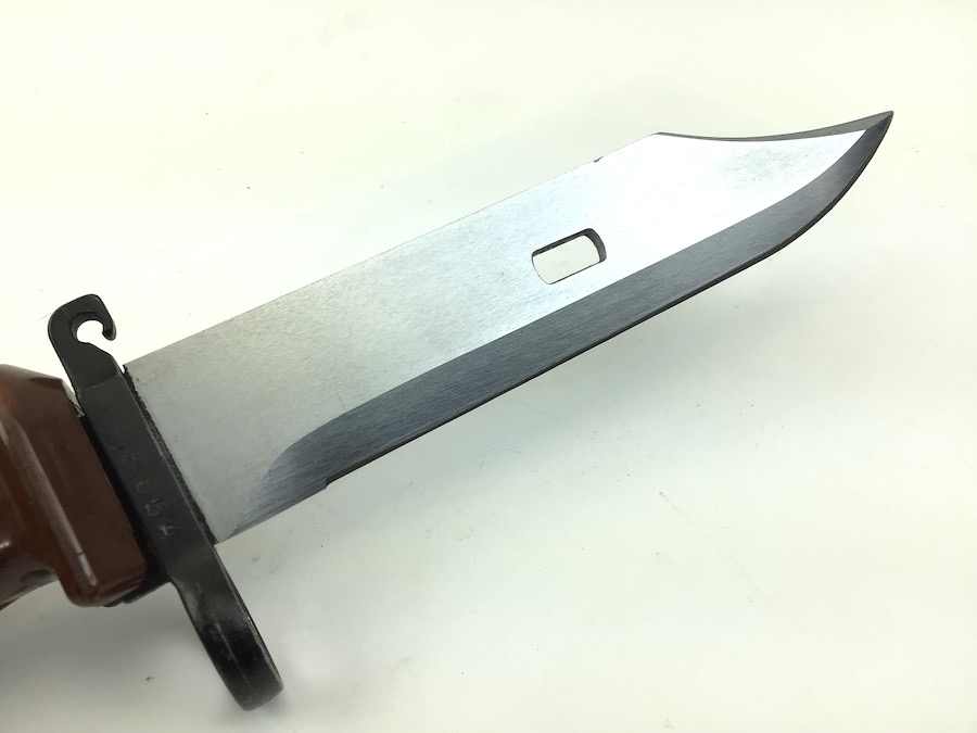 5/3/23 – Original and excellent condition. Polish military surplus. Matching numbers, AKM Type 2 Bayonet for the AK-47 assault rifle. Metal scabbard and bayonet cross guard are both stamped with the numerals “5654”. Blade is beautiful with no evidence of sharpening. Micro-ding is visible on the spine near the tip. Scabbard is in excellent condition as well. Polymer grip is tight with no chips or cracks.