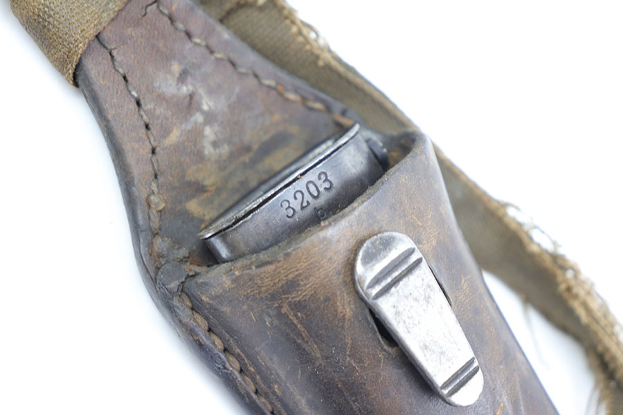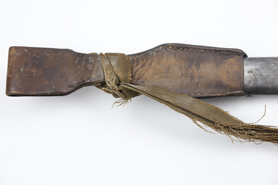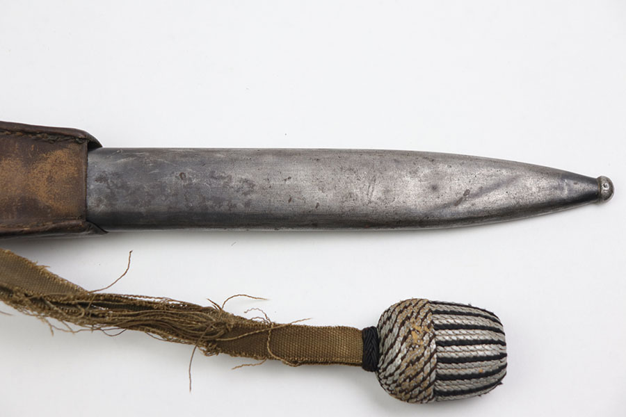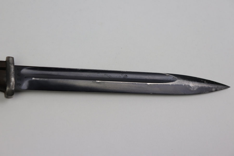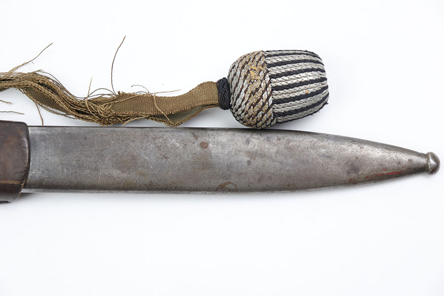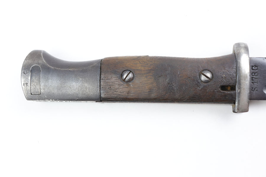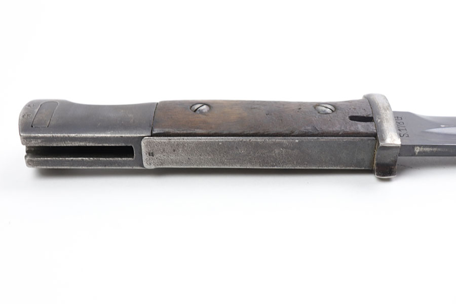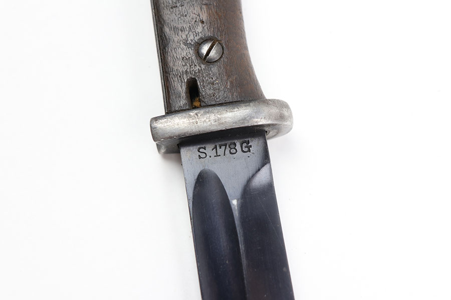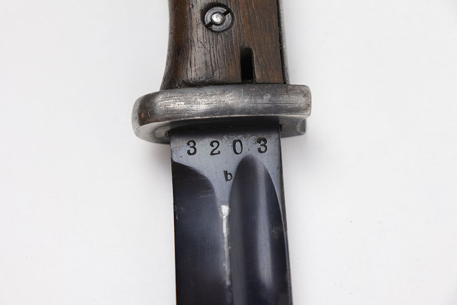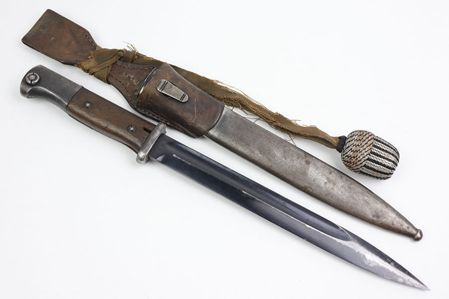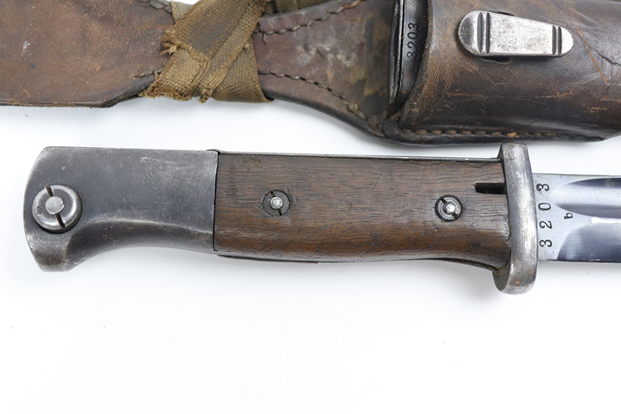 12/9/20 – This is an original, early production K98 bayonet with a matching serial numbered scabbard, leather frog, and portepee. The bayonet blade is excellent with some light finish loss but most of the original blued finish in tact. Numbered 3203b on one side and S.178G on the reverse. Wood handle has no cracks or chips. The pommel has two eagle/73 droop winged eagle proofs. The scabbard has no dents but is missing most of the original finish. Light brown patina throughout. The leather frog is unmarked but in good condition with all original stitching in tact. The portepee is silver and black and has a fairly tattered rope but the knot is tight.