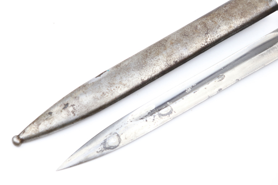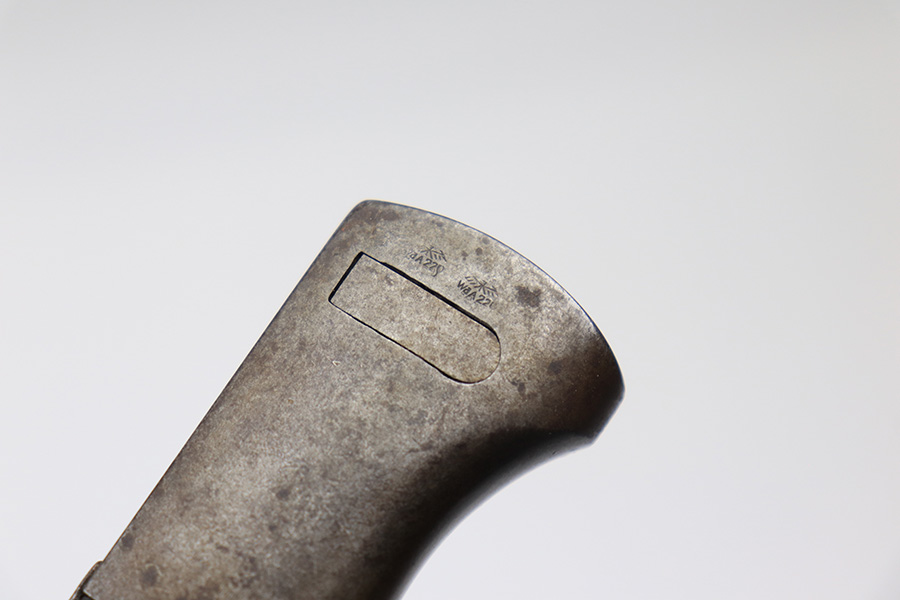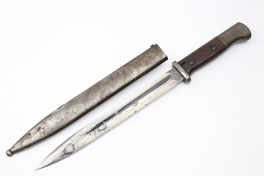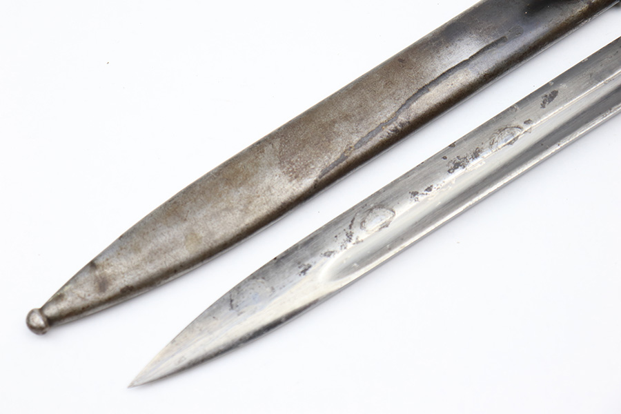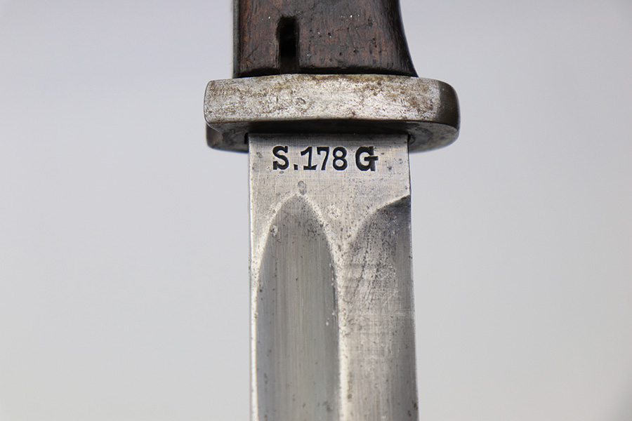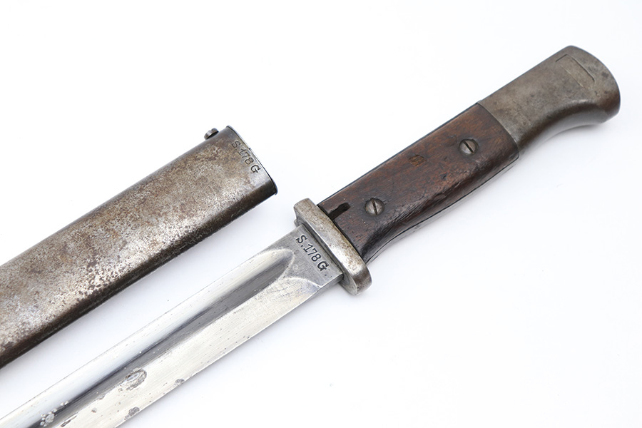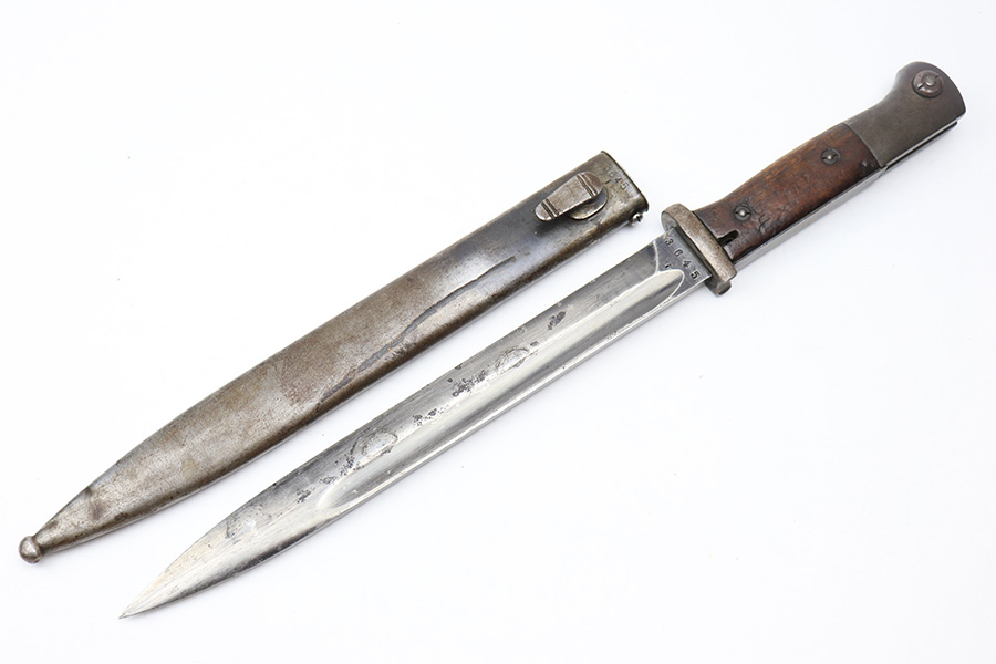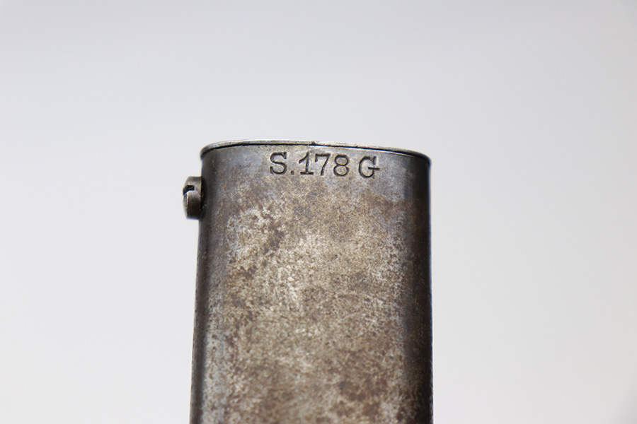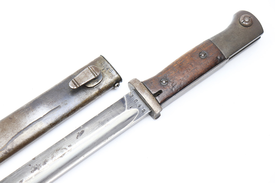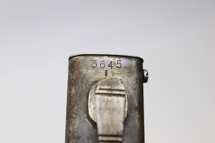 3/16/22 – This is an original G Date K98 bayonet with a matching serial numbered scabbard. The bayonet and scabbard are both marked “S.178 G” and are serial numbered 3645i. The blade has some of the original finish still visible, but most of this is thinning and mixed with dark discoloration and surface patina. No rust, pitting, or sharpening. The scabbard has similar patina throughout and there is a small dent near the tip. The wood handle is in great shape and the metal pommel shows normal patina.