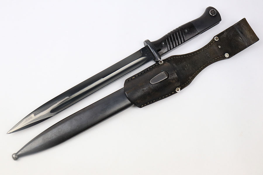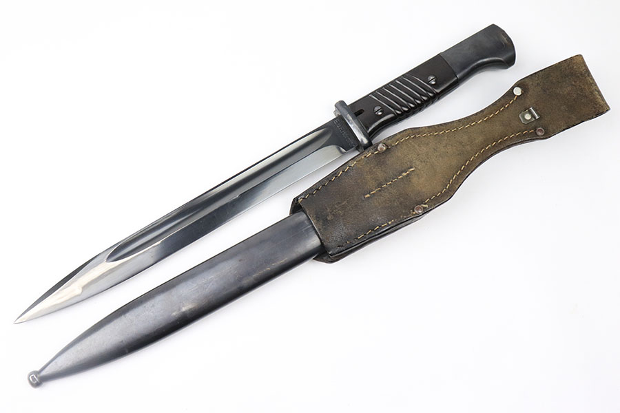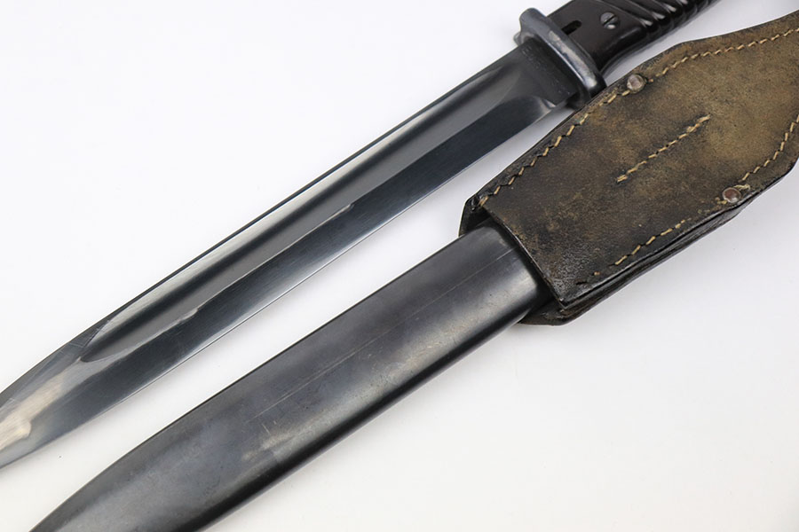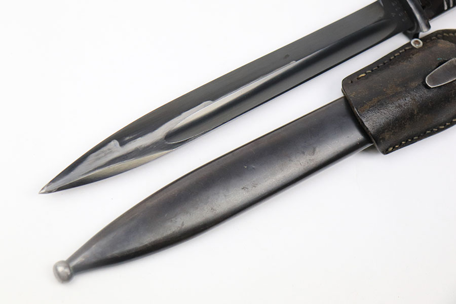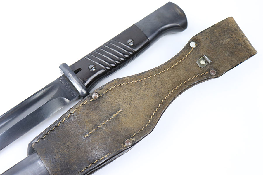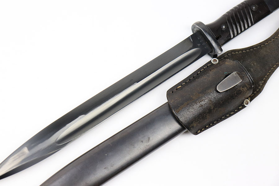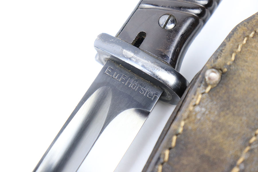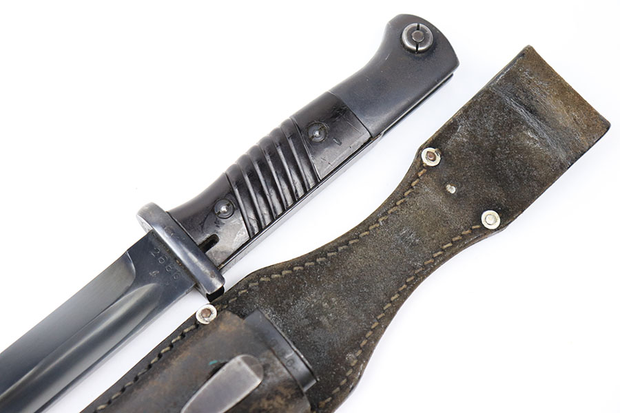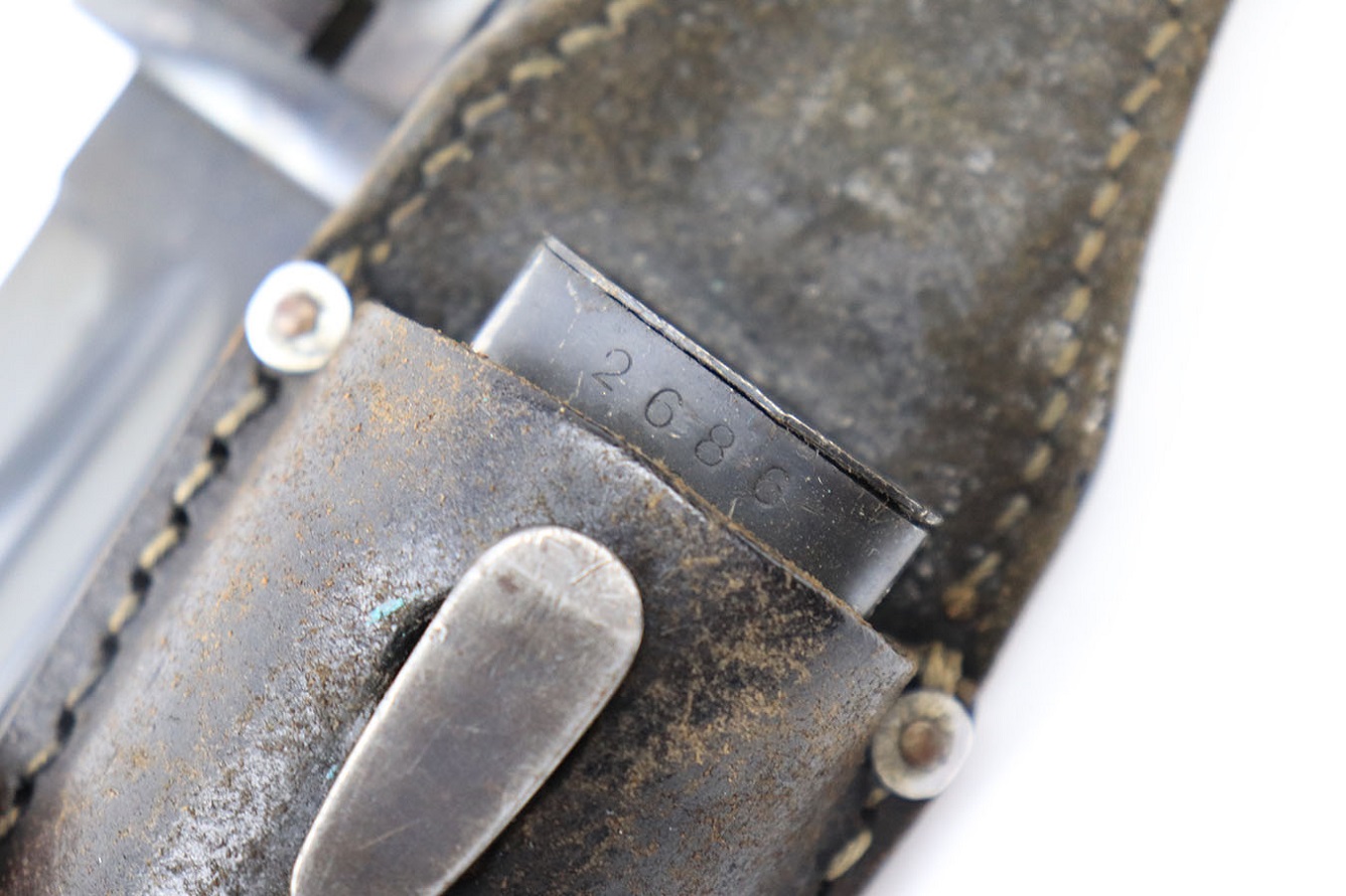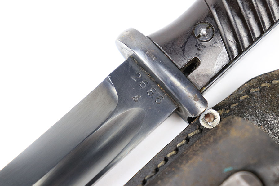 6/24/21 – This is an original K98 bayonet from 1940 with a matching numbered scabbard. The blade and scabbard are both numbered 2686h. The reverse of the blade is maker stamped by E.u.F. Horster. The spine is stamped “40” for 1940. The bluing on the blade is excellent with some minor finish loss near the tip. No signs of sharpening. Excellent handle and scabbard as well. the leather frog has some surface scuffing and aging wear but no major damage.