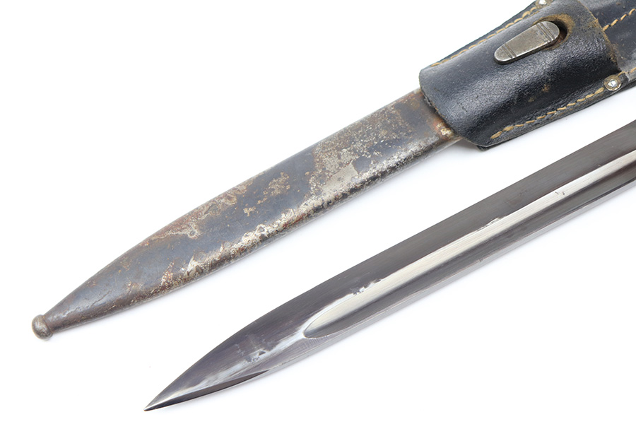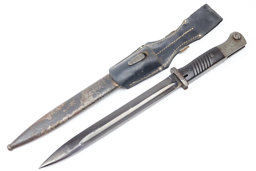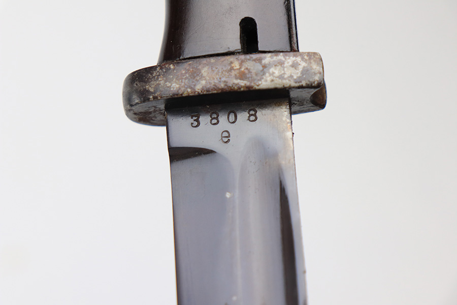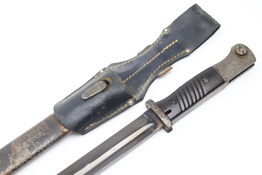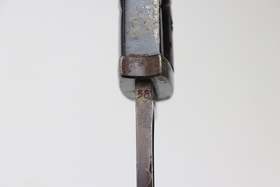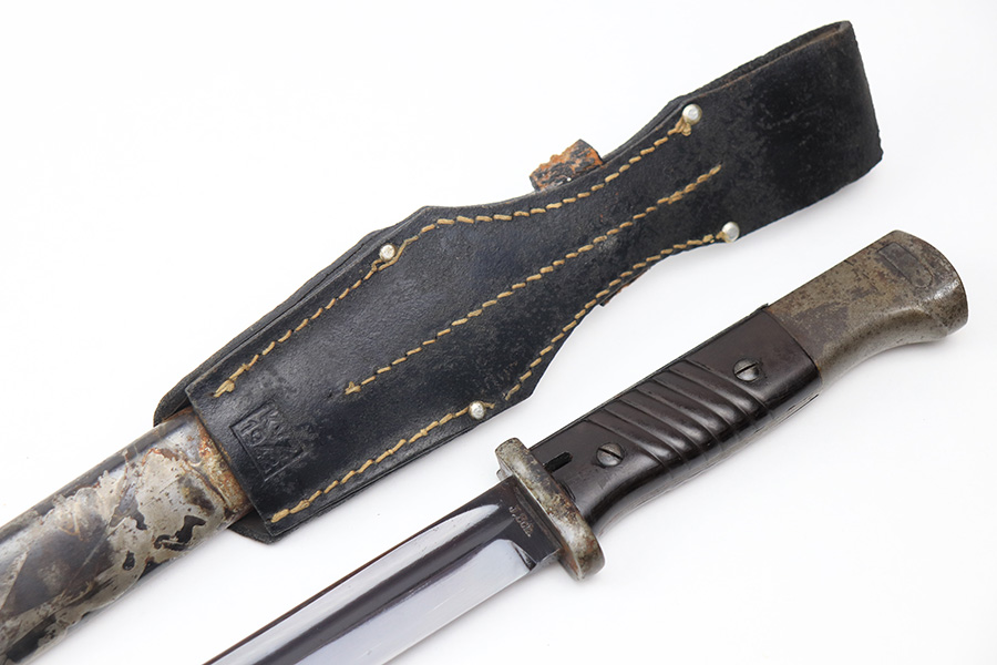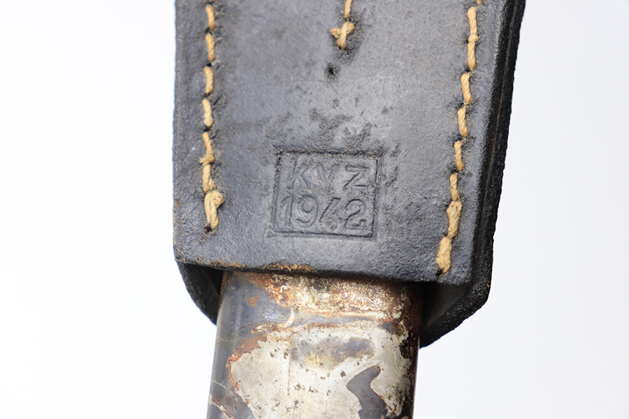 1/17/22 – This is an original 1938 dated K98 bayonet with an original matching numbered scabbard, and a black leather frog. The bayonet blade has very nice original finish in tact with some small spots of surface pitting near the tip, as well as mild finish loss. No signs of sharpening. Maker stamped on one side and serial numbered on the other. The handle has patina and dark discoloration along with finish loss throughout, and no cracks or chips in the handle. The scabbard has similar patina throughout but has no dents and is matching numbered. The leather frog is 1942 dated, and missing the secure strap that wraps around the bayonet handle, but otherwise is in great shape.