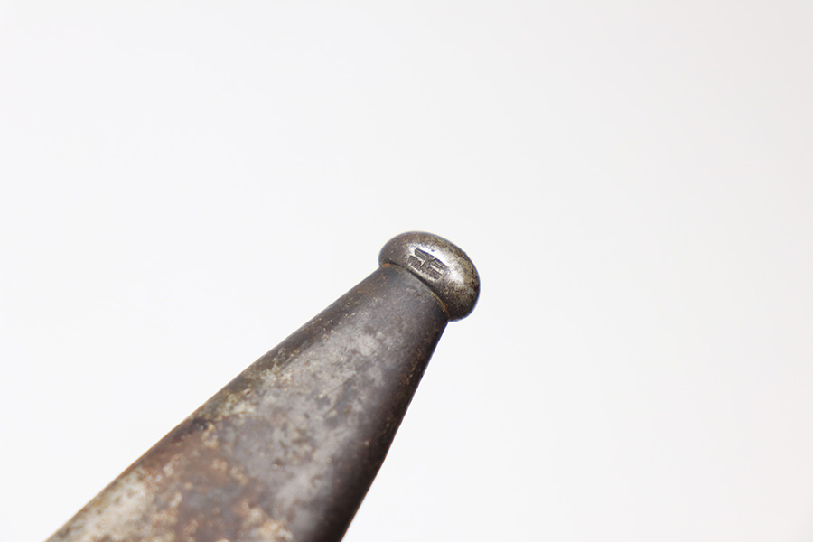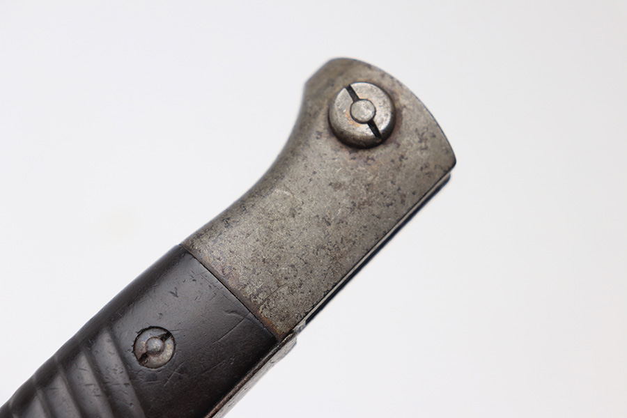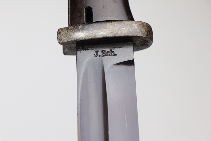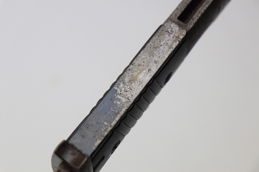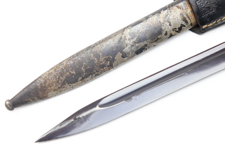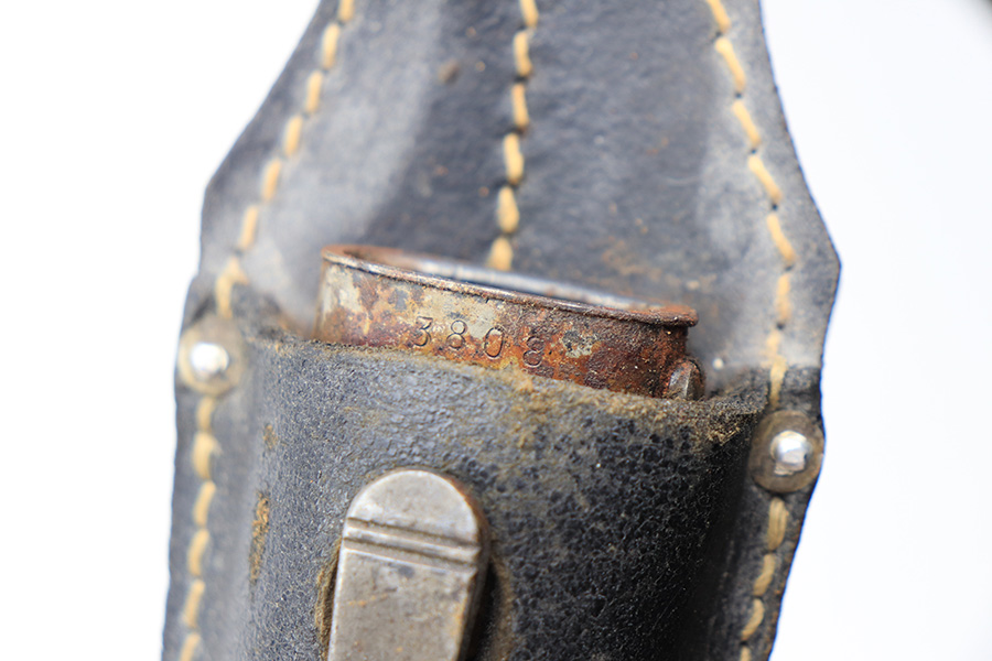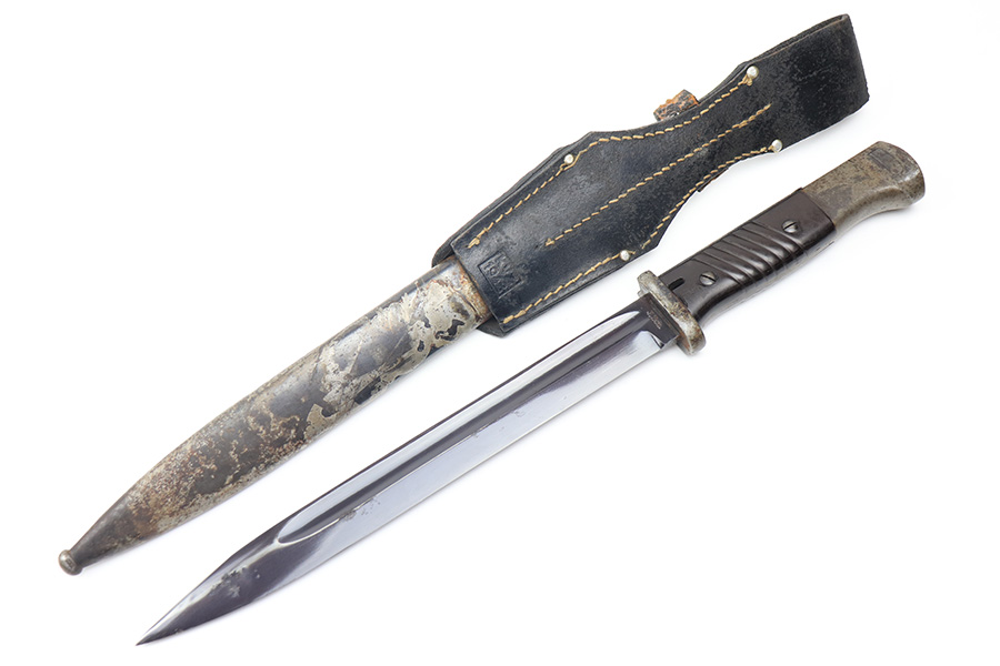 1/17/22 – This is an original 1938 dated K98 bayonet with an original matching numbered scabbard, and a black leather frog. The bayonet blade has very nice original finish in tact with some small spots of surface pitting near the tip, as well as mild finish loss. No signs of sharpening. Maker stamped on one side and serial numbered on the other. The handle has patina and dark discoloration along with finish loss throughout, and no cracks or chips in the handle. The scabbard has similar patina throughout but has no dents and is matching numbered. The leather frog is 1942 dated, and missing the secure strap that wraps around the bayonet handle, but otherwise is in great shape.