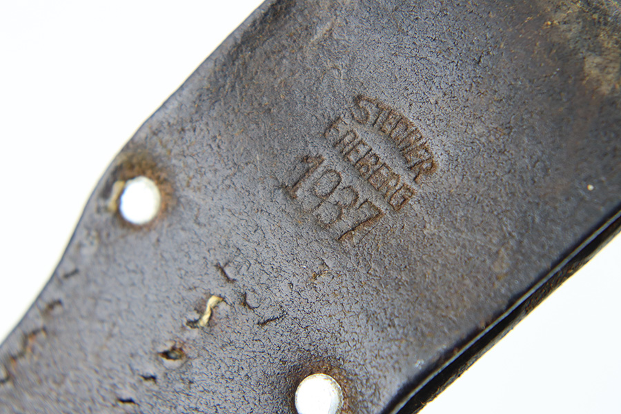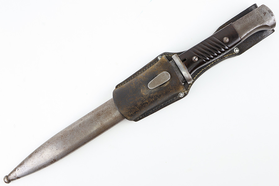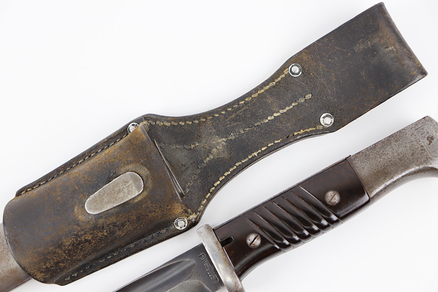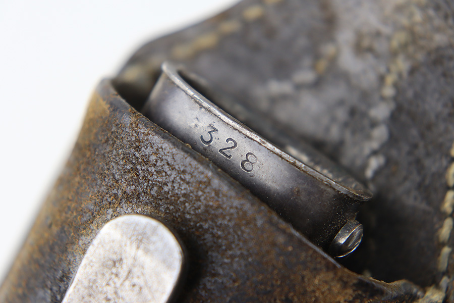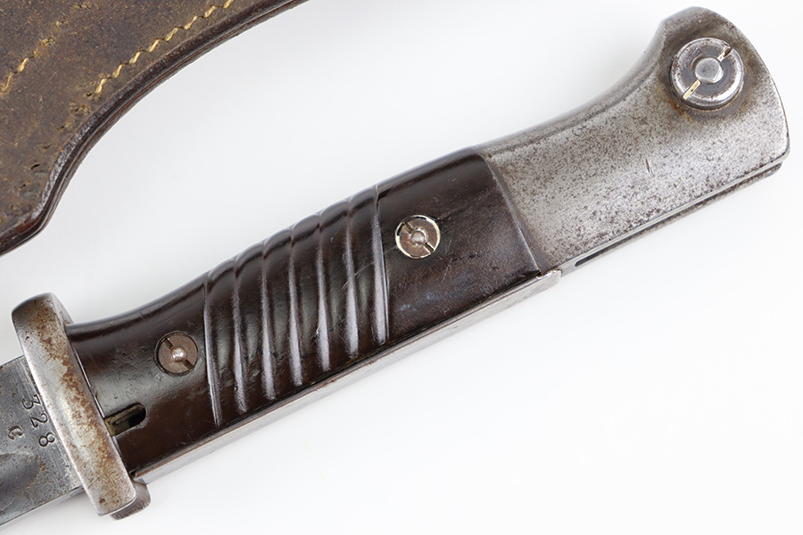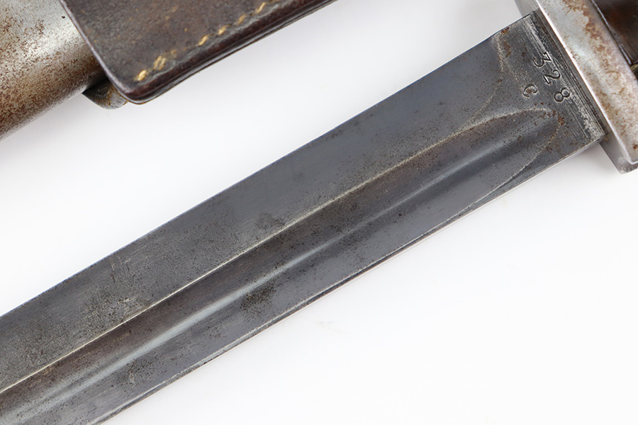 10/5/23 – This is an original 1939 dated K98 bayonet with a matching numbered scabbard and leather frog. The bayonet blade has light patina and speckling discoloration throughout, but most of the original finish remains (although it’s thinning). The base of the blade is maker stamped on one side, and serial numbered on the other side. The spine of the blade is ’39 dated. The cross guard and metal portions of the handle / pommel are missing most of the finish and there’s dark discoloration throughout. The grips have no cracks or chips. The scabbard is serial numbered to the blade, and is missing almost all of the finish, leaving a metallic color with browning patina throughout. The leather frog is in great shape with a 1937 date and maker stamp on the back.