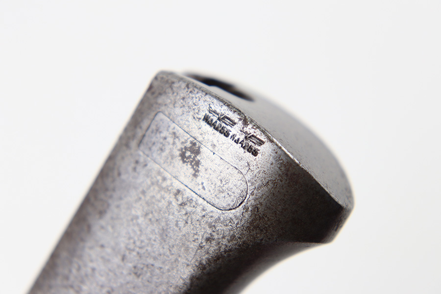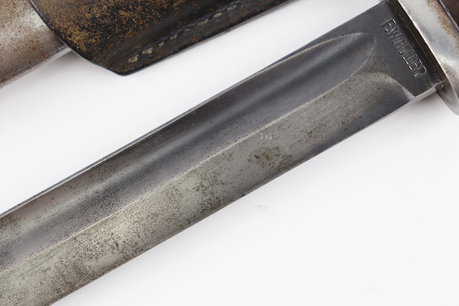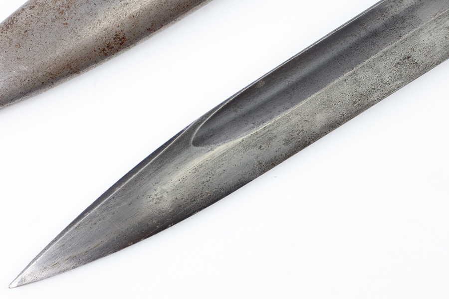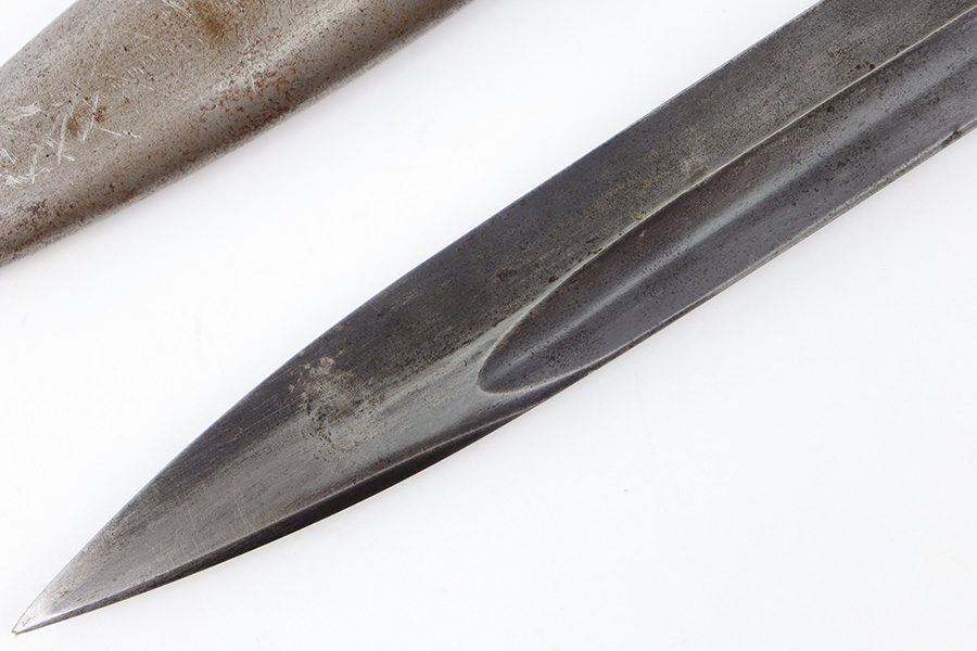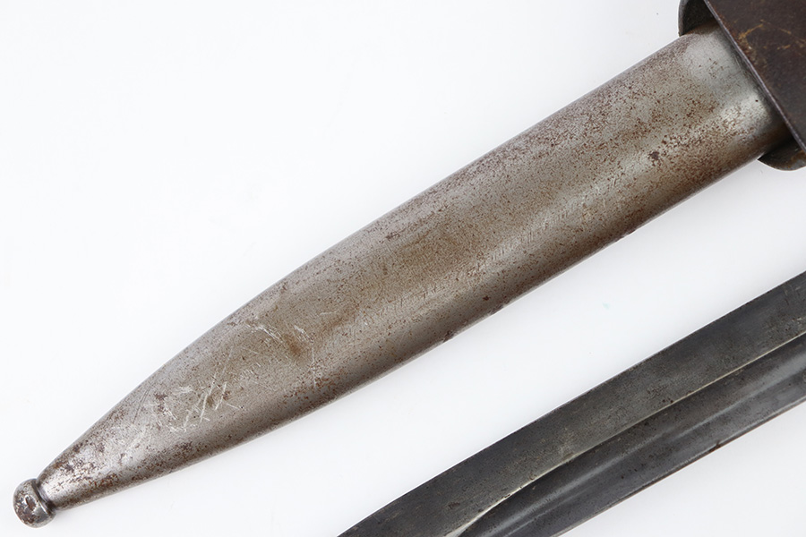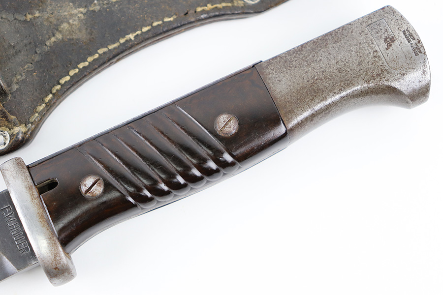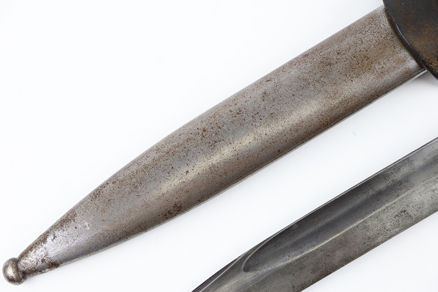 10/5/23 – This is an original 1939 dated K98 bayonet with a matching numbered scabbard and leather frog. The bayonet blade has light patina and speckling discoloration throughout, but most of the original finish remains (although it’s thinning). The base of the blade is maker stamped on one side, and serial numbered on the other side. The spine of the blade is ’39 dated. The cross guard and metal portions of the handle / pommel are missing most of the finish and there’s dark discoloration throughout. The grips have no cracks or chips. The scabbard is serial numbered to the blade, and is missing almost all of the finish, leaving a metallic color with browning patina throughout. The leather frog is in great shape with a 1937 date and maker stamp on the back.