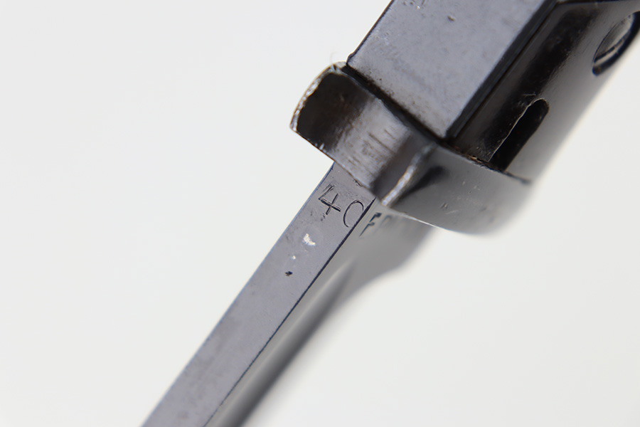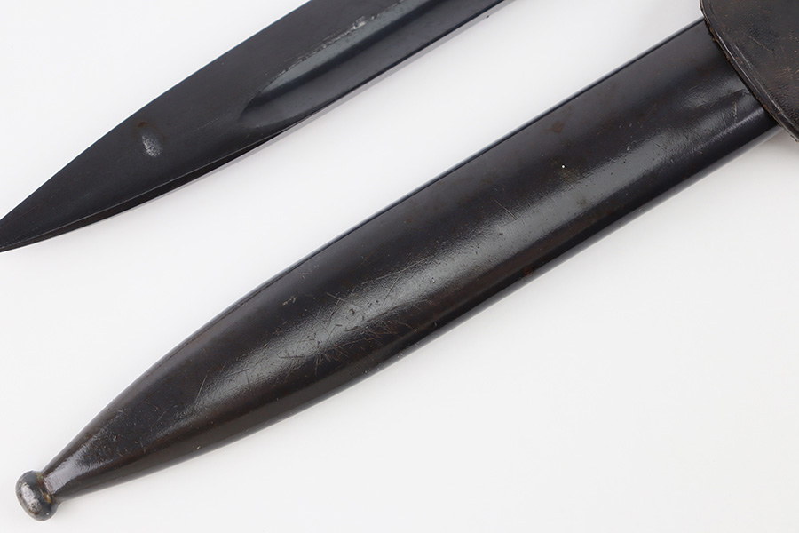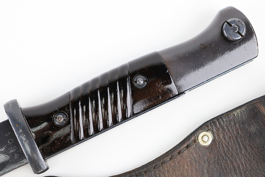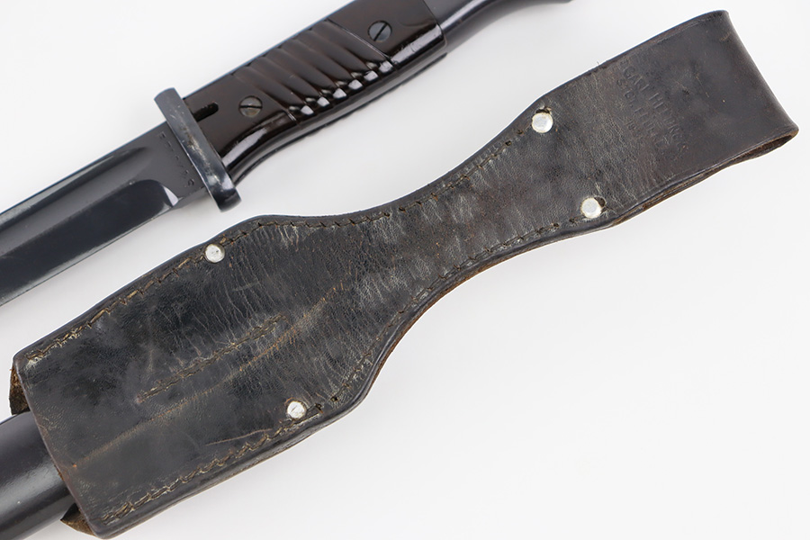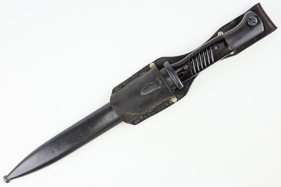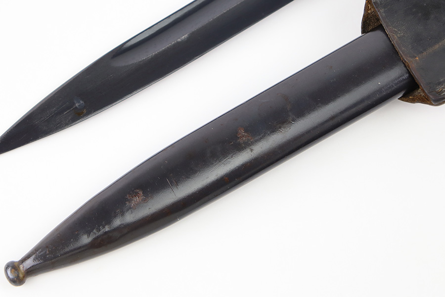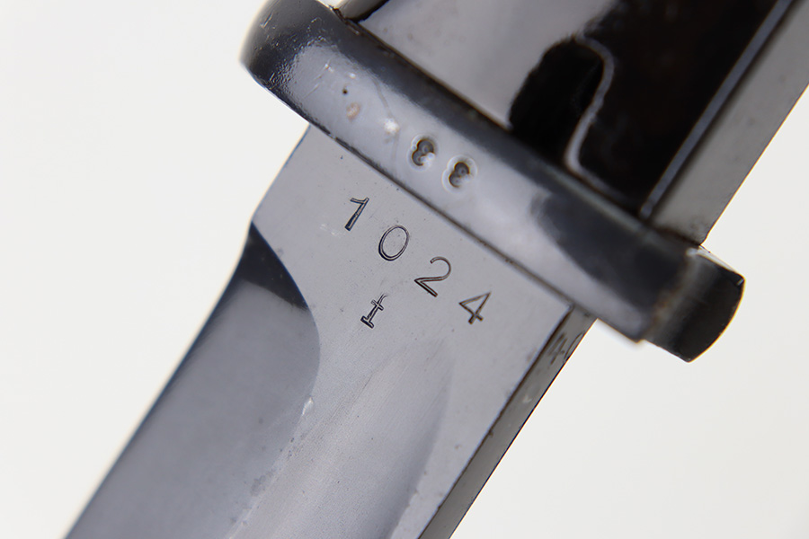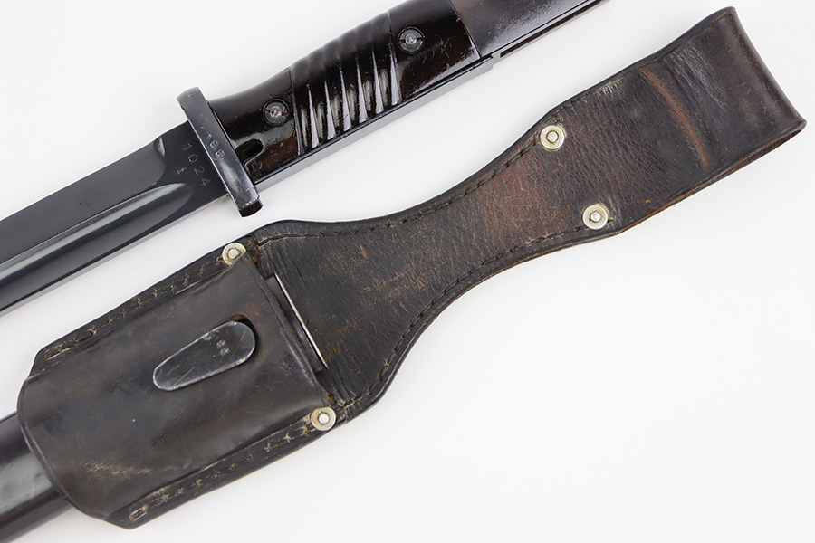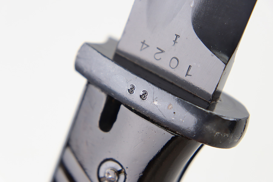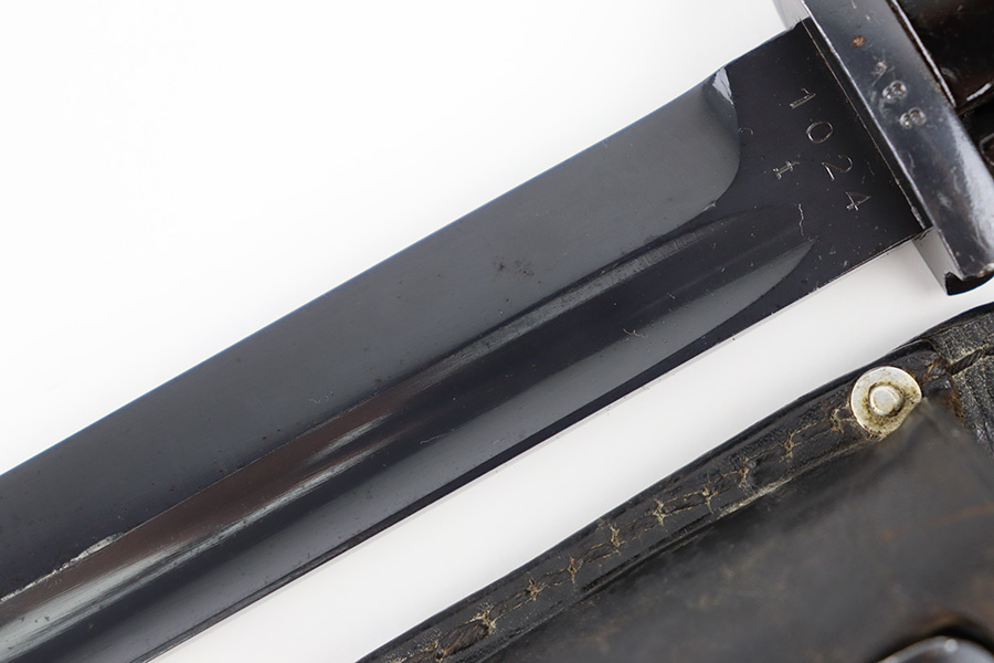 10/10/23 – This is an excellent condition K98 bayonet with a matching numbered scabbard and leather frog. The bayonet blade is excellent with minimal finish loss and some mild brown speckling patina throughout. Serial numbered on one side, and maker stamped on the other side of the ricasso. The spine of the blade is “40” dated. The cross guard is stamped “33”, as is the knob on the front of the scabbard (we’re not sure the significance). The handle has no cracks or chips, and the pommel has mild patina throughout and thinning of the finish, but most of the original bluing is intact. The scabbard is excellent as well with minimal patina and no dents or major issues. The leather frog is maker stamped and 1939 dated on the backside, as shown. A very nice high-end example.